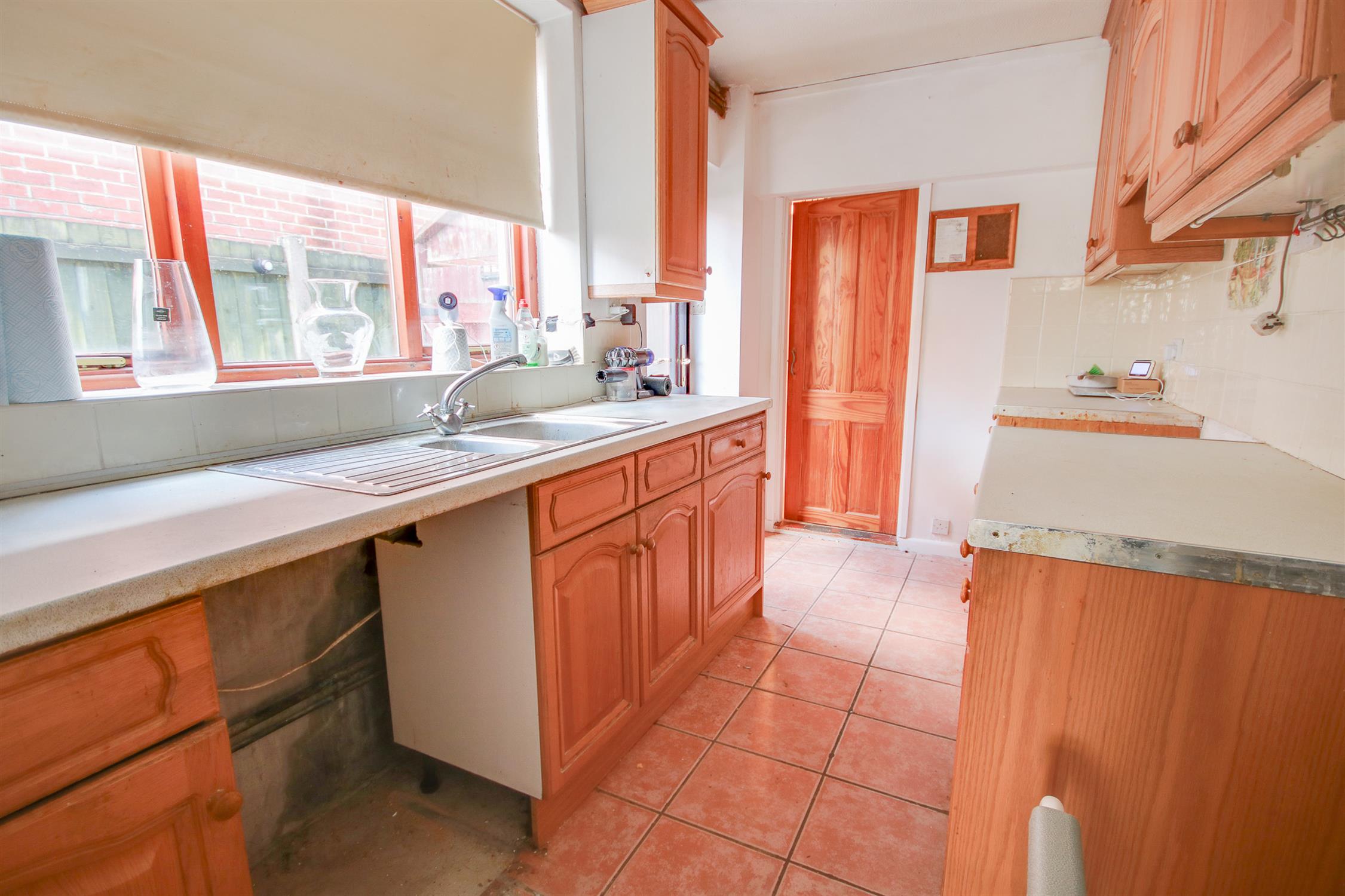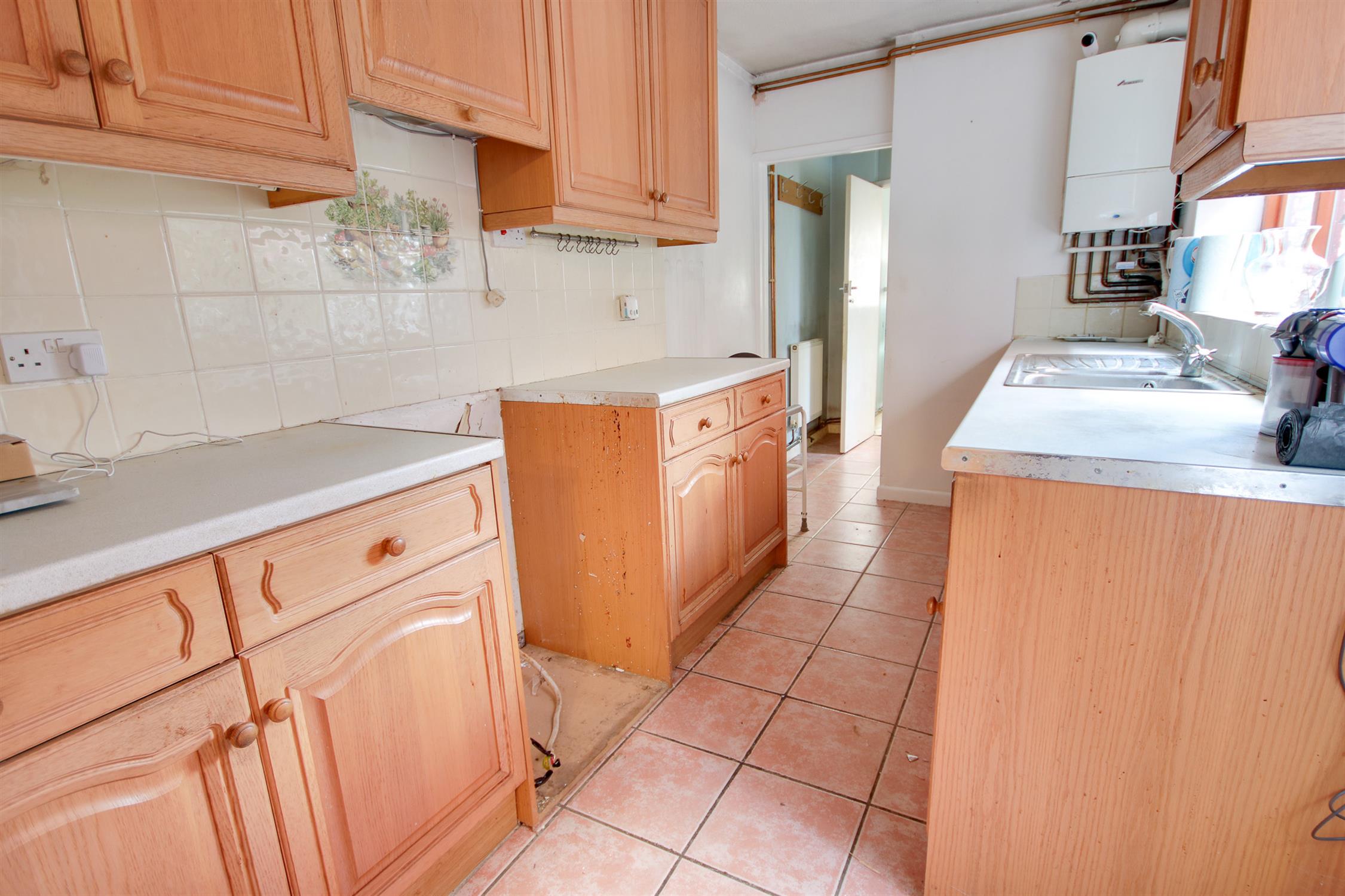 Textured ceiling, double glazed window and door to side, wall base and drawer units with work surface over, bowl and a half stainless steel sink with drainer, wall mounted gas boiler, space for appliances, tiled floor.