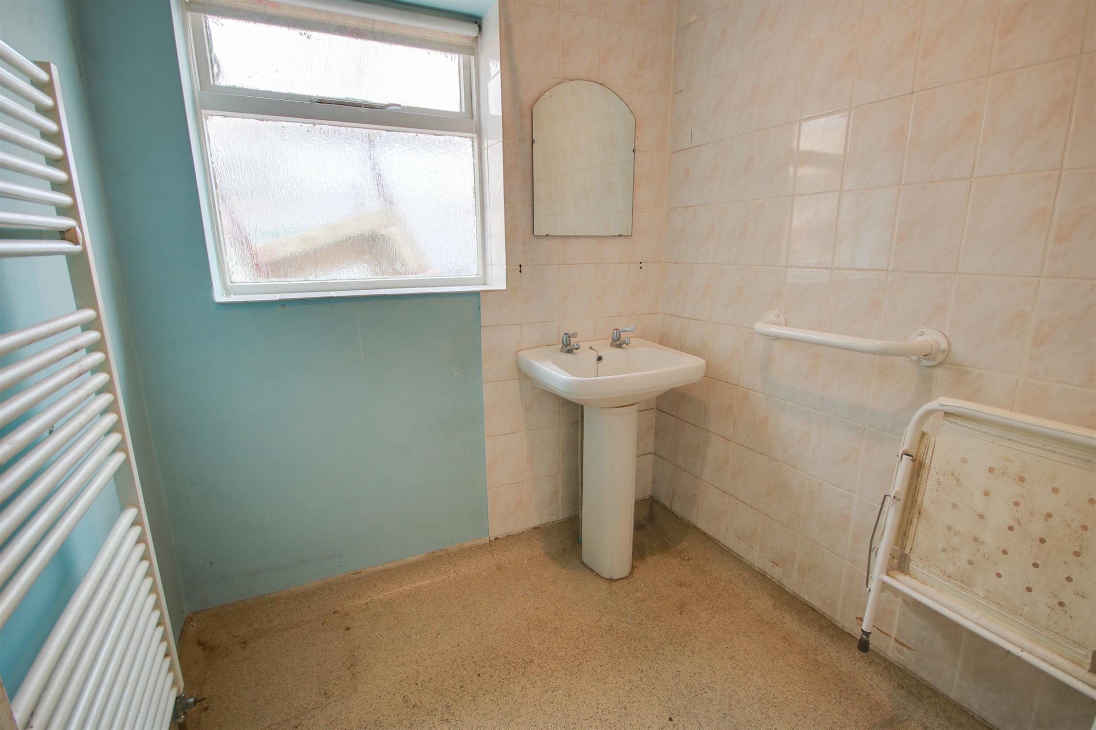 Textured ceiling, extractor fan, window to rear, electric shower, wash hand basin, heated ladder towel rail.