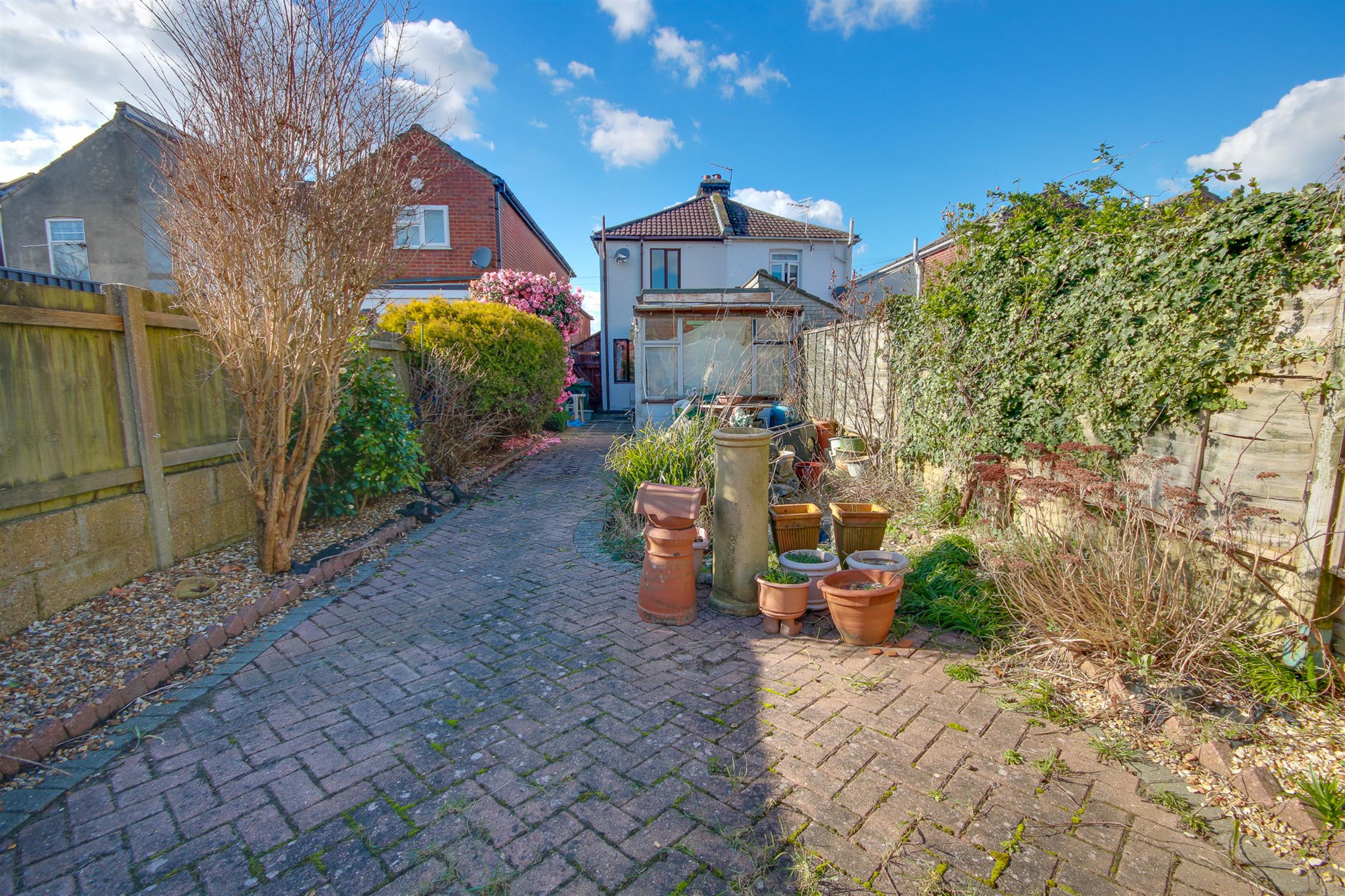 Fence enclosed rear garden, majority paved with border, Green house, gated side access.