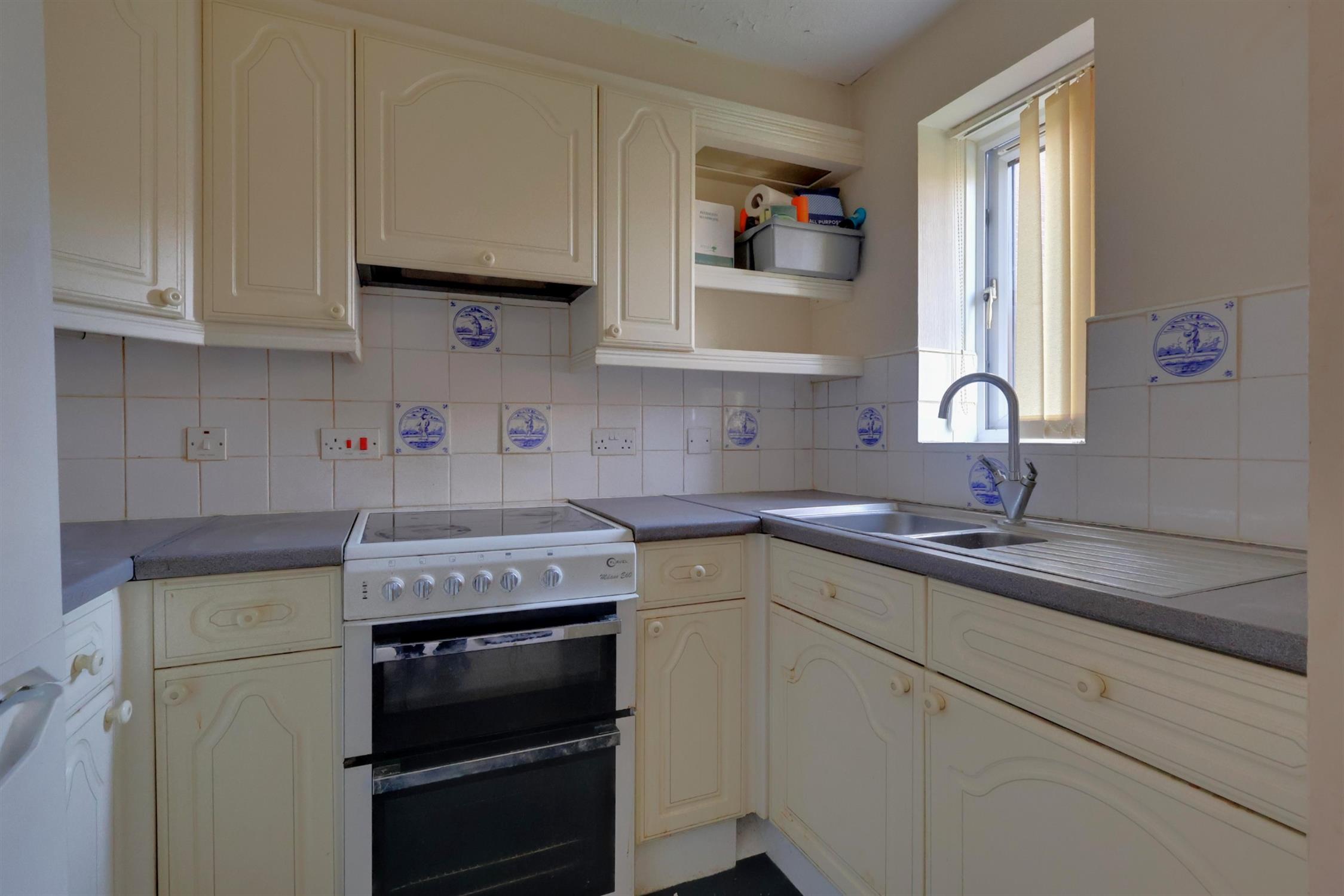 Work surface with cupboards and drawers beneath with matching wall mounted units, tiled splash backs, fitted oven, inset sink and drainer with mixer taps over, space for fridge/freezer, double glazed window to the rear aspect, textured ceiling.