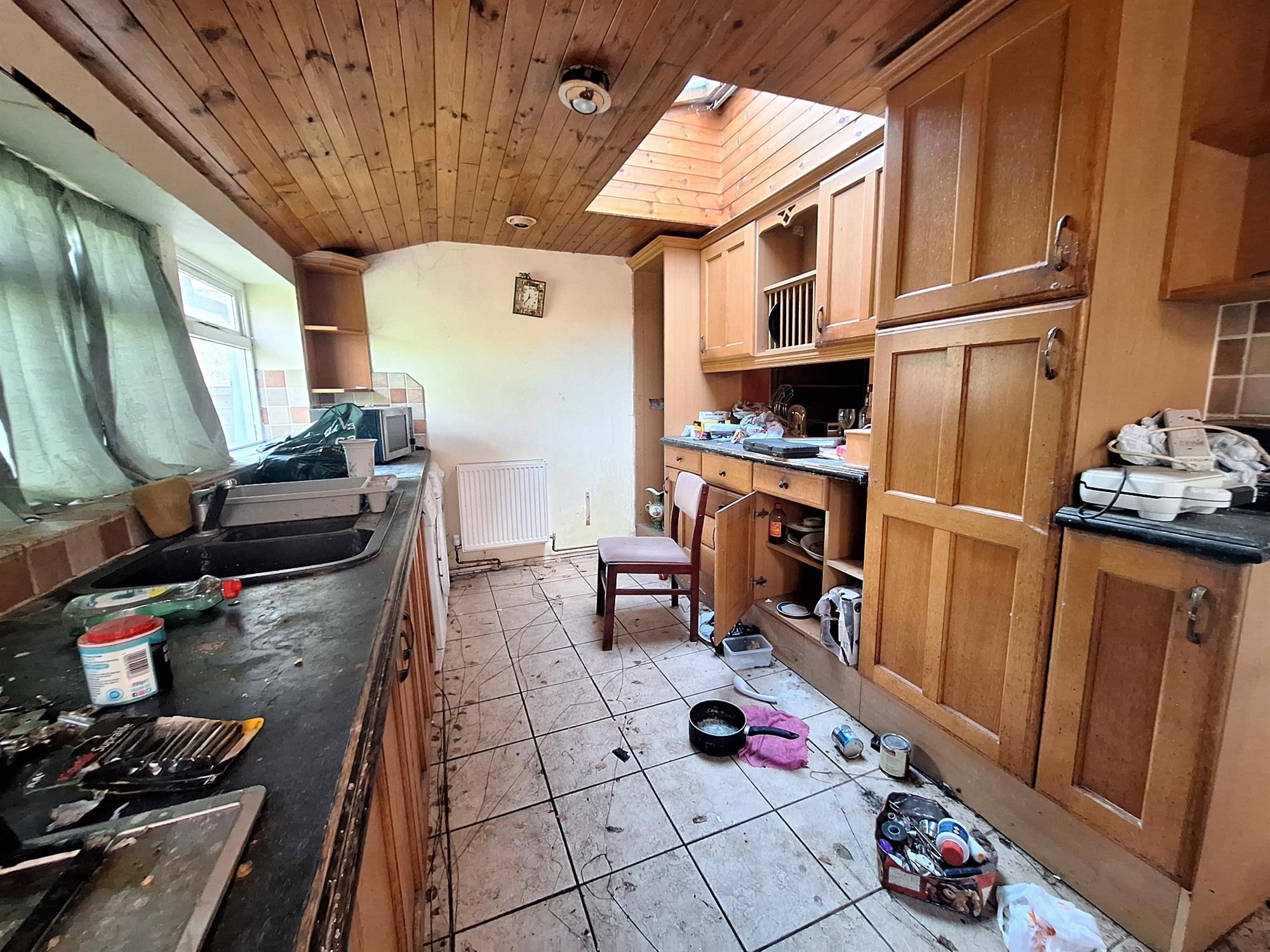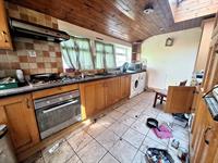 Range of eye and base level units, integral oven with gas hob, extractor over, space for washing machine and dishwasher, radiator, tiled flooring and tiled splash back, wood panelling to ceiling, Velux window, back door to garden.