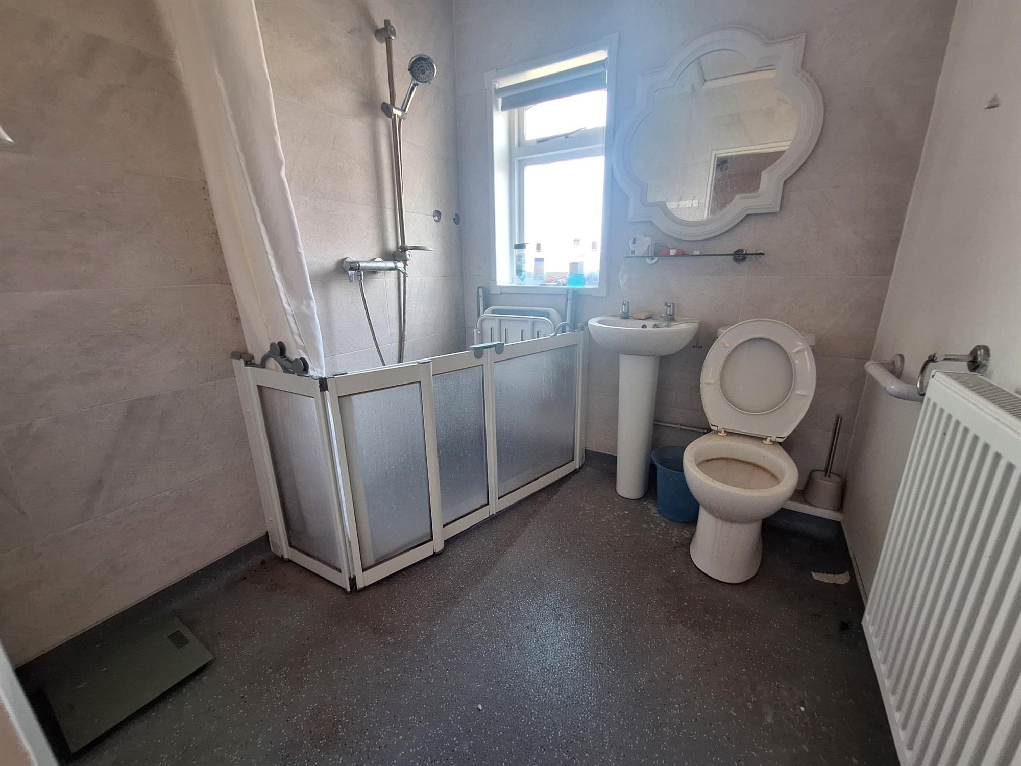 Shower room with low level WC and ceramic sink with chrome taps, Lino flooring, double-glazed frosted window to rear aspect and tiled walls.