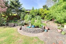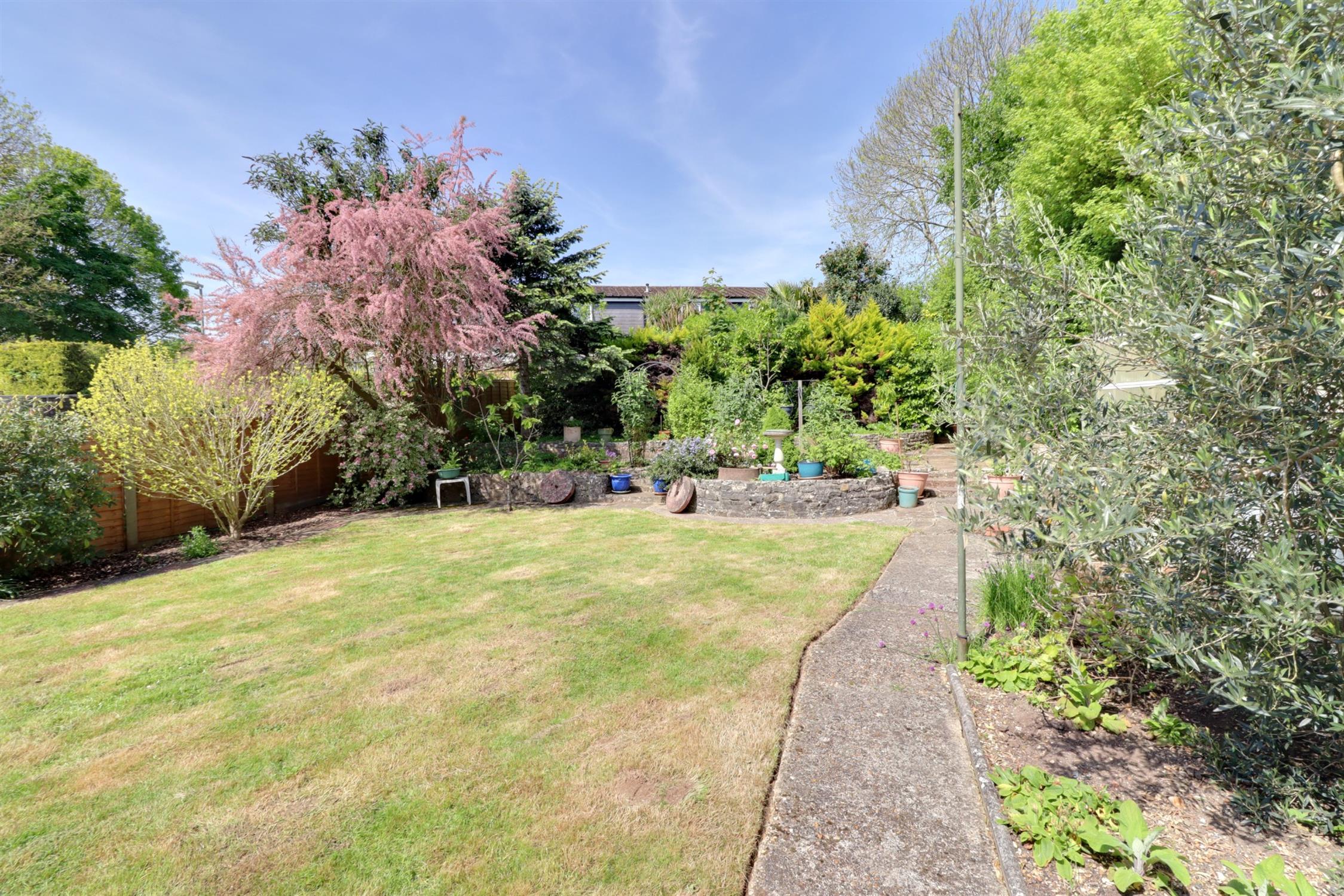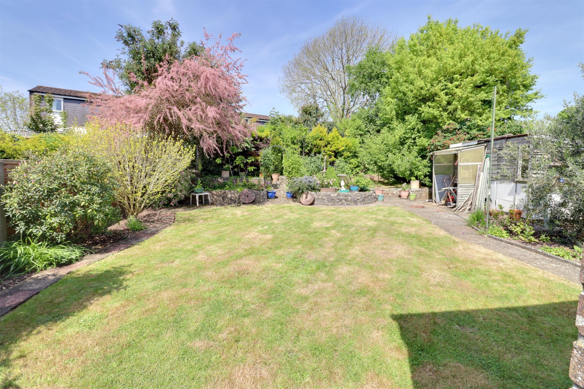 Approx. 60 ft long, enclosed, mainly laid to lawn, paved patio area, gated side access, external tap, raised steps to paved areas with planted borders, mature shrubs and trees, timber shed.