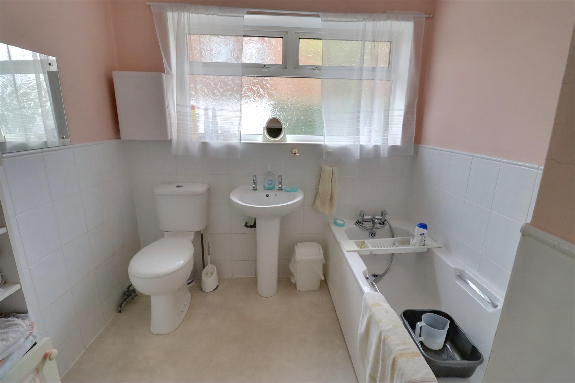 Opaque double glazed window to side, panel enclosed bath with mixer tap shower attachment, pedestal wash hand basin, WC, half height tiled walls, radiator.
