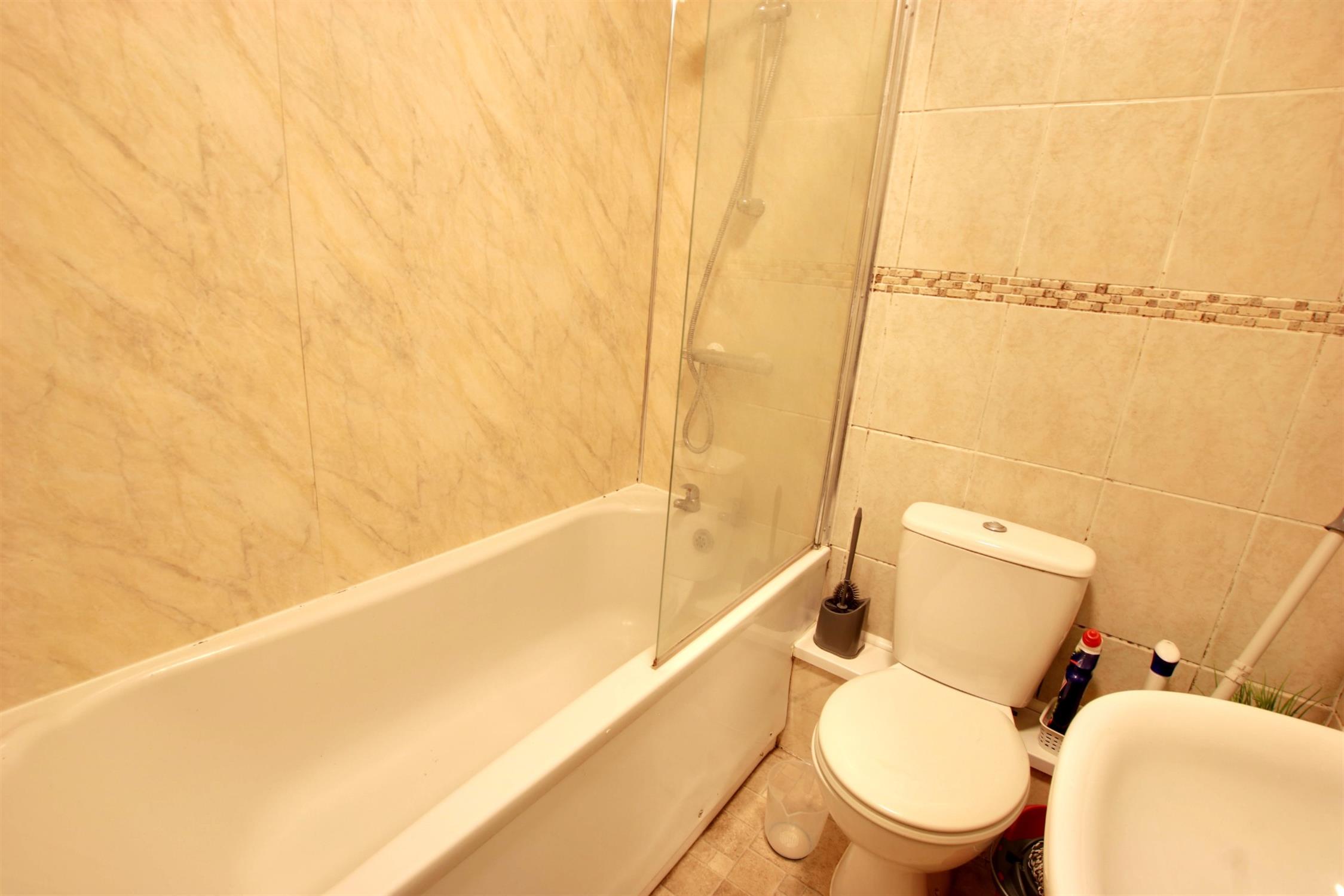 Smooth ceiling. Extractor. Pedestal sink with mixer tap, low level flush w.c. and panel enclosed bath with mixer tap shower attachment. Heated towel rail. Tiled walls.