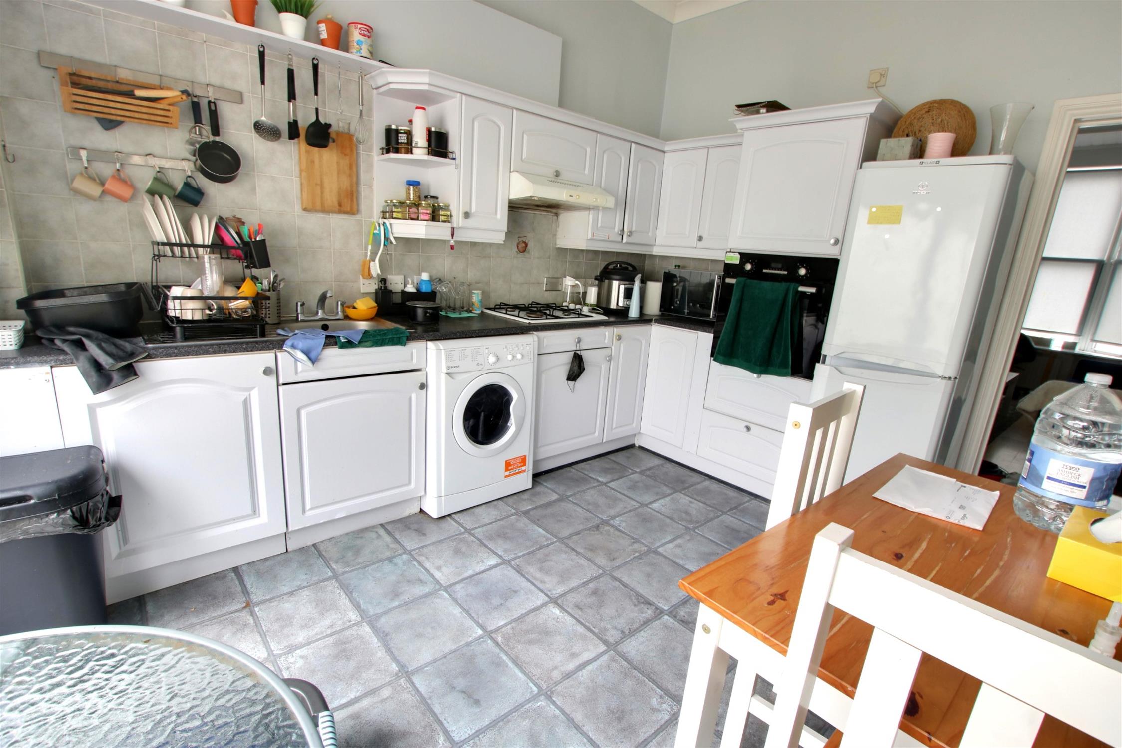 Double glazed sliding doors opening onto the garden. Smooth ceiling. Single drainer one and a half bowl sink unit with mixer tap and cupboard under. A range of matching eye level and base mounted units with roll top work surface over. Built-in double oven with fitted four ring gas hob and extractor over. Space and plumbing for washing machine. Space for fridge/freezer. Radiator. Tiled flooring. Door to:-