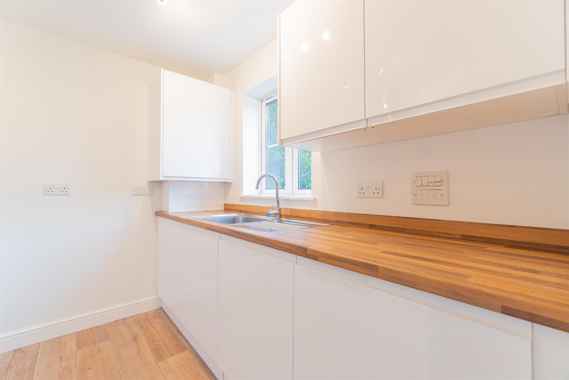 KITCHEN/DINERWindow to front. Range of wall and base units with wooden working surfaces over. sink with drainer and mixer tap.