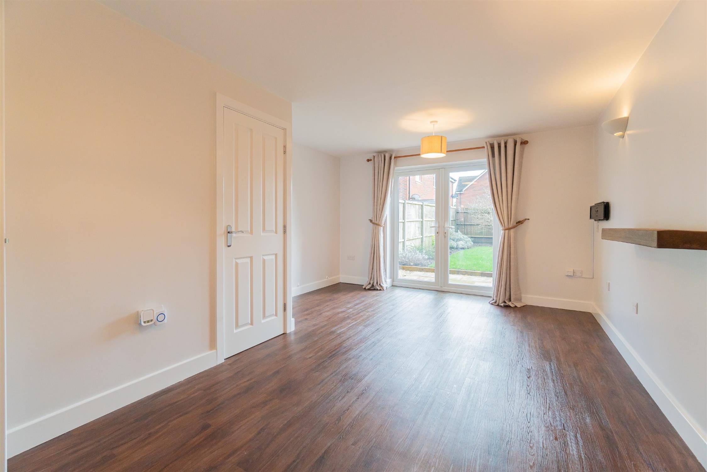 A beautiful living space with French doors to the rear garden. Wall hung television point. Under stairs storage. Hardwood flooring laid to floor.