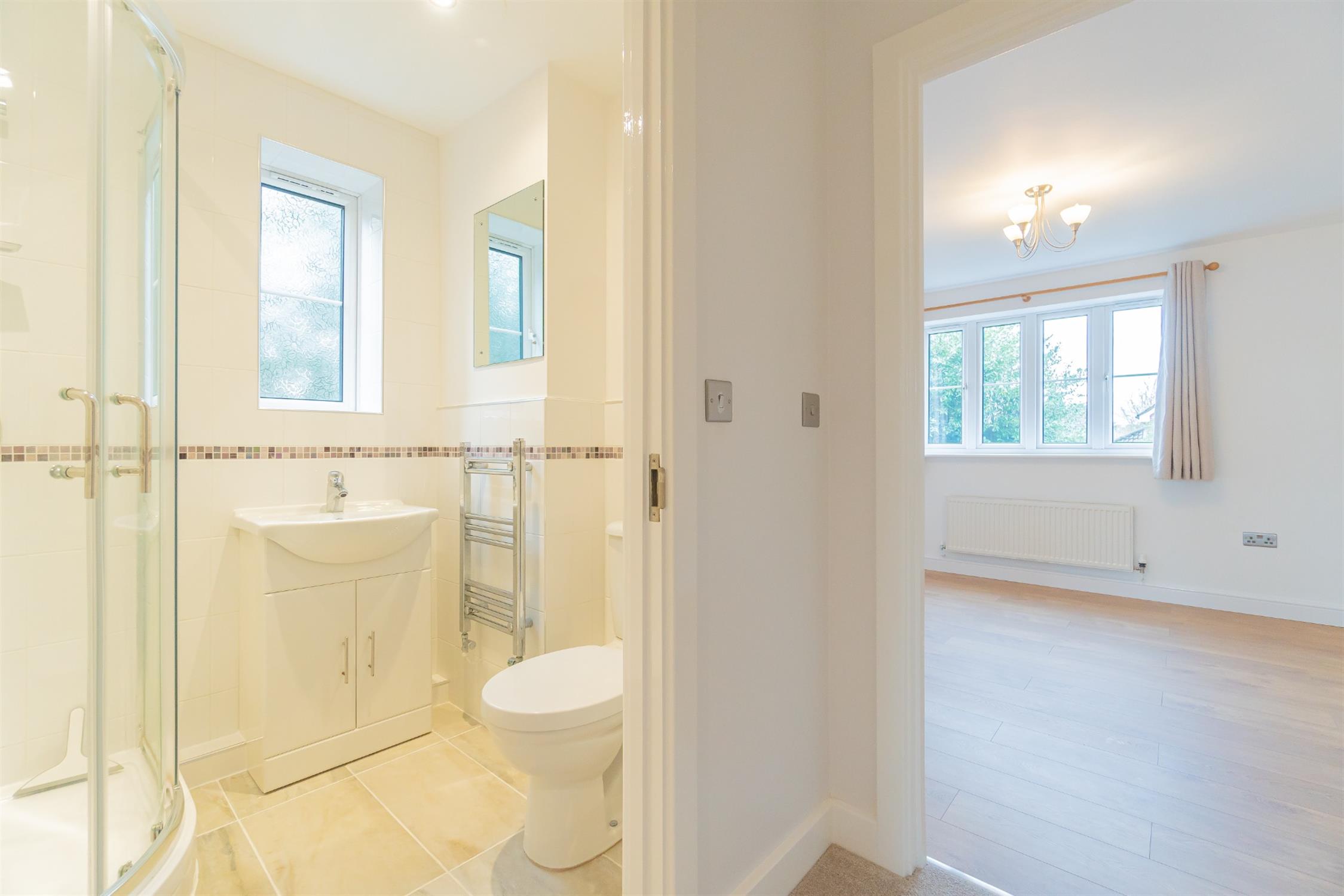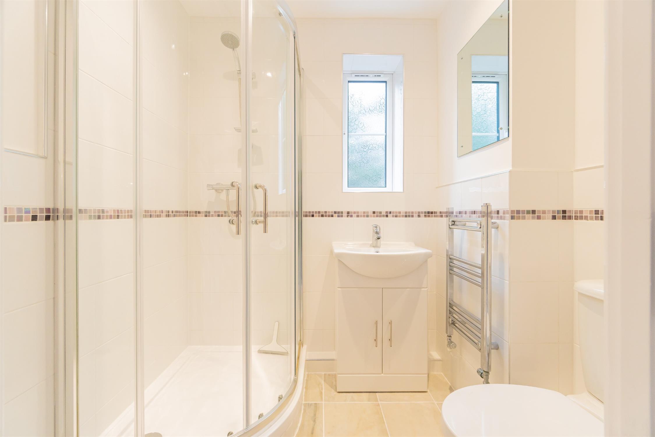 Window to side, low level WC. Mains powered shower. Wash hand basin with cupboard below and complementary tiling. Heated towel rail. Tiled to floor.