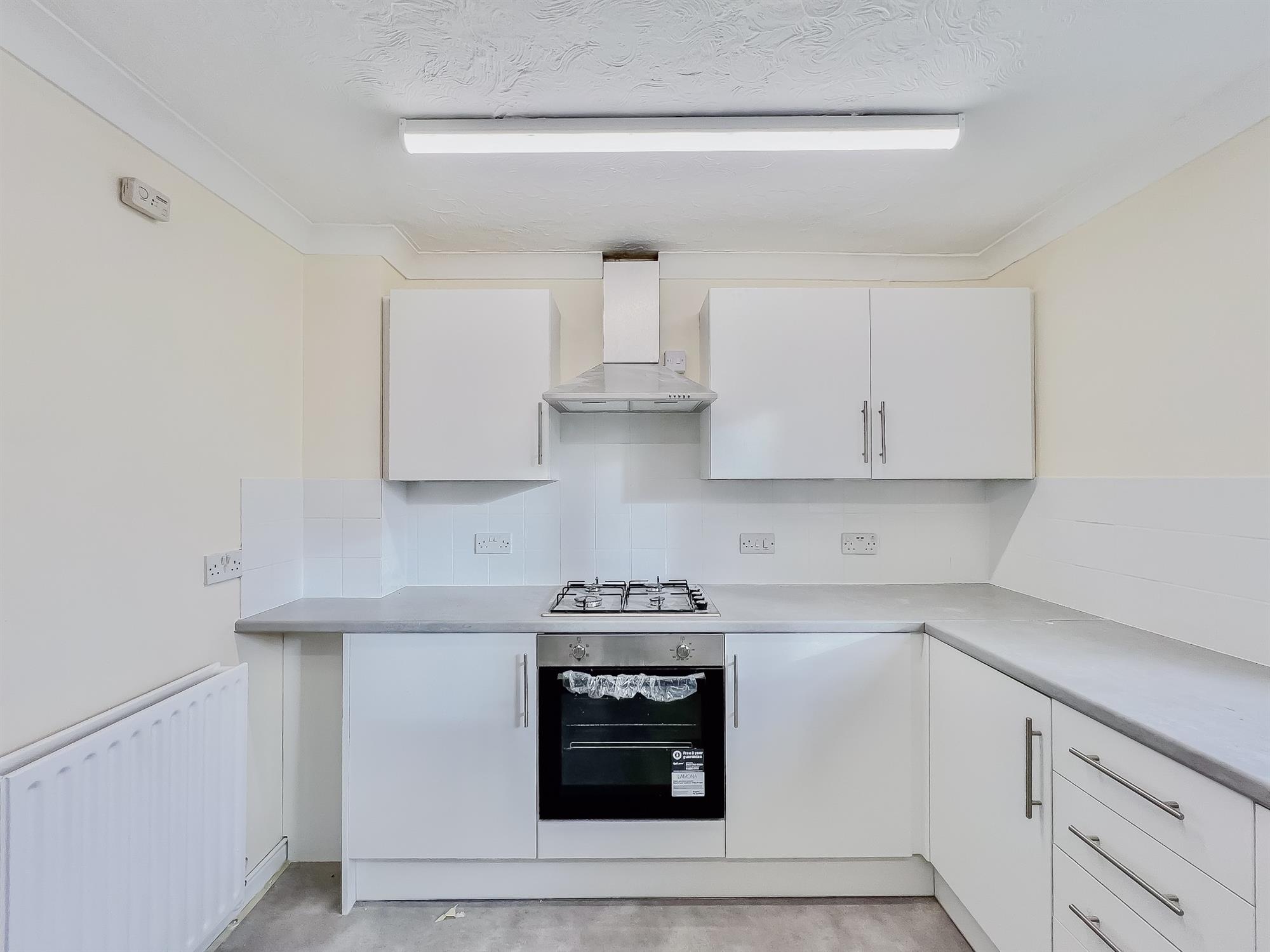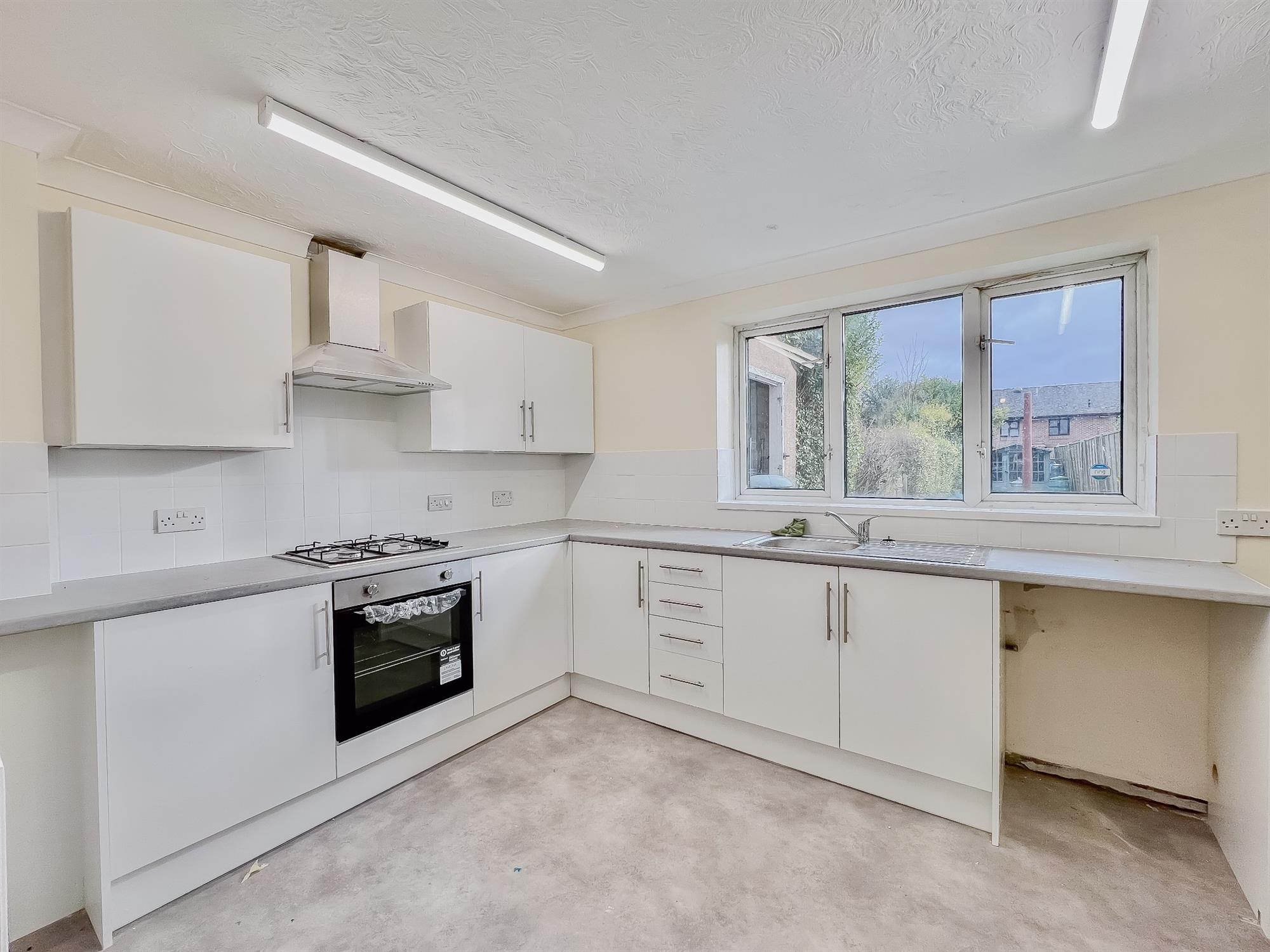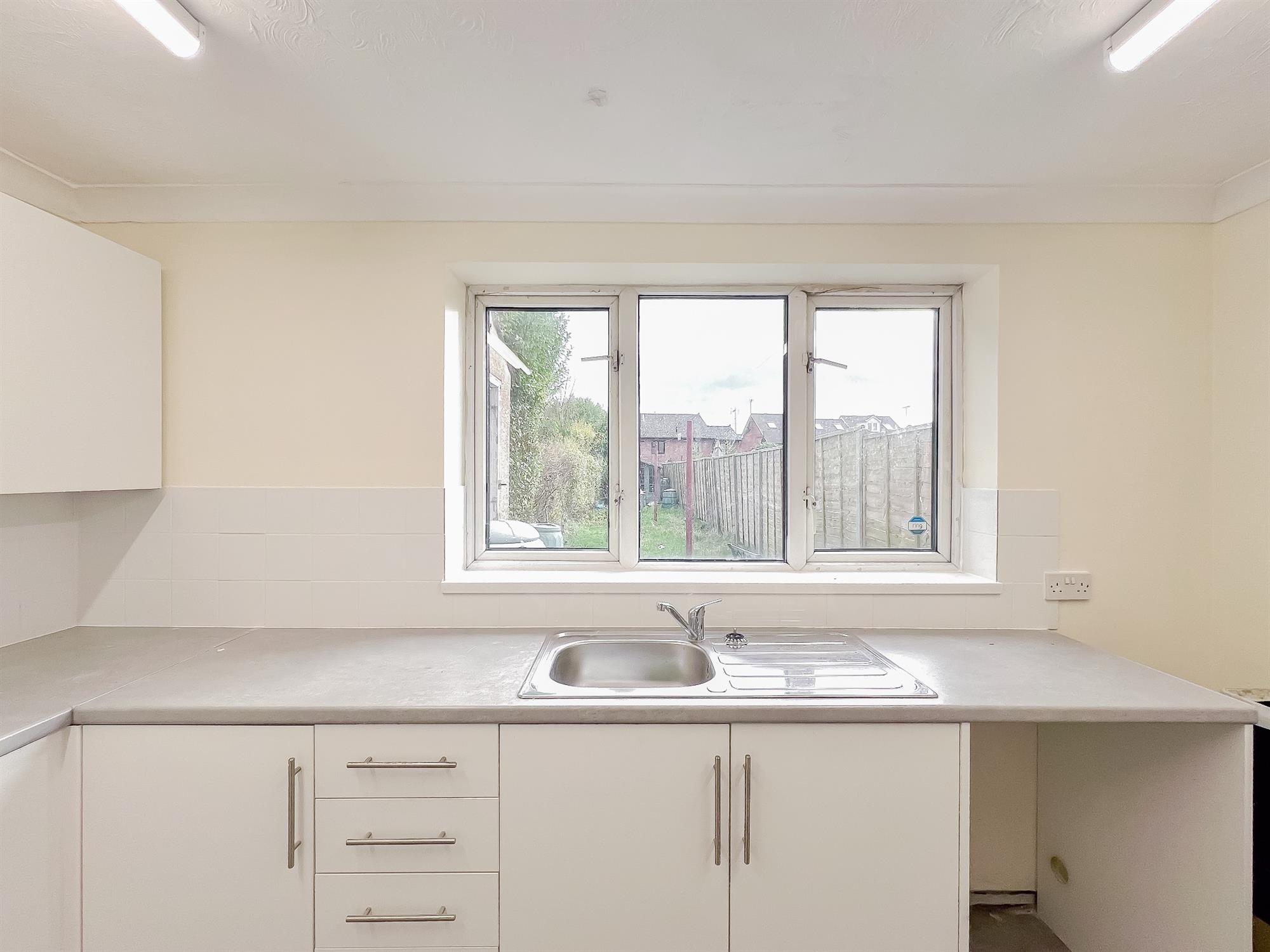 A fully refurbished kitchen. Complete with oven, gas hob and extractor. Stainless steel sink and dryer rack. White tiling with space for washing machine or dishwasher. Door leading to rear garden and side path. Lino laid to floor.