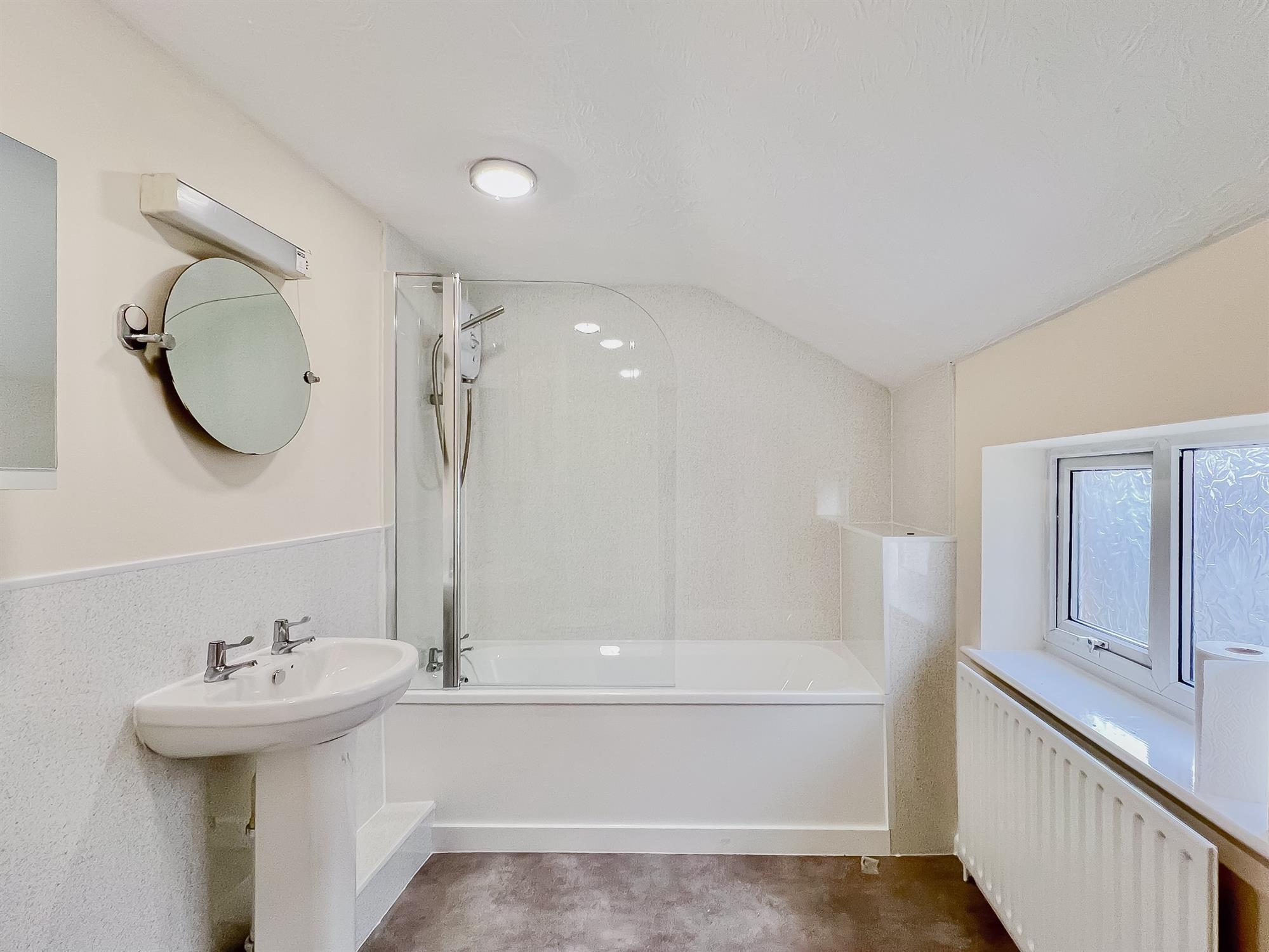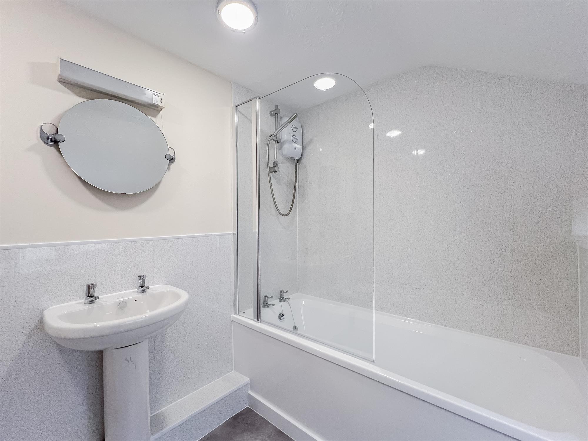 A fully refurbished bathroom complete with wash basin, toilet, bath and shower over bath. Mirrors over basin and toilet. Lino laid to floor.
