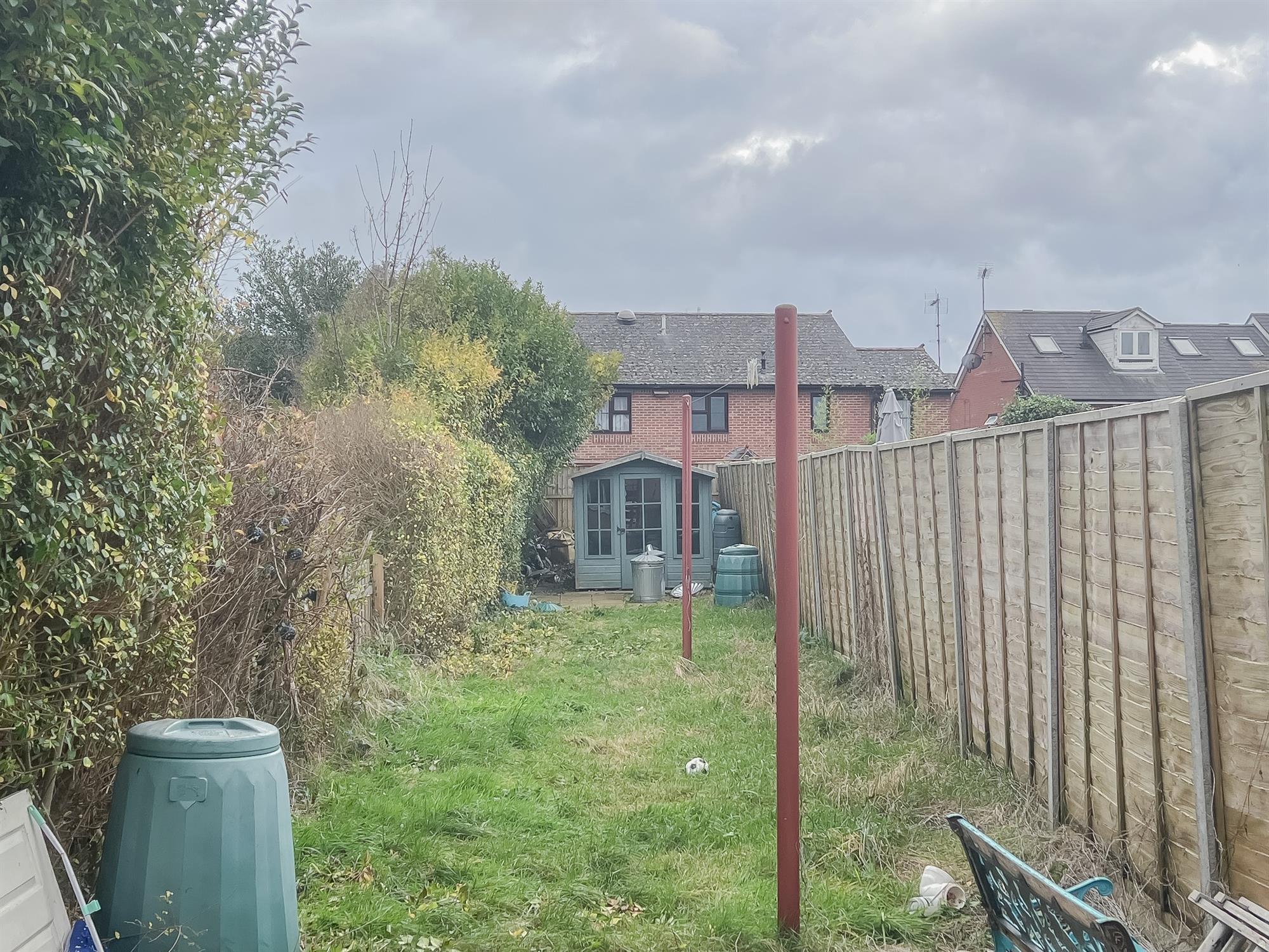 A very large and sunny rear garden. Concealed with fencing and bushes with summer house at the rear. Small paving patio and grass lawn. Access to side gate.