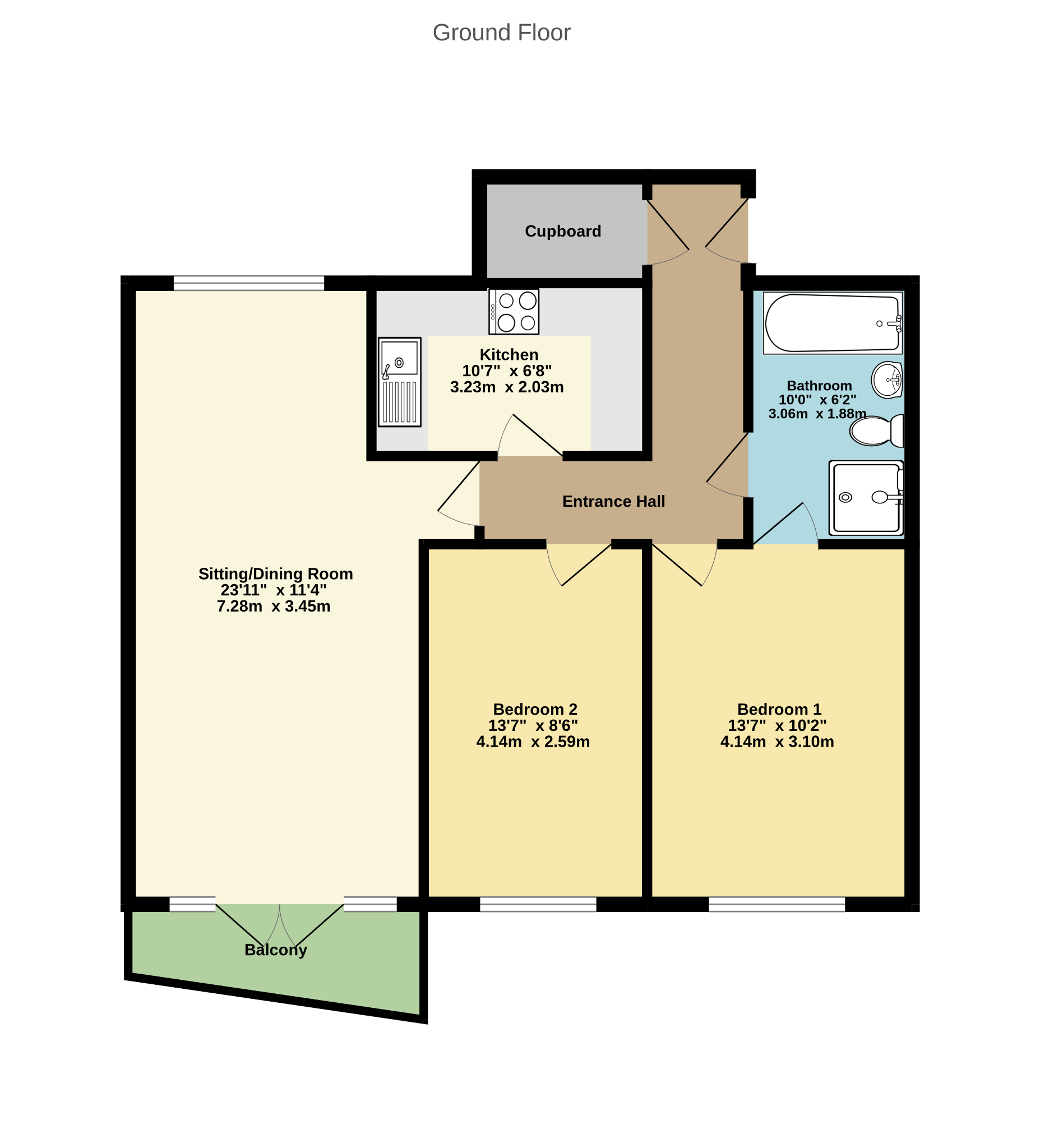 Doors to all rooms. Walk-in storage cupboard. Wall mounted combination boiler. Tiled flooring.
