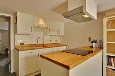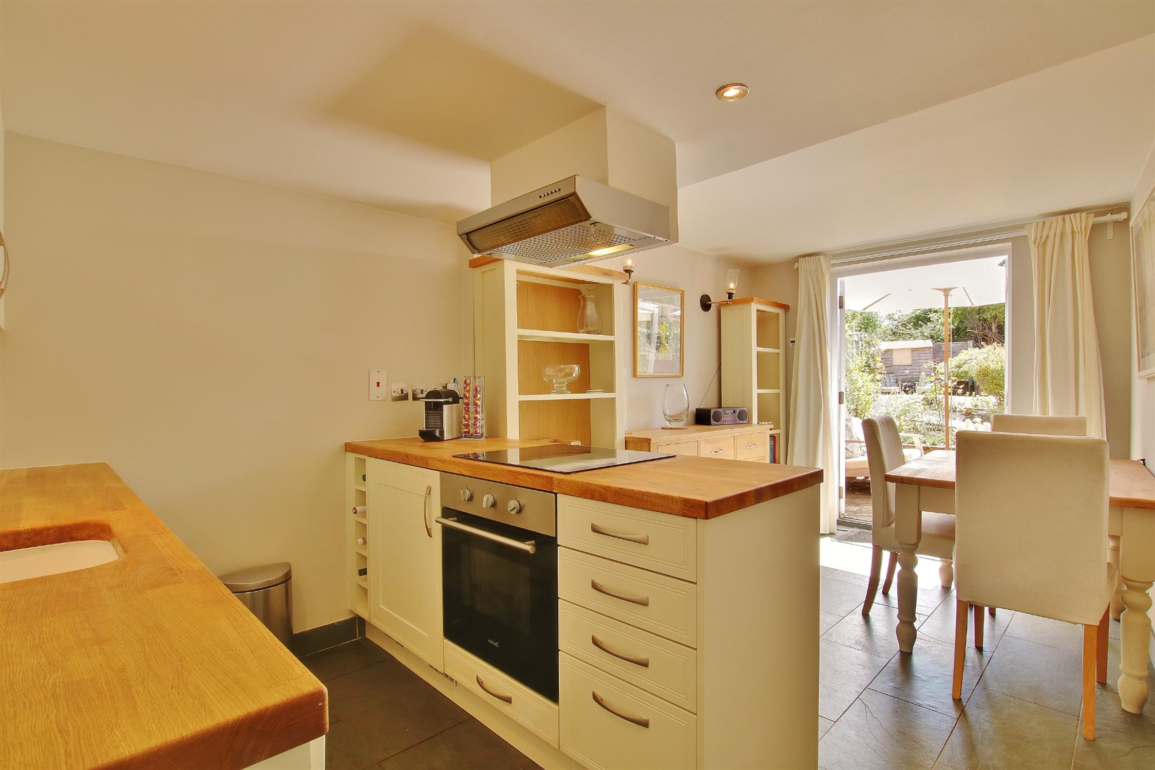 Beautifully fitted with an attractive range of modern wall and base units, with solid wood worktops and inset sink with mixer tap over. Built-in electric oven and hob with extractor hood over, dishwasher, plumbing for washing machine, slate tiled floor, radiator, French doors to the patio and rear garden.
