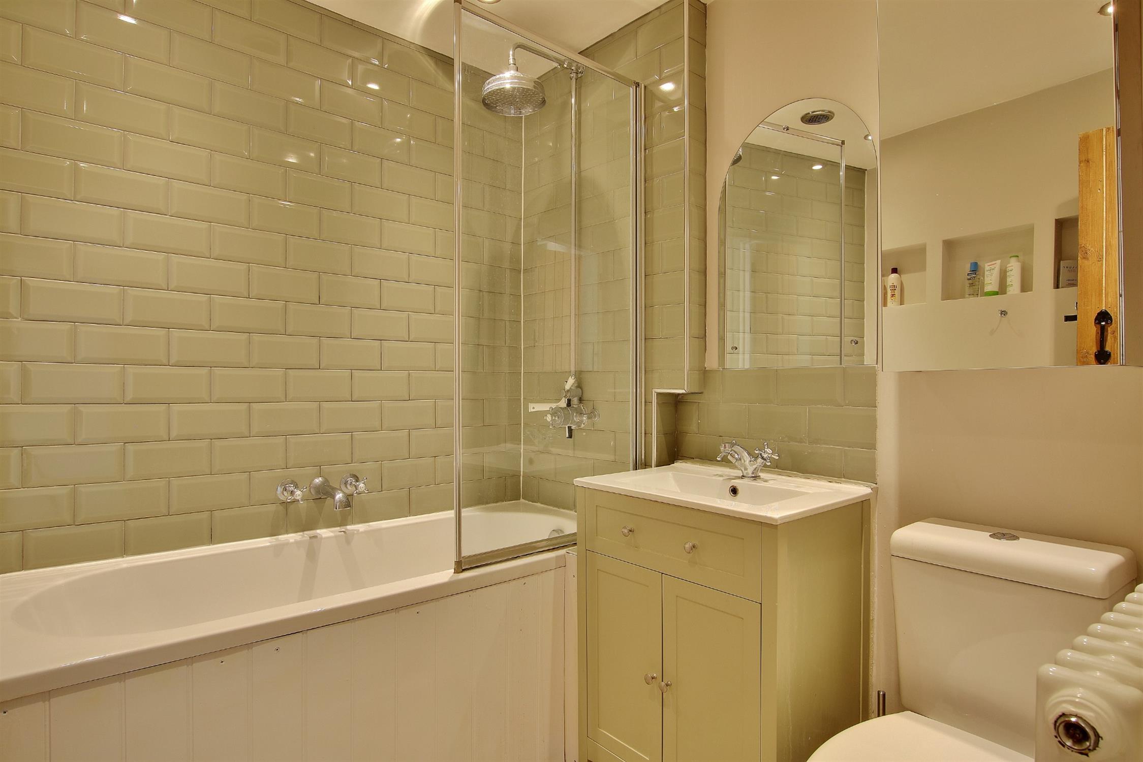 Attractively fitted with a contemporary suite in a period style comprising panel enclosed bath with shower over and shower screen, vanity unit with inset sink with mixer tap, low-level WC, a Victorian-style radiator, extractor fan, part-tiled walls.