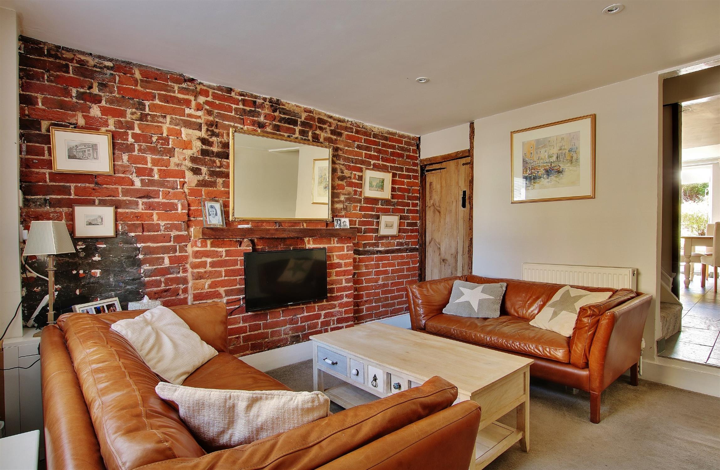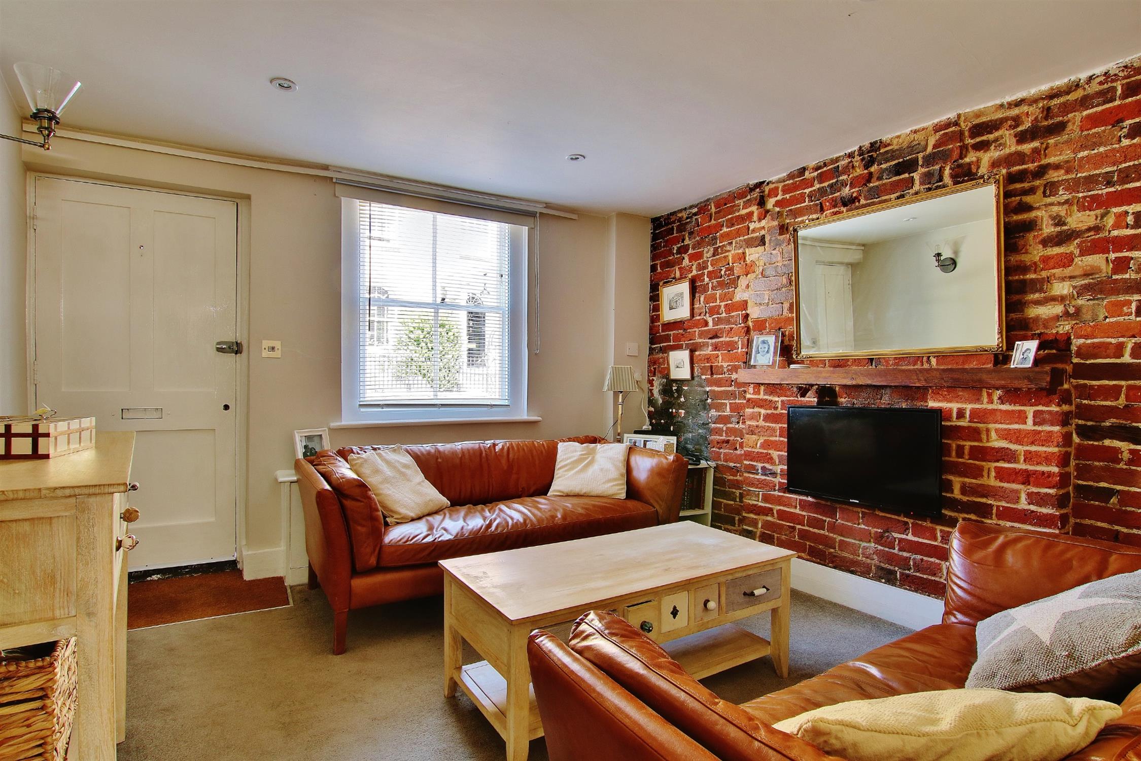 Feature exposed brick wall with oak mantelpiece, sash window to the front, radiator, under stairs cupboard, opening to:
