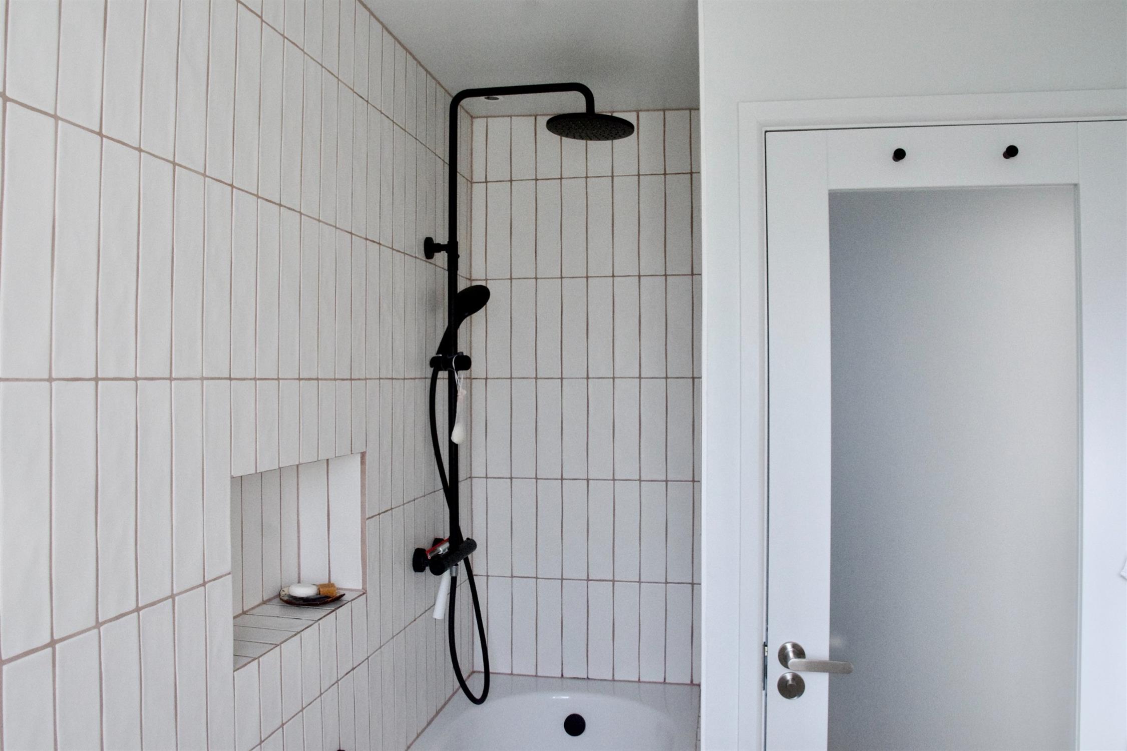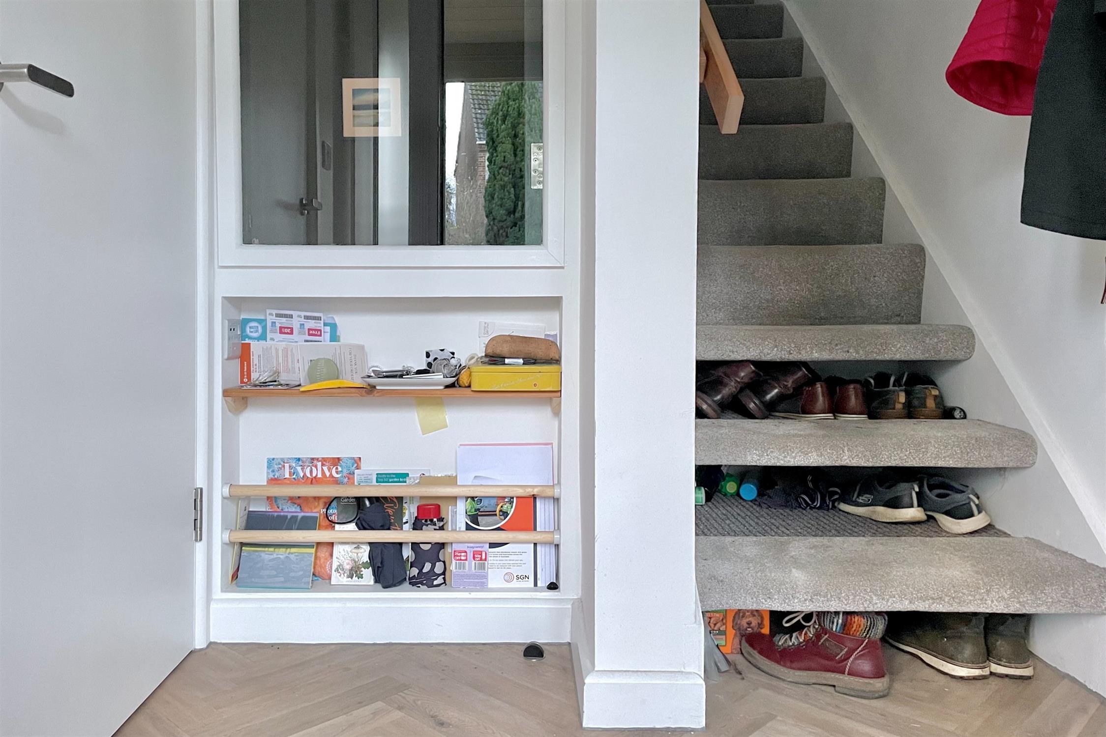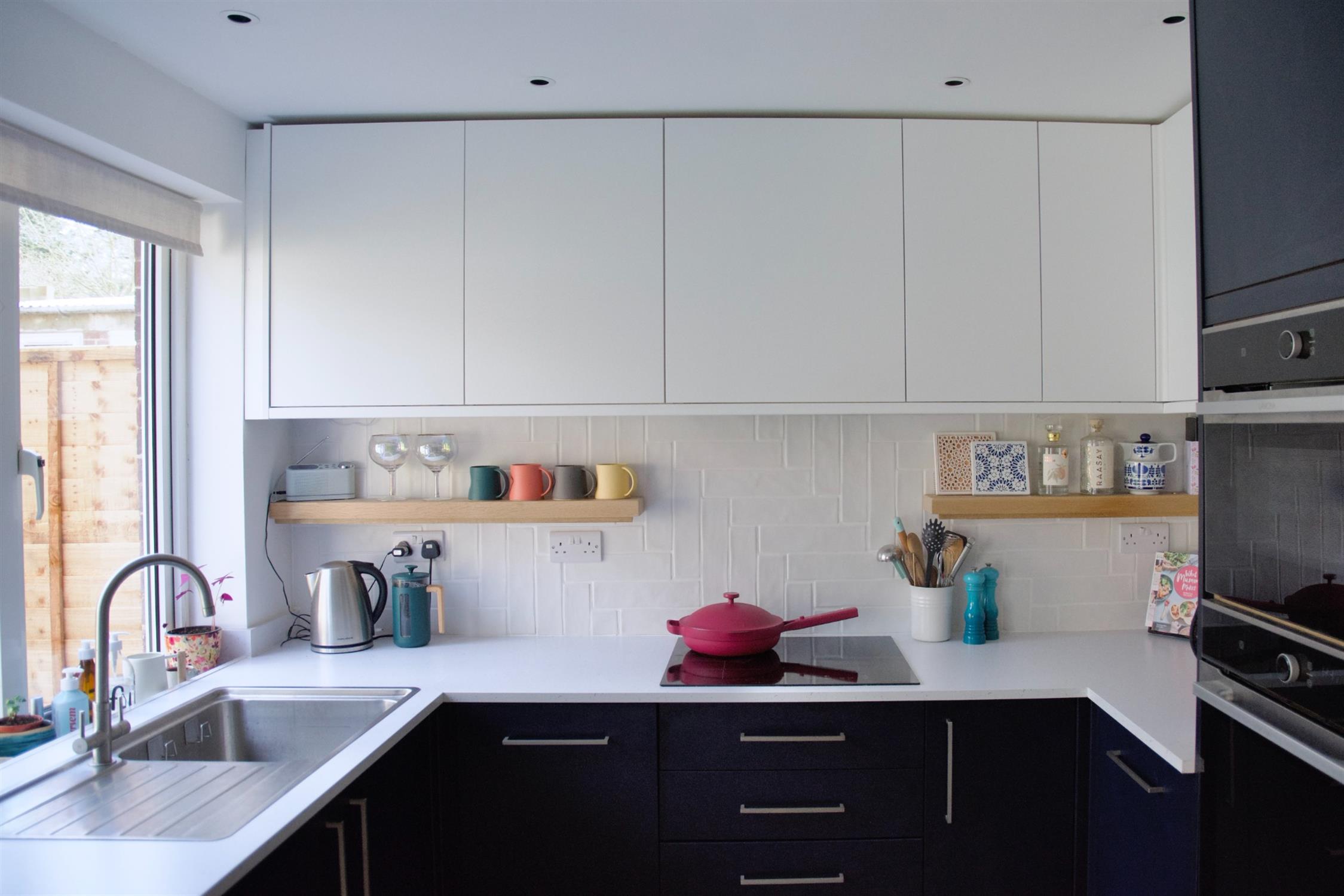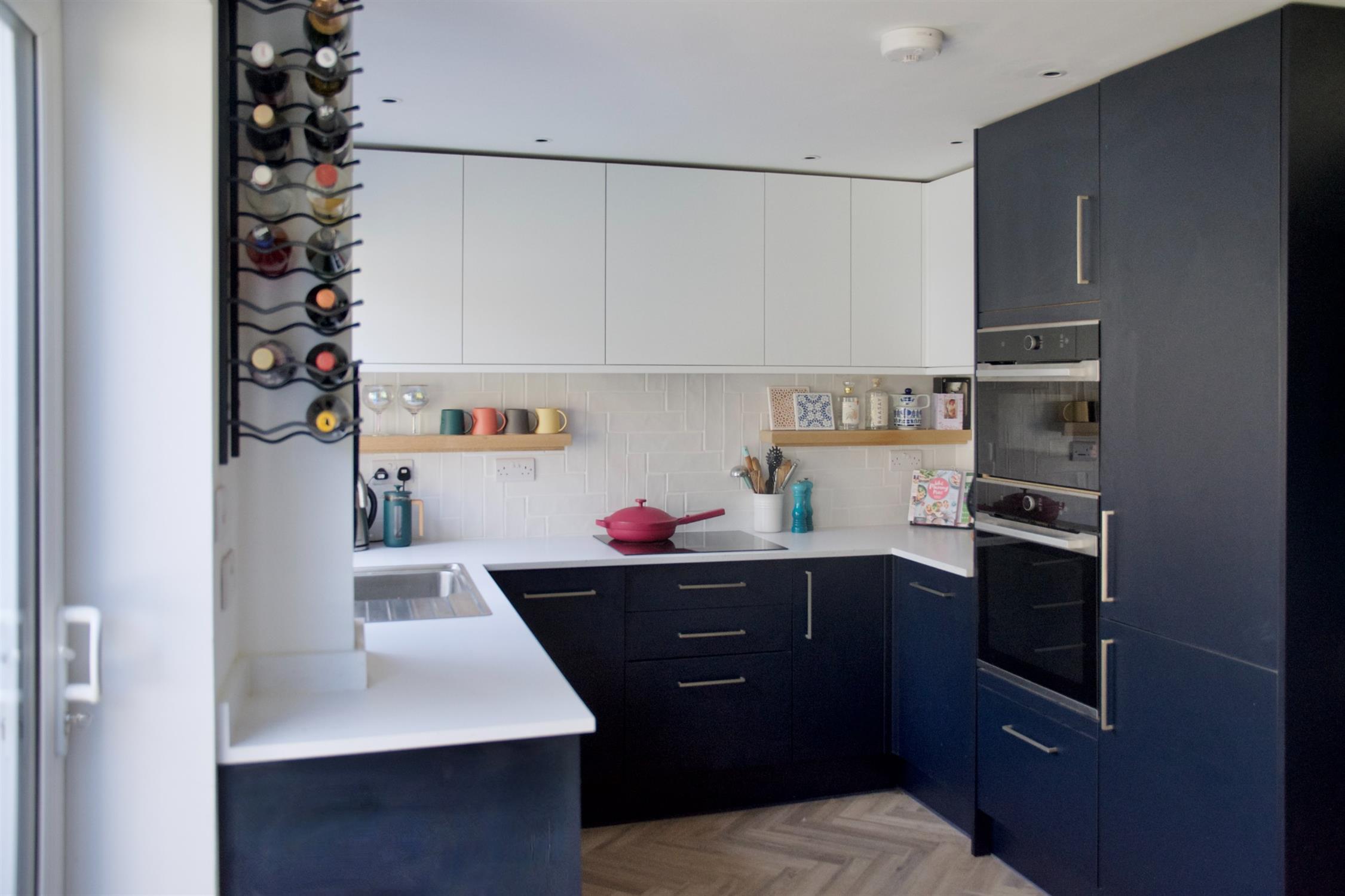 The ground floor comprises of a timber porch which leads to the entrance hall with stairs rising to the first floor and a door to the living room. There is also a window through to the living room for extra light, and clever shoe storage in the stairs. The living room is a good size, with a large-format sliding door to the kitchen-diner. There is a new fireplace and bespoke shelving and storage. The kitchen is a very classic monochrome style, with two zones of accent lighting and some stylish storage features. There is space for a table and chairs and double doors into the garden.