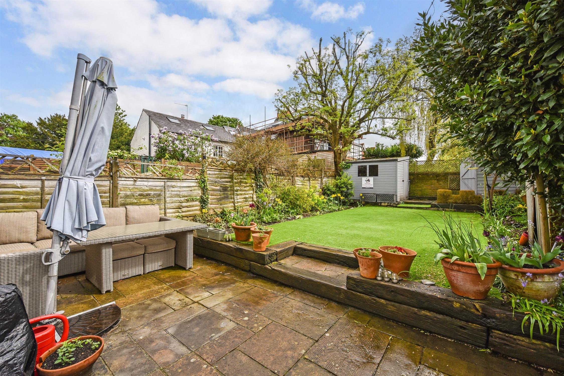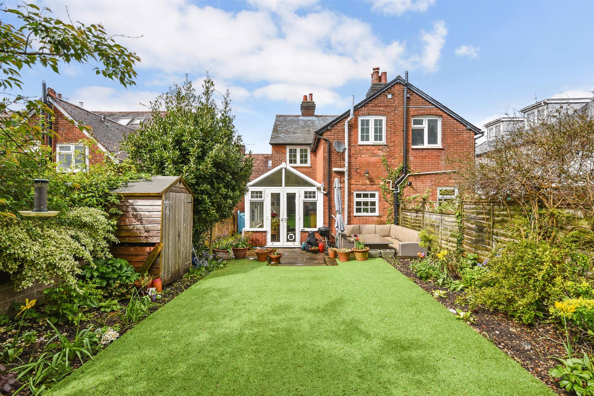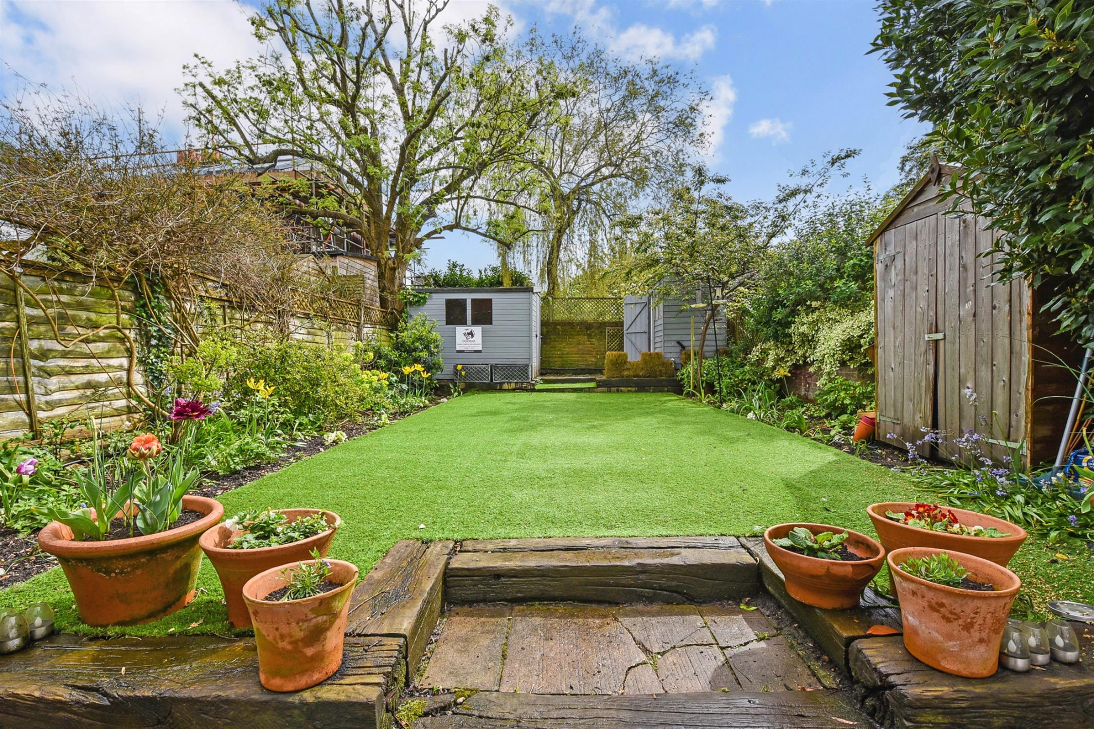To the rear, the garden is very pretty indeed and benefits from a warm southerly aspect. It is fully enclosed and can be accessed via the garden room and also by a gate to the side. There is a good size patio seating area and steps leading up to the artificial lawn which is bordered by mature shrubbery and flower beds. The owner currently runs a dog grooming business at the end of the garden. There is a salon and a wet room which are both fitted with power, light and water, and these would also work well as a studio or home office.