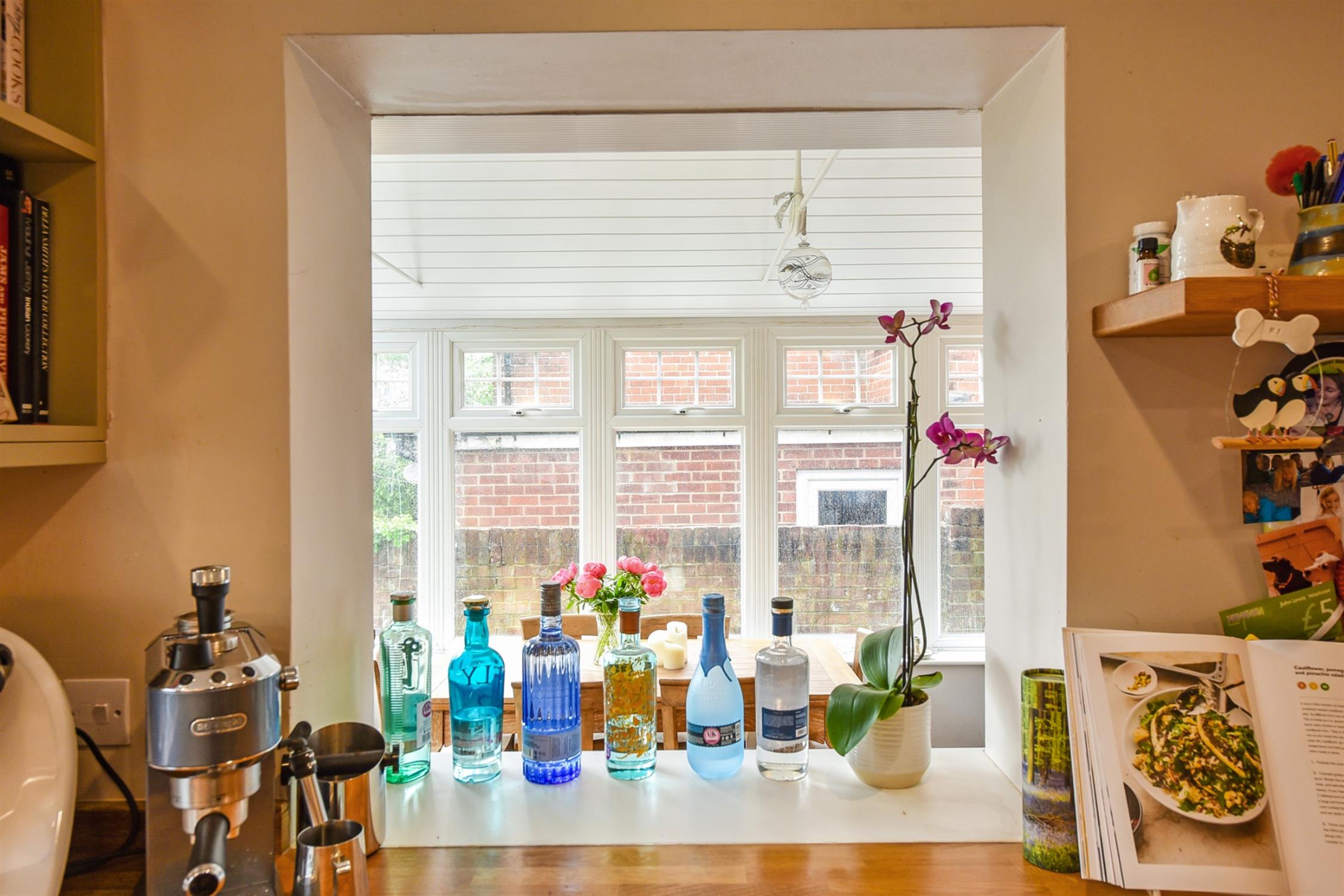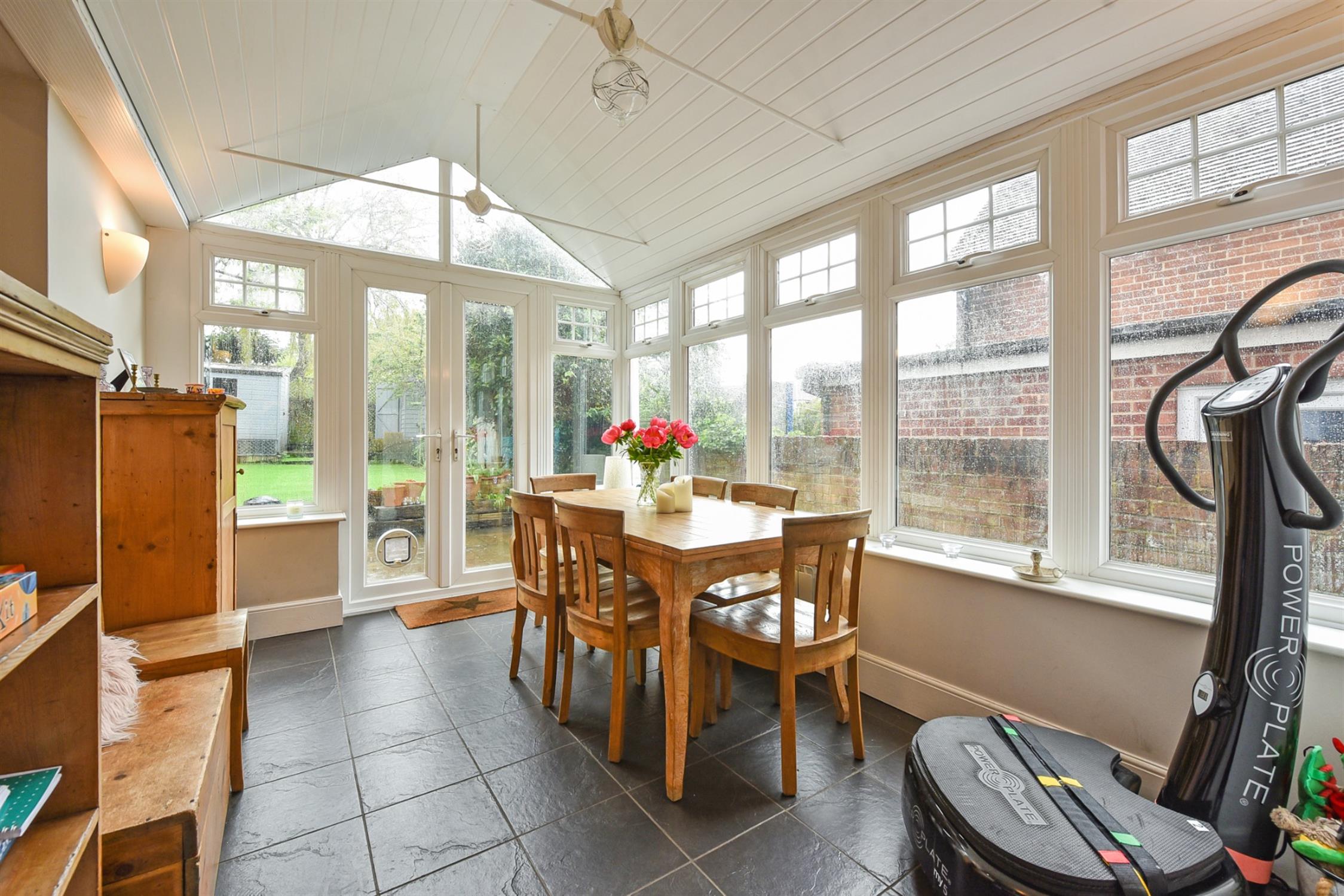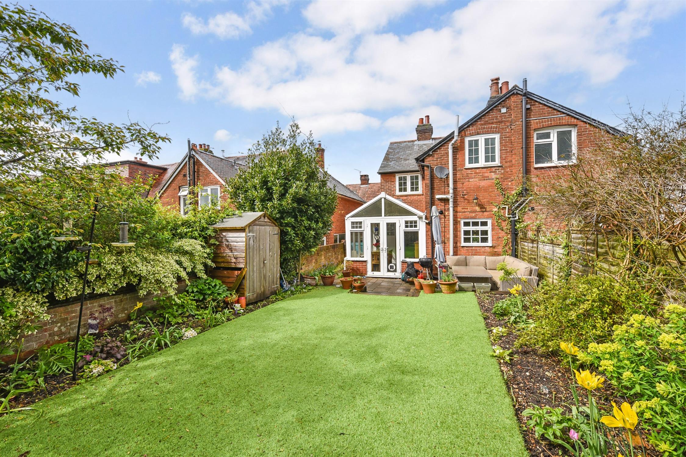 To the rear, the garden is very pretty indeed and benefits from a warm southerly aspect. It is fully enclosed and can be accessed via the garden room and also by a gate to the side. There is a good size patio seating area and steps leading up to the artificial lawn which is bordered by mature shrubbery and flower beds. The owner currently runs a dog grooming business at the end of the garden. There is a salon and a wet room which are both fitted with power, light and water, and these would also work well as a studio or home office.