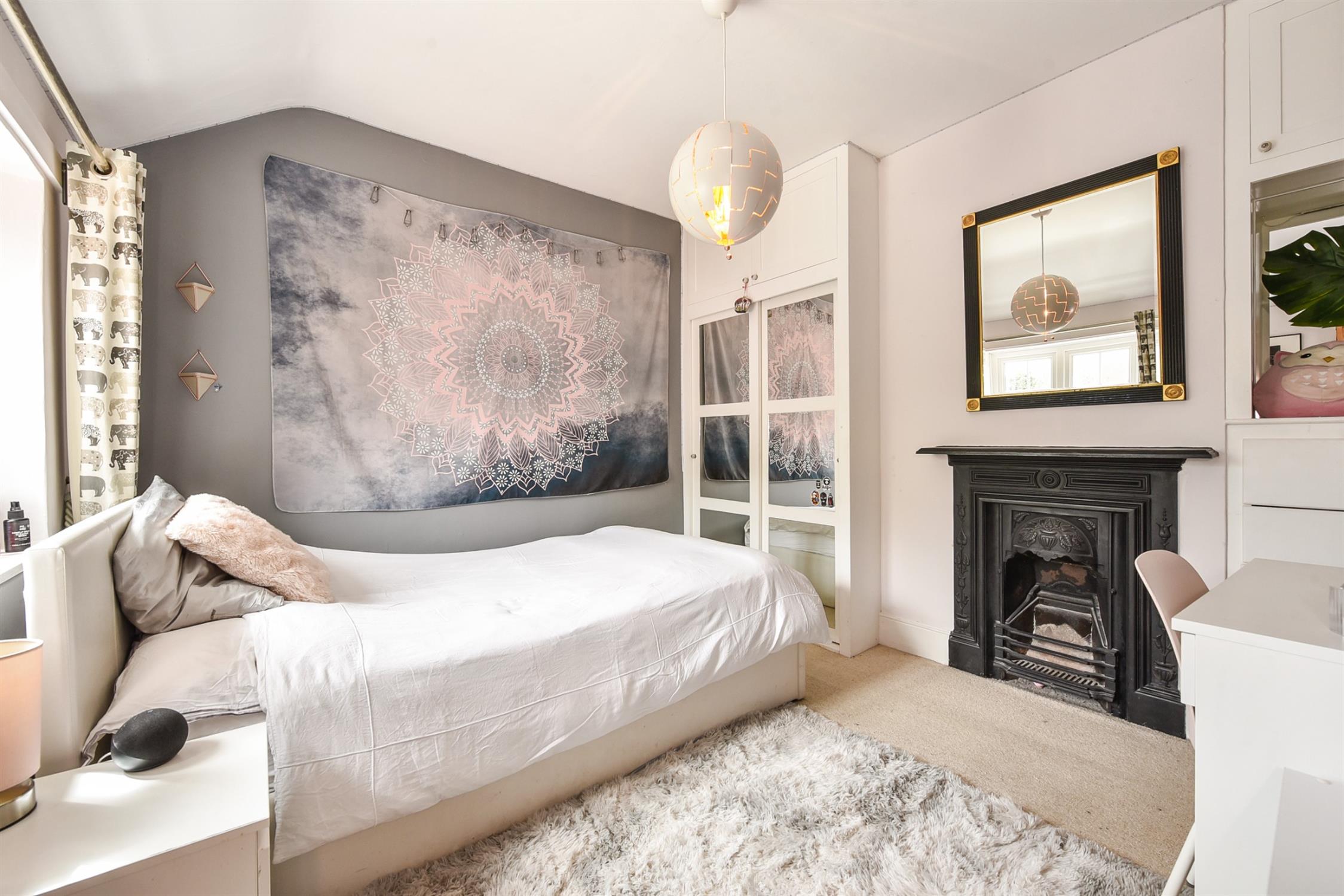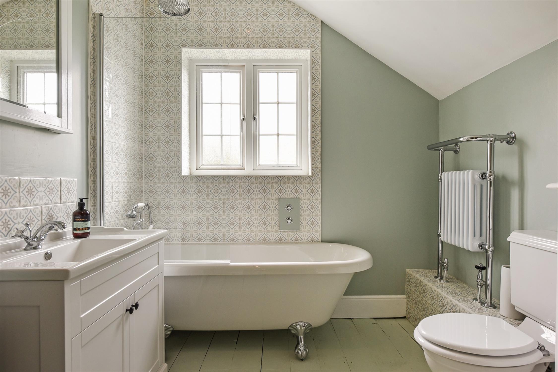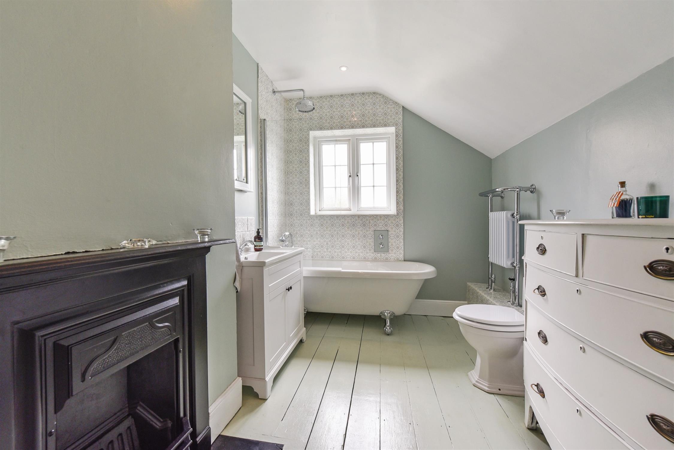 Upstairs, there are two bright bedrooms. Bedroom one is particularly generous in size as this used to be two separate bedrooms which the current owners reconfigured into one. Bedroom two further benefits from fitted storage. The family bathroom can also be found on this floor. It has been decorated in a lovely farmhouse style and is fitted with a clawfoot tub with waterfall shower over, vanity unit, toilet, and traditional chrome heated towel rail. One of the cupboards has been fitted as a laundry cupboard with space for washing machine and dryer, and the other is a heated airing cupboard. There is also a pretty French-style fireplace and surround.