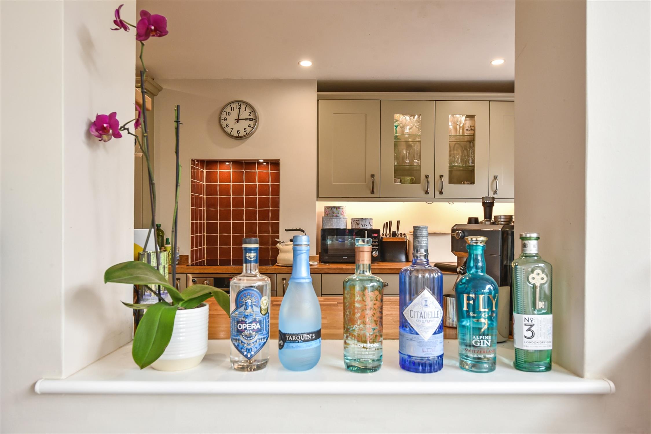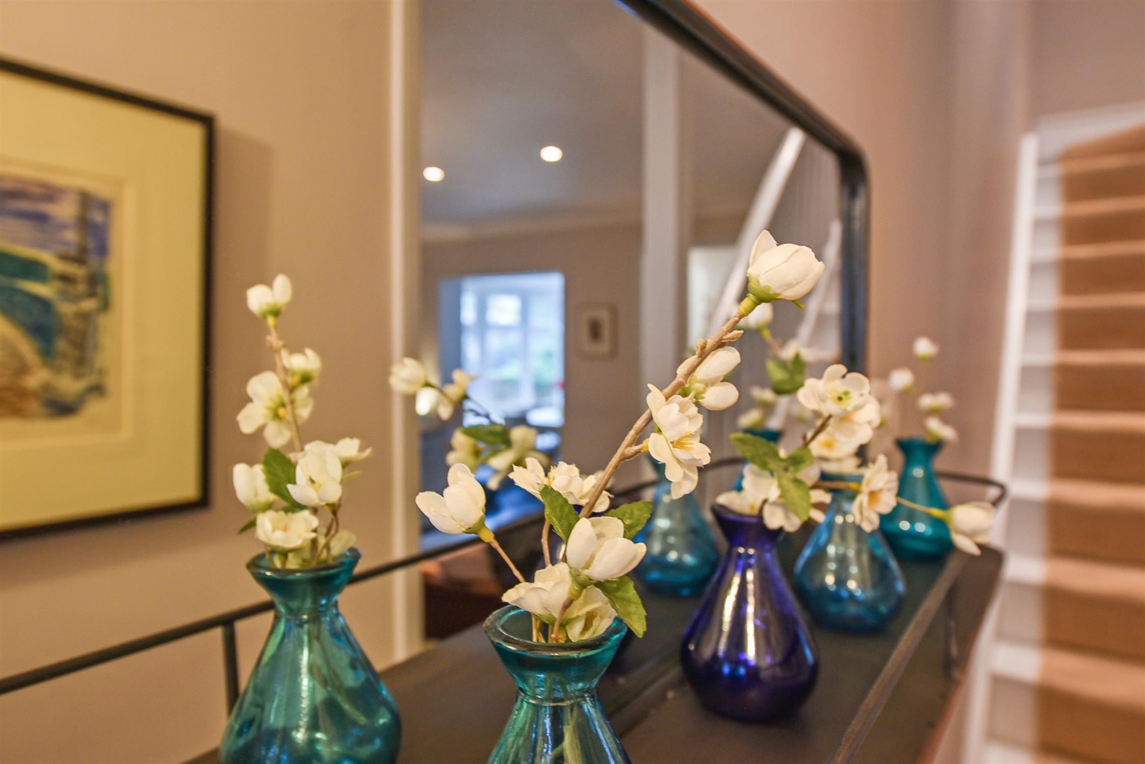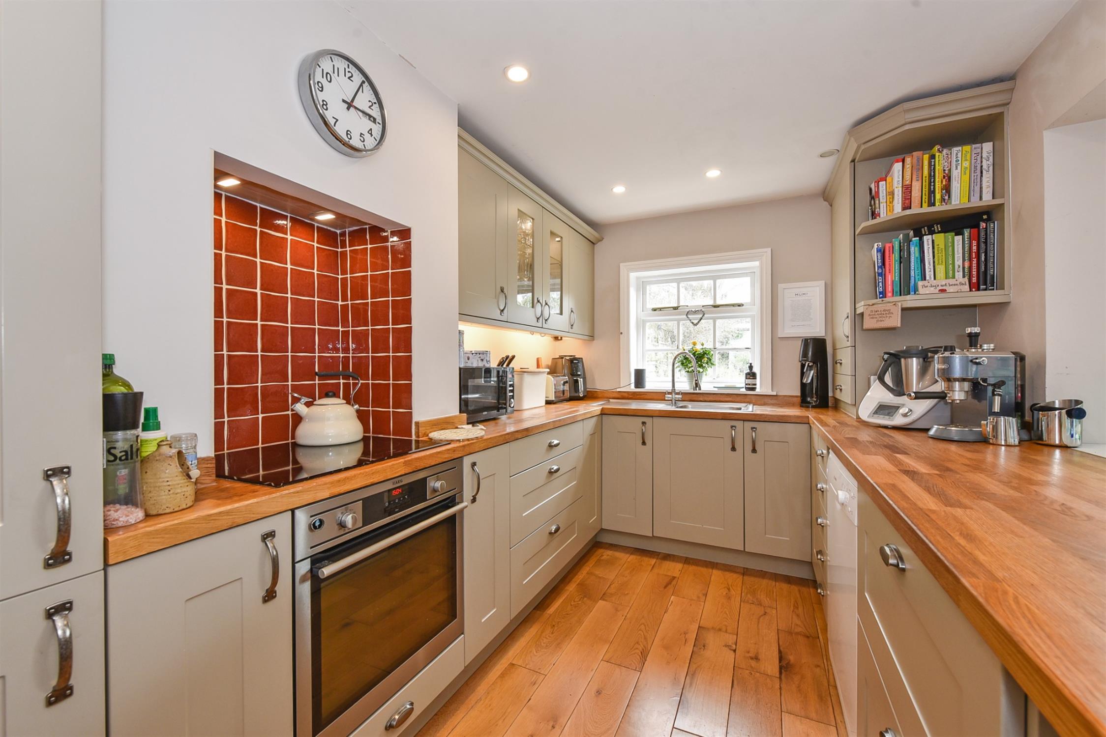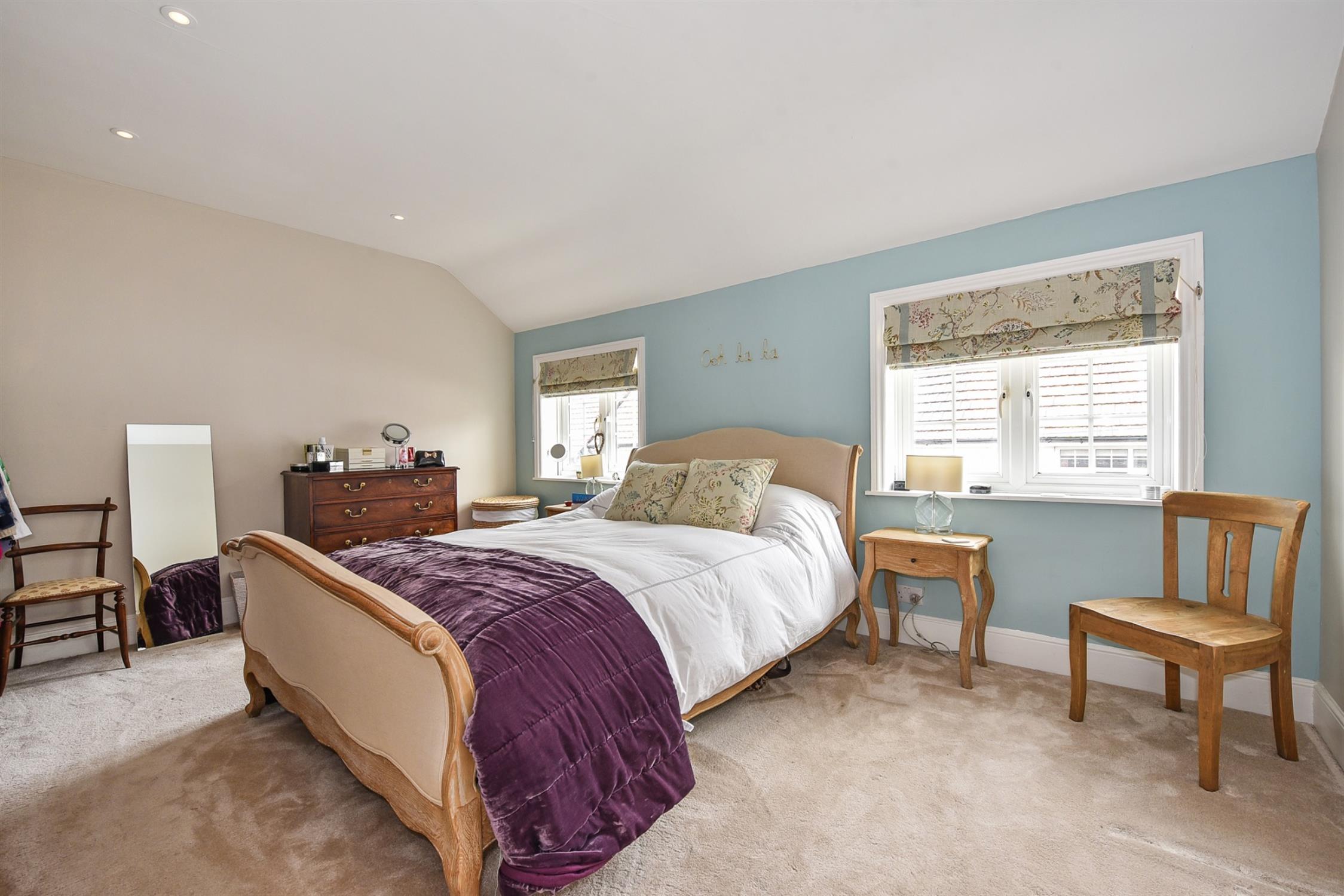 Upstairs, there are two bright bedrooms. Bedroom one is particularly generous in size as this used to be two separate bedrooms which the current owners reconfigured into one. Bedroom two further benefits from fitted storage. The family bathroom can also be found on this floor. It has been decorated in a lovely farmhouse style and is fitted with a clawfoot tub with waterfall shower over, vanity unit, toilet, and traditional chrome heated towel rail. One of the cupboards has been fitted as a laundry cupboard with space for washing machine and dryer, and the other is a heated airing cupboard. There is also a pretty French-style fireplace and surround.