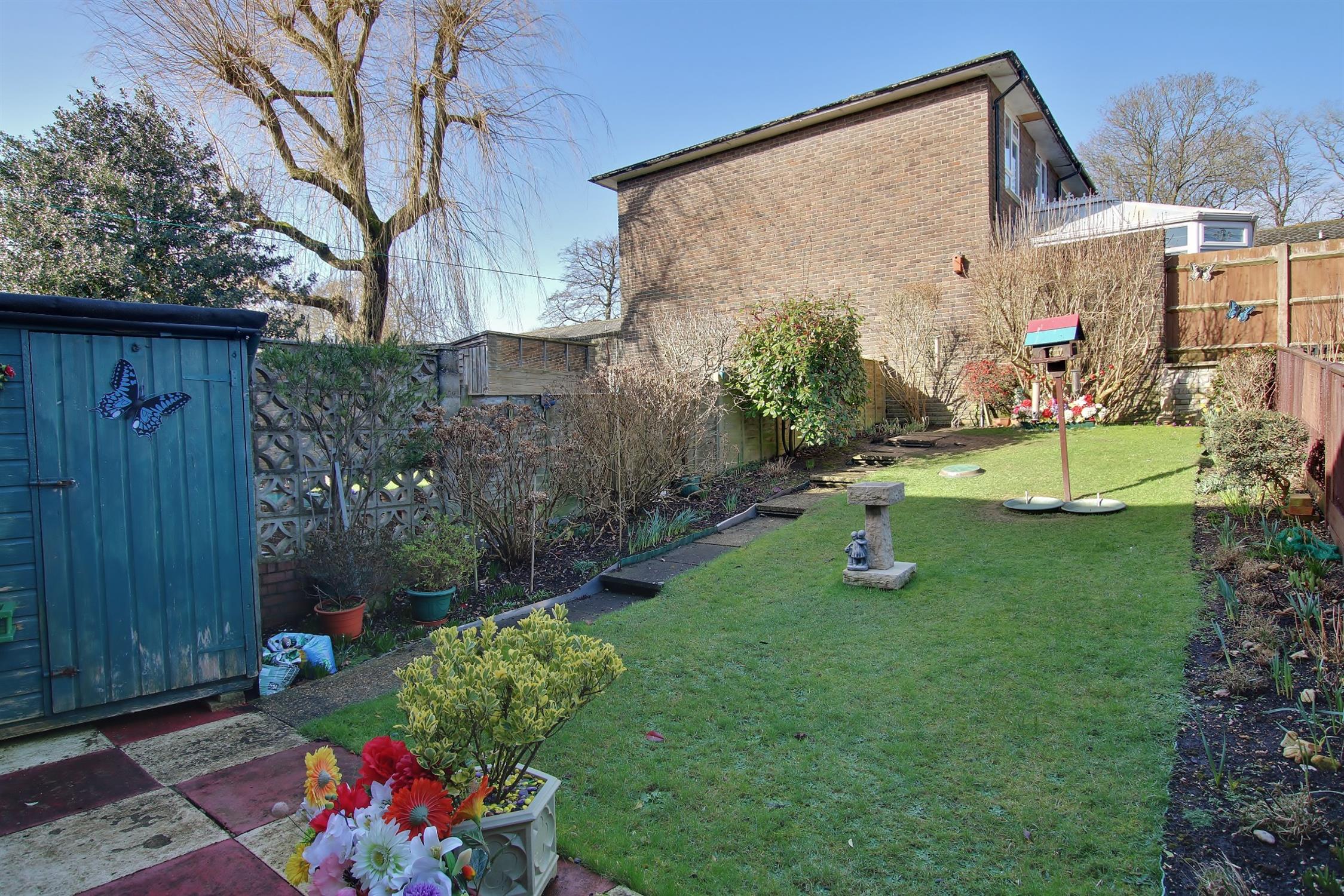 To the front of the property is an outside store and an area laid to lawn with a pathway which leads to the front door. The rear garden is mostly laid to lawn with a patio area, garden shed, mature shrubs, flowerbeds and is enclosed on all sides.