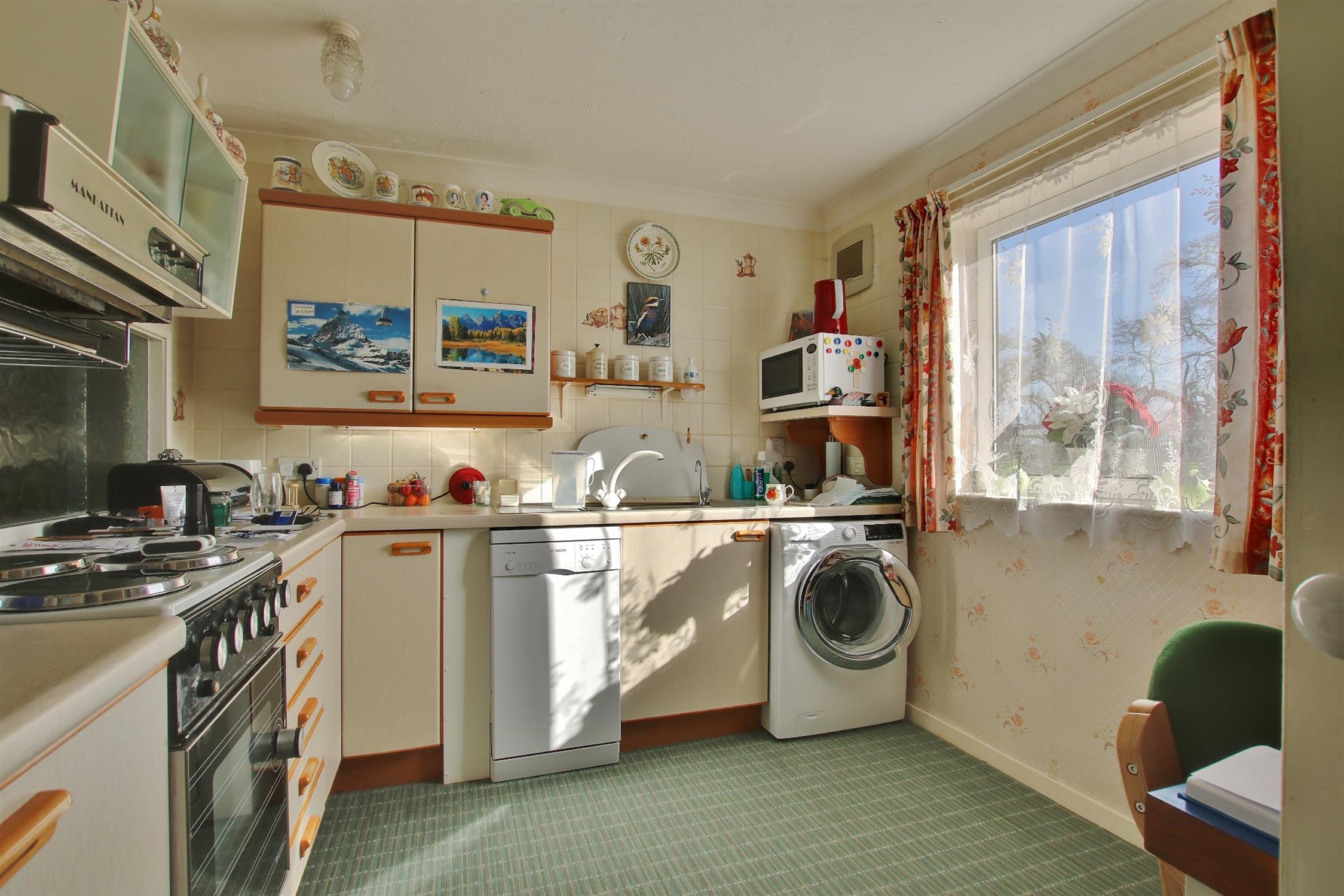 A range of wall and base cupboards with work surfaces over. Stainless steel sink with drainer. Plumbing for washing machine and dishwasher. Space for oven. Radiator. Double glazed window.