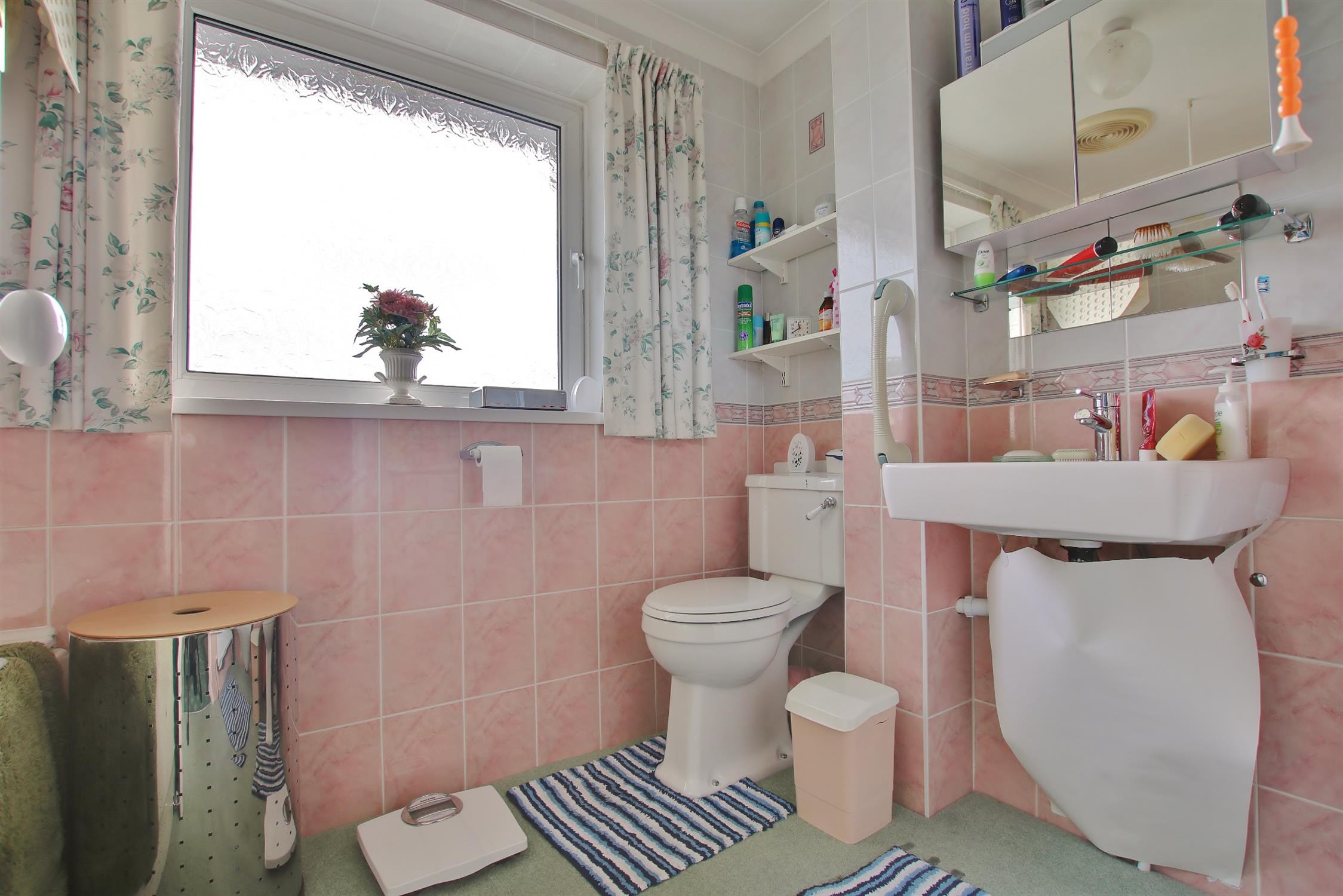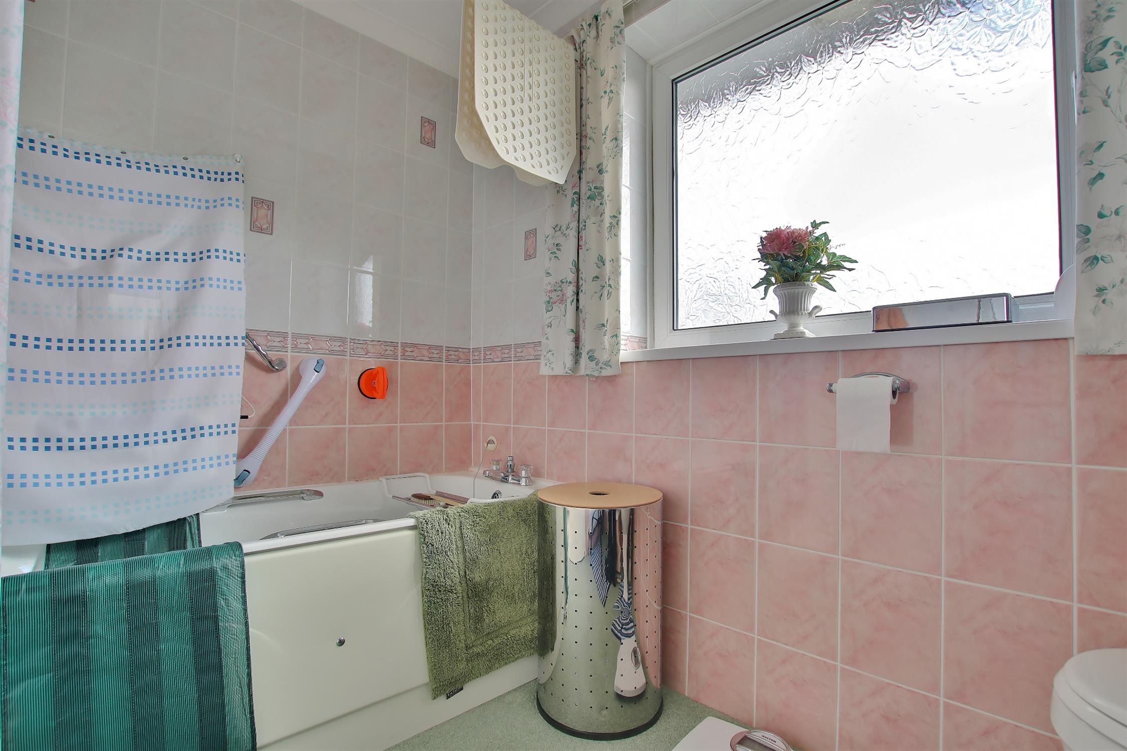 Panelled bath with shower attachment. WC. Ceramic sink. Radiator. Extractor fan. Frosted double glazed window.