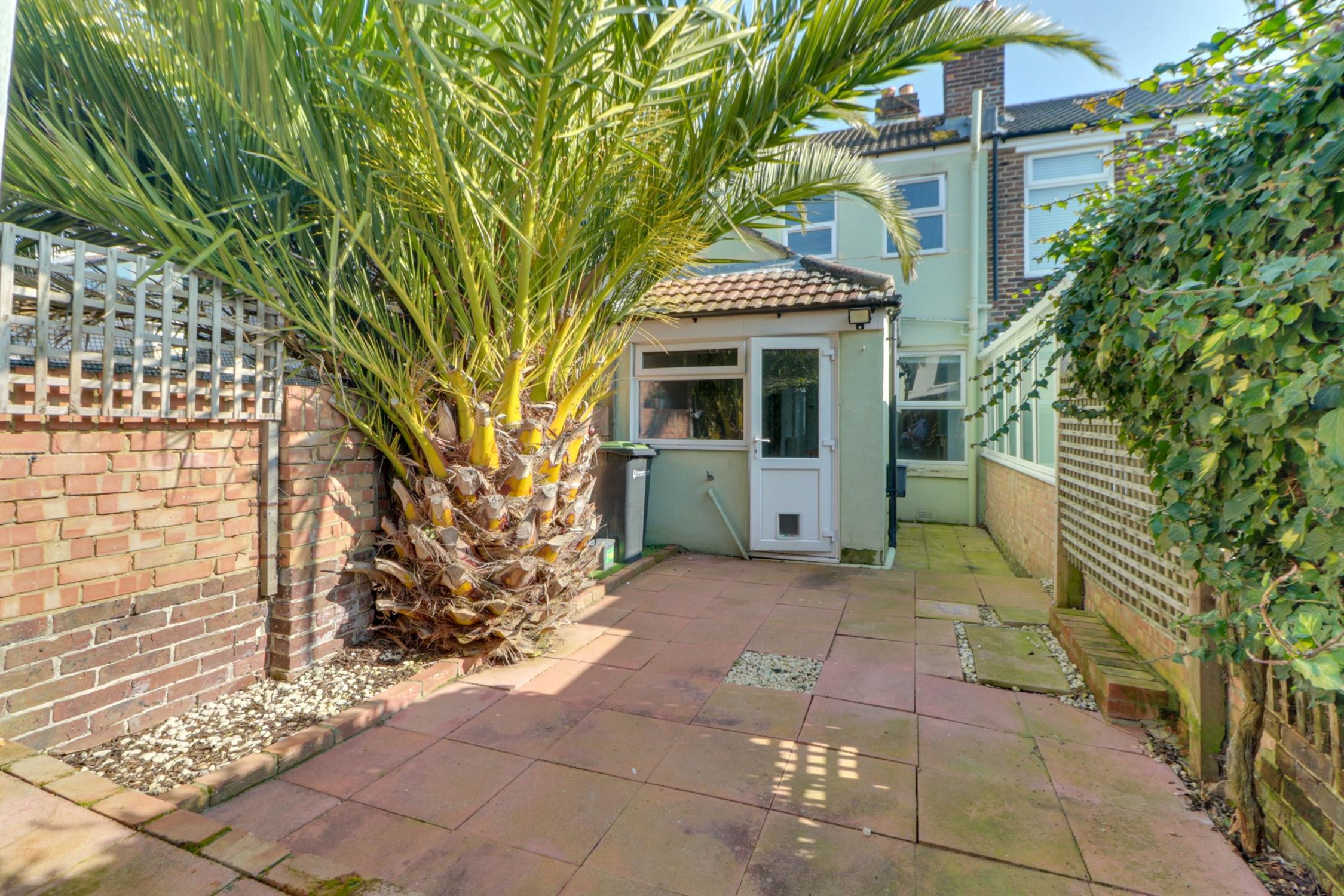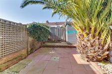 West facing rear garden, wall and fence enclosed, mostly laid to patio, shed, established palm tree.