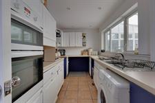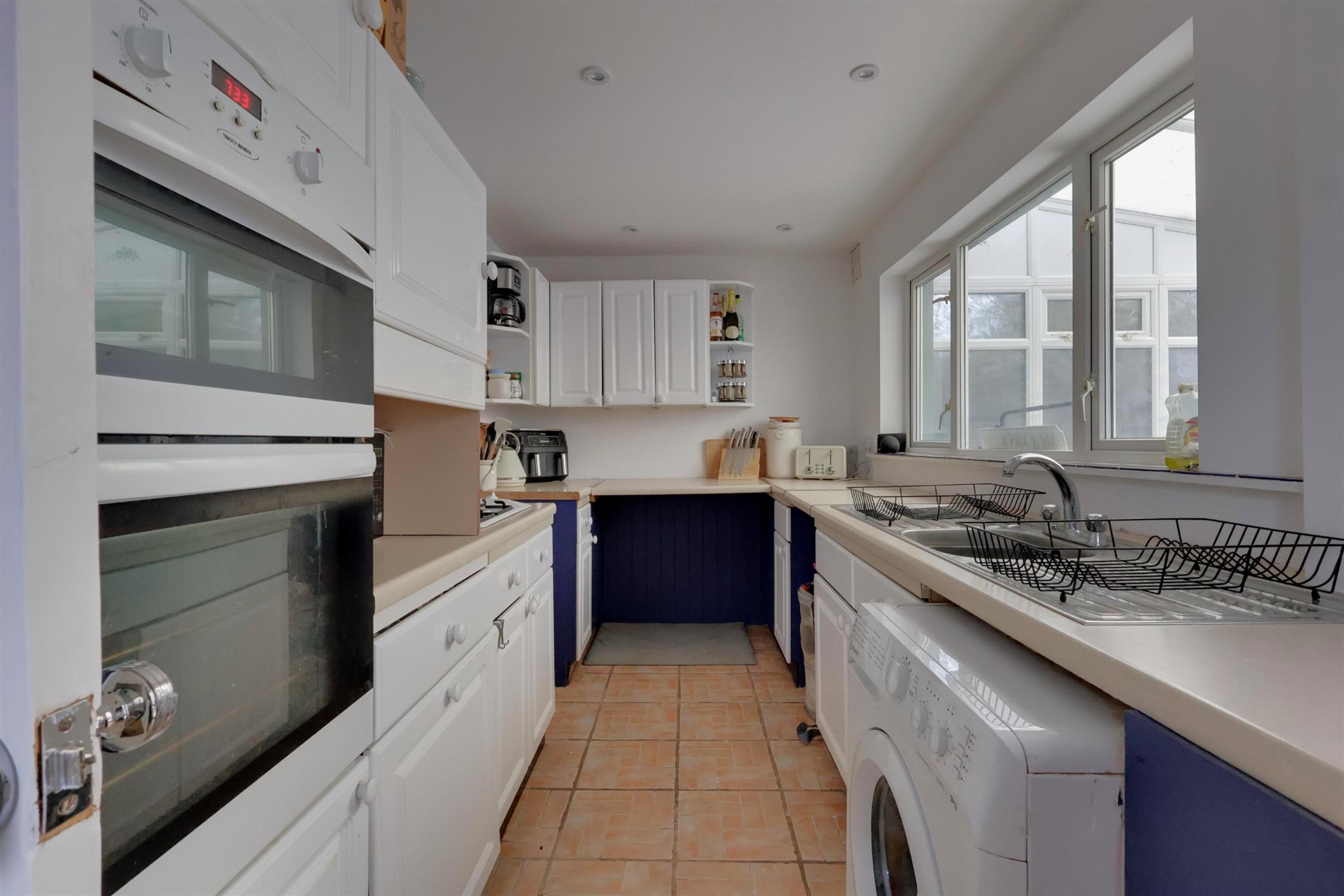 A range of wall and base cupboards with work surface over. Stainless steel sink with drainer. Four ring gas hob. Integrated double oven. Plumbing for washing machine. Radiator. Double glazed window. Door to: