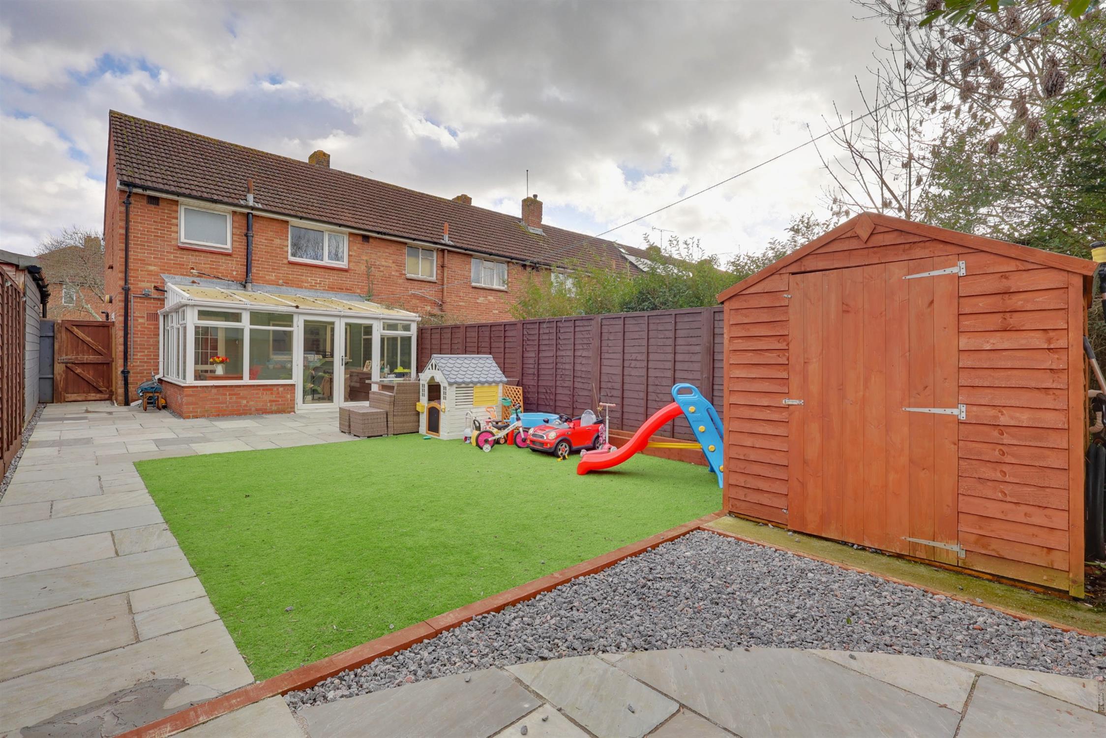 A well-presented, two bedroom end-of-terrace property that enjoys a west facing rear garden. There is a generous rear garden, which has been landscaped for low maintenance and provides side access. To the front of the property is off road parking for two vehicles. The entrance hall provides access to the sitting room and kitchen. There is a conservatory which has French doors opening onto the garden. From the first floor landing is access to the modern bathroom and two double bedrooms. An internal viewing is highly recommended to appreciate the accommodation on offer.