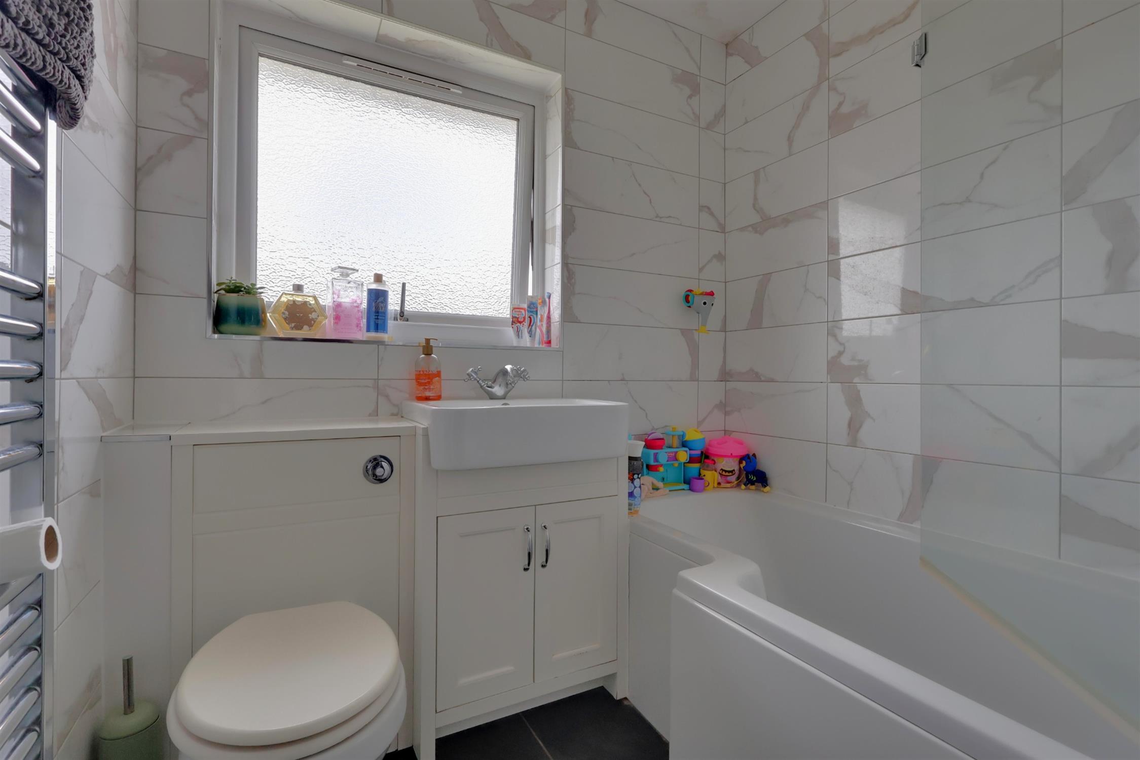 P-shaped bath with screen and shower attachment. WC. Ceramic sink with cupboard under. Heated towel rail. Tiled flooring and walls. Extractor fan. Frosted double glazed window.
