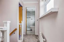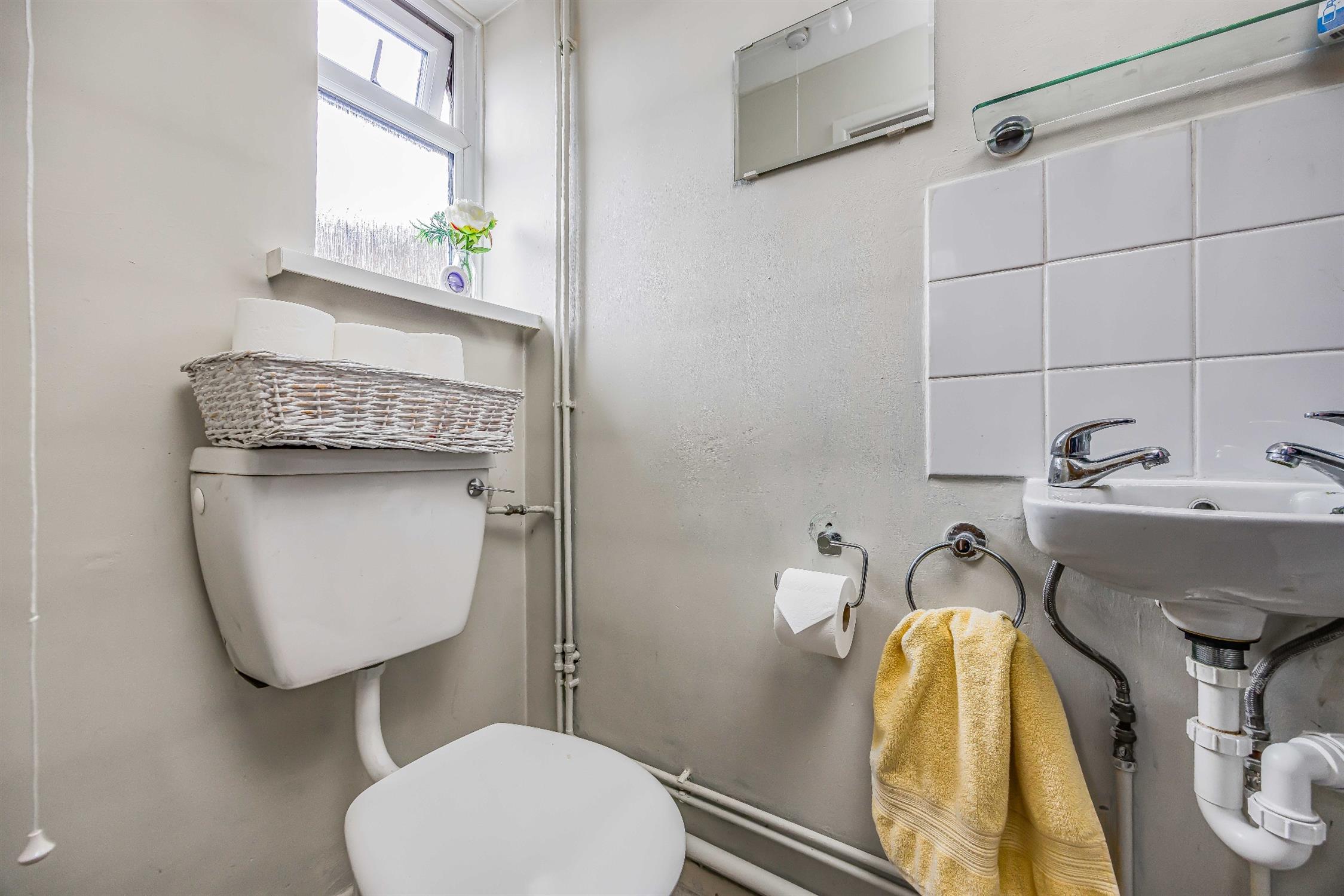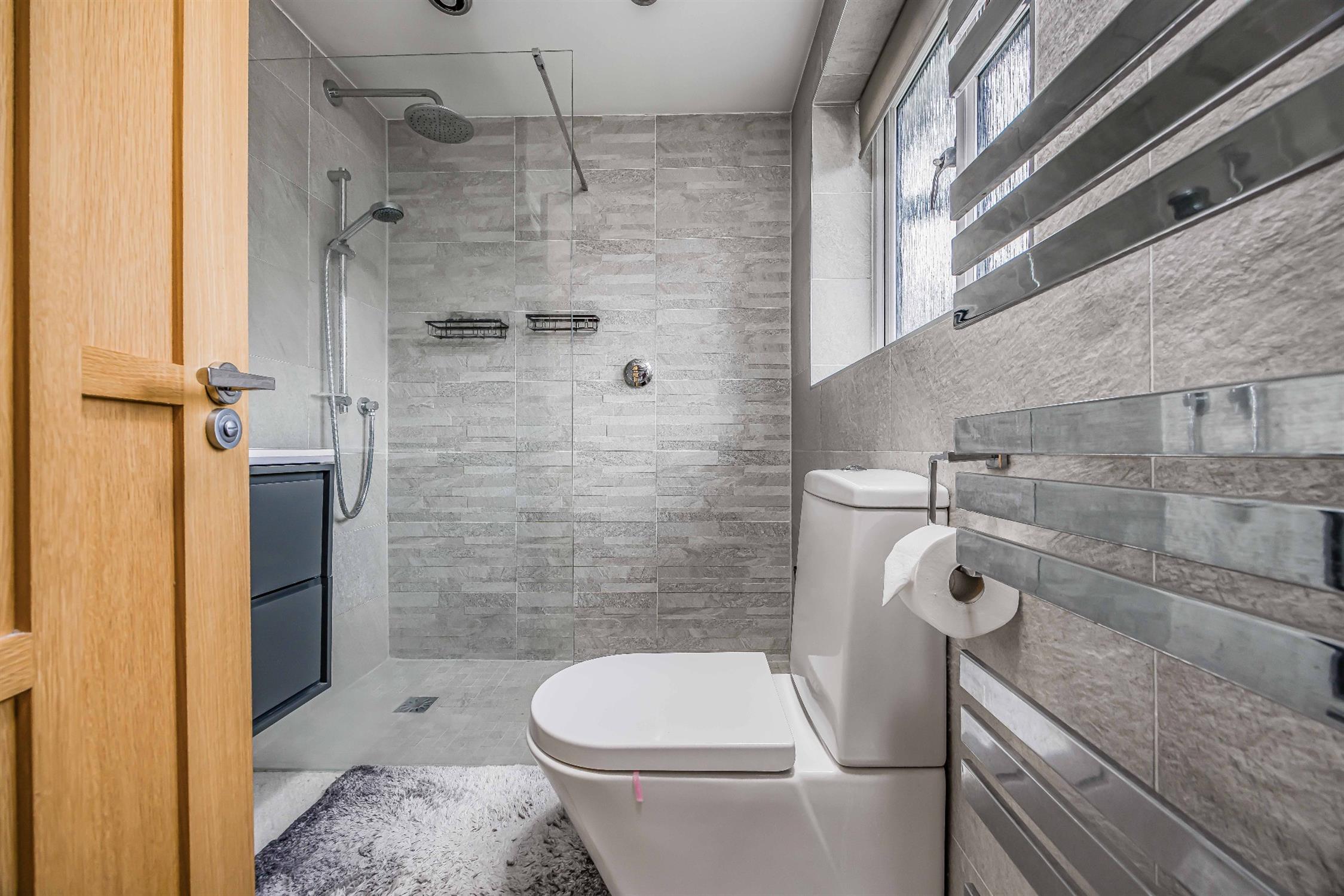 Smooth plastered ceiling, double glazed obscure window to the rear aspect, a three piece bathroom suite comprising; low level WC, ceramic sink with tap fitting in chrome finish, a spacious walk in shower with mains rain fall shower head over, heated towel rail, linoleum flooring.