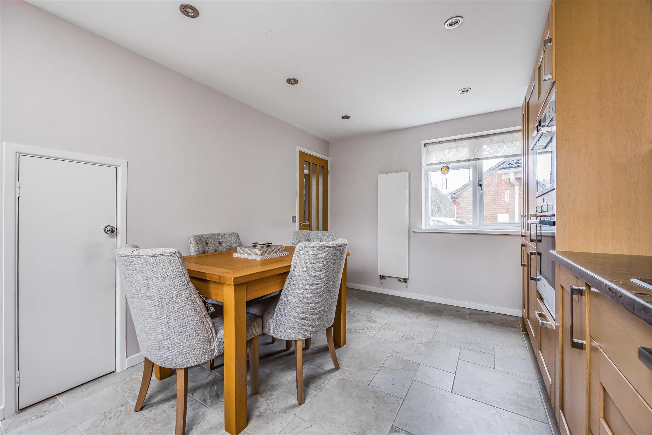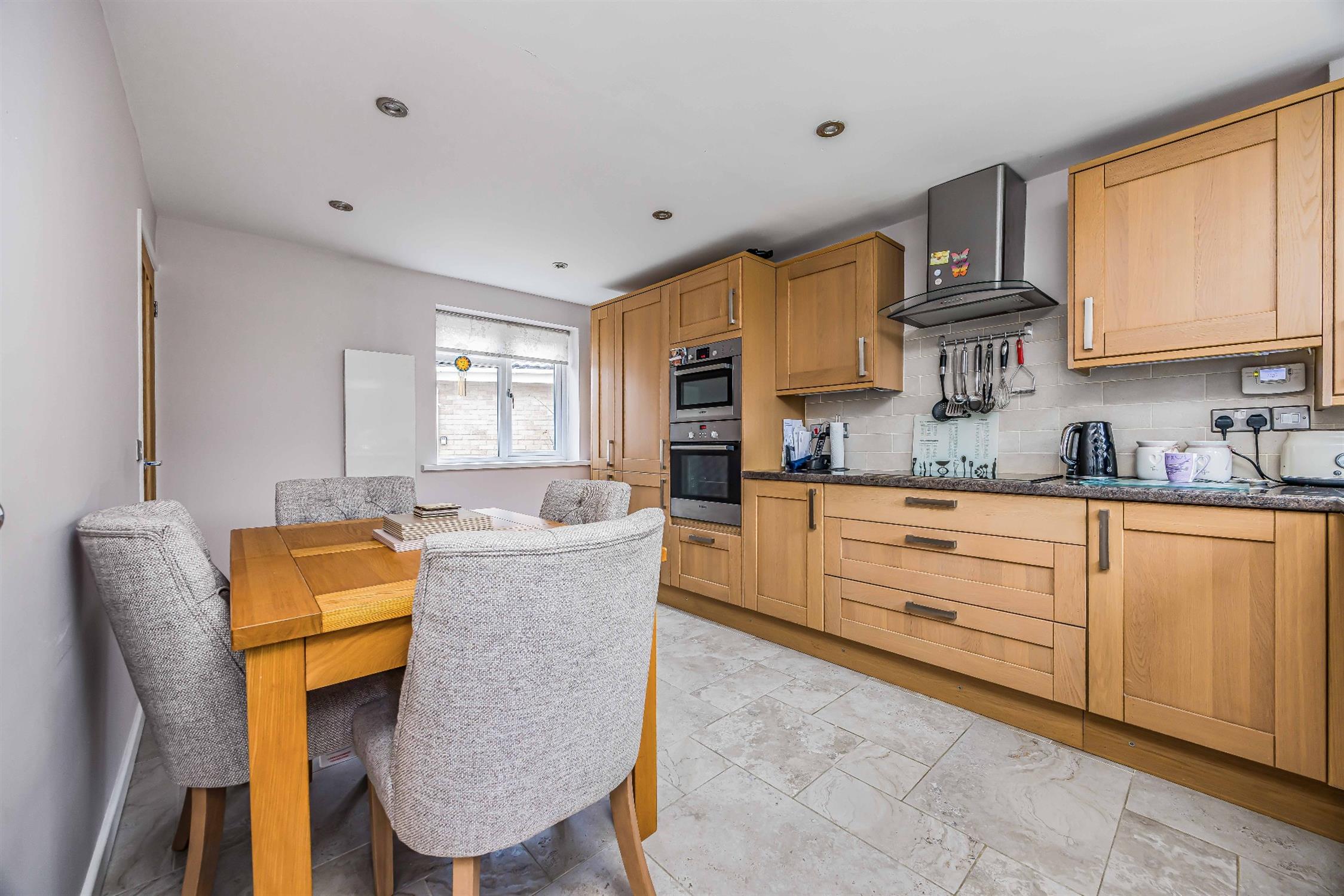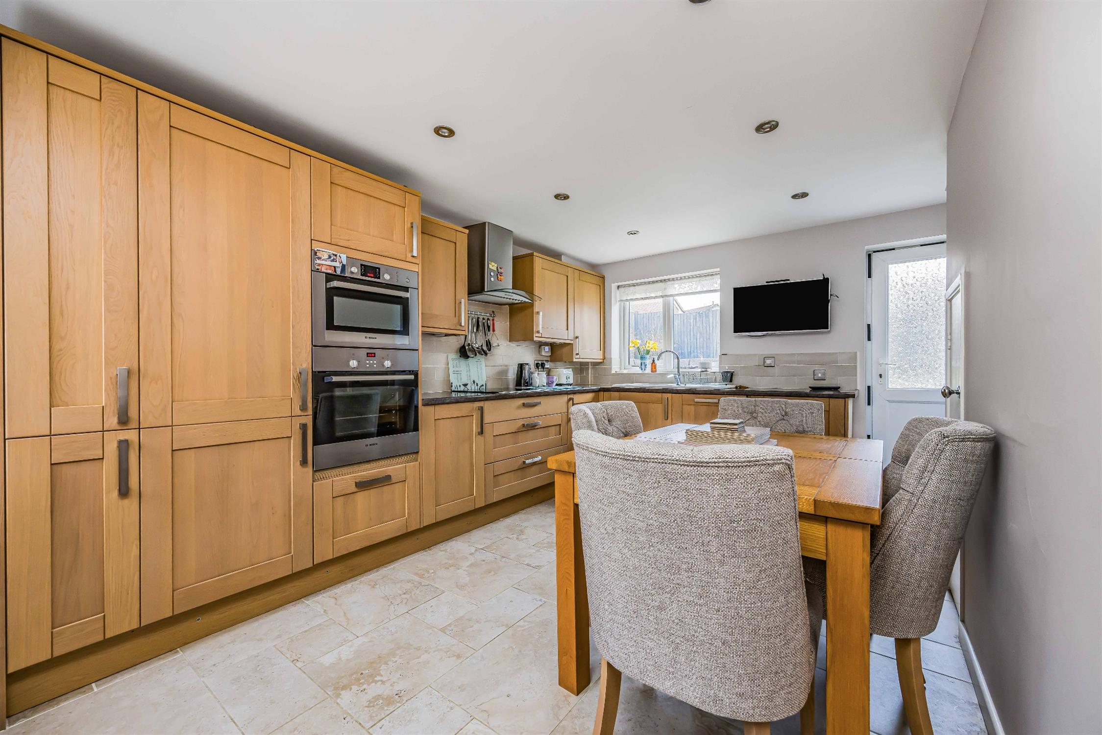 Smooth plastered ceiling, spot lighting, double glazed windows to the front and rear aspect and a door to rear garden, a complimentary range of wall mounted and base level units with roll edge worktop over, stainless steel sink and drainer, electric hob with extractor hood over, double oven. tiled flooring.