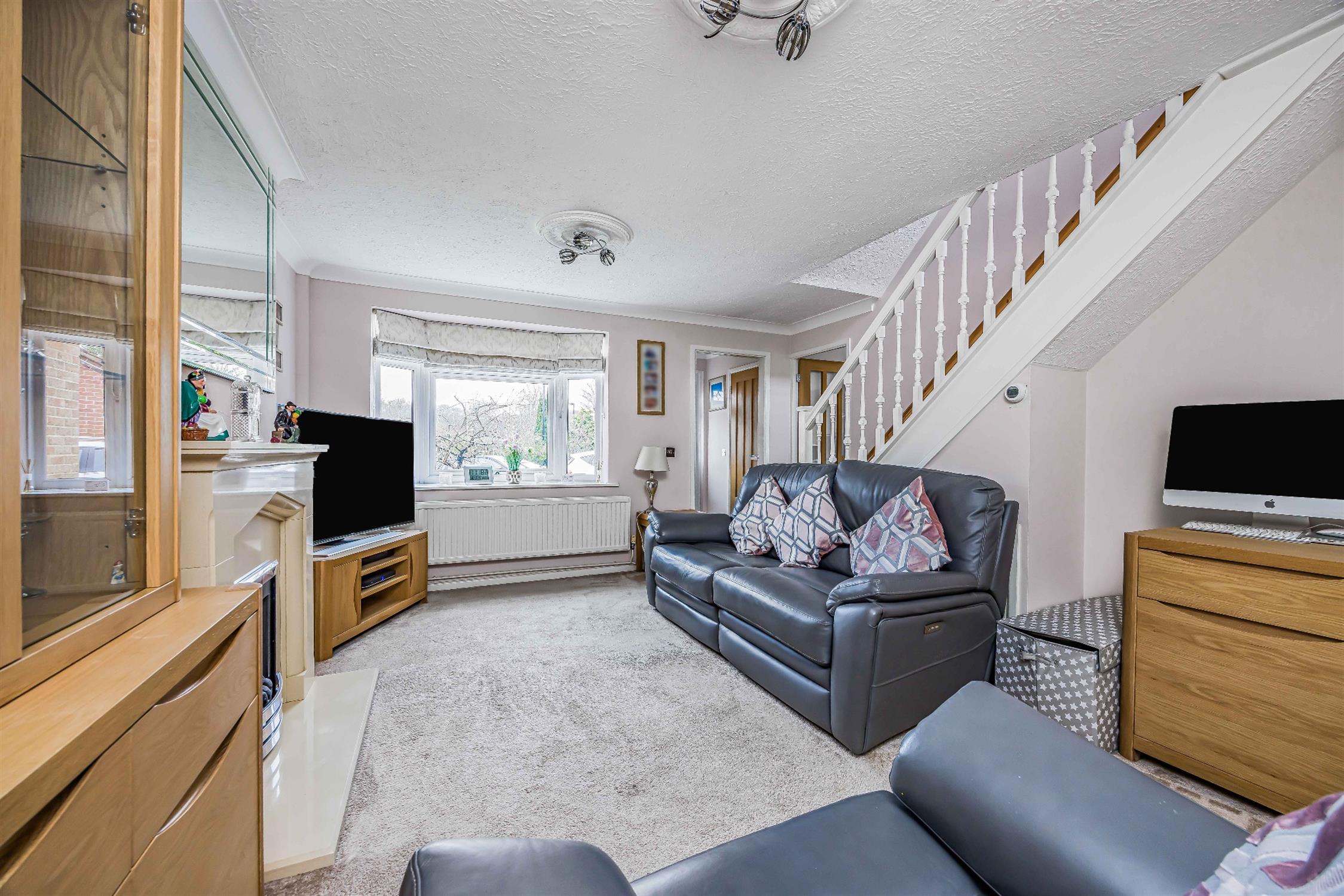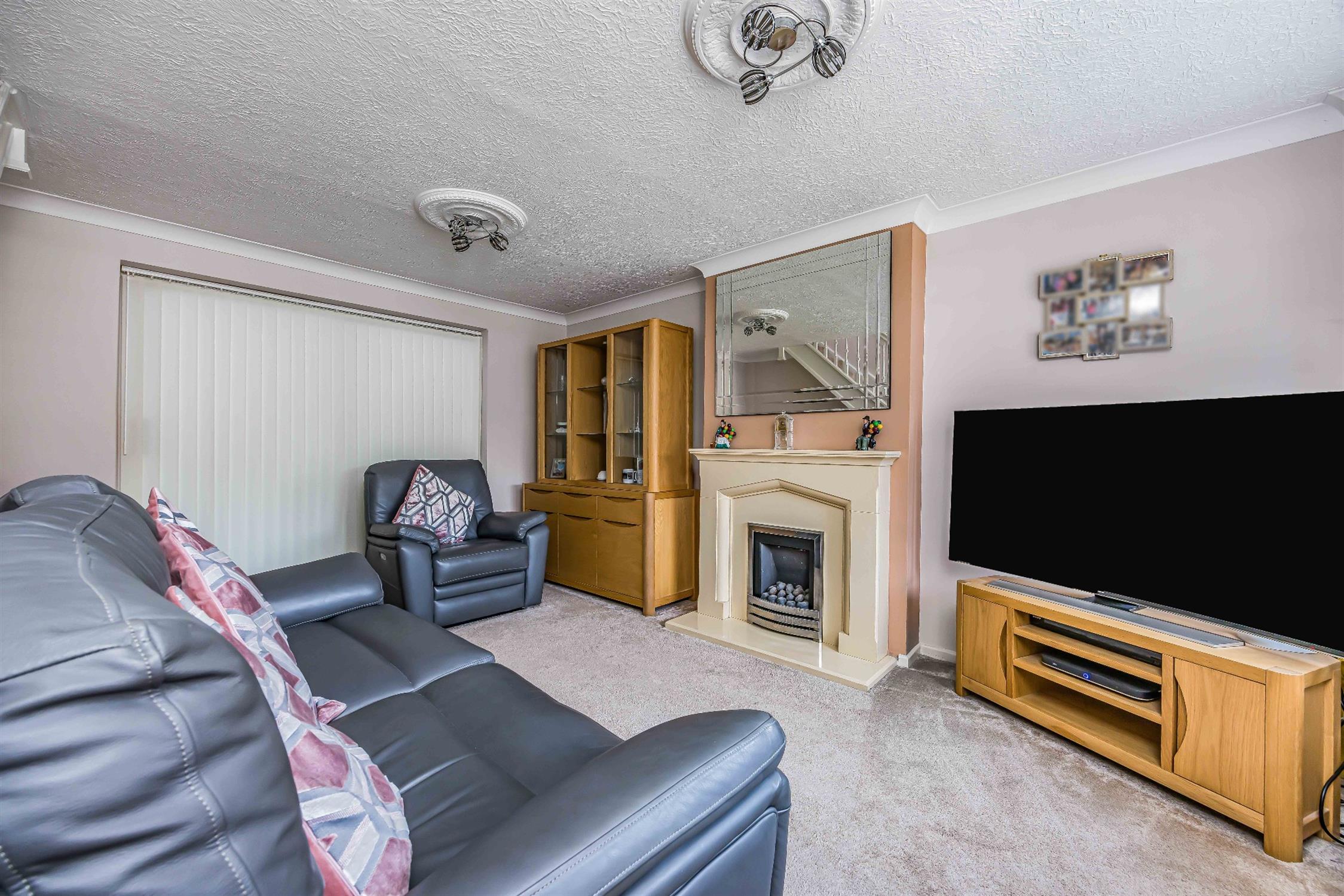 Textured ceiling, coving, double glazed window to the front aspect, radiator, featured fireplace, carpeted flooring.