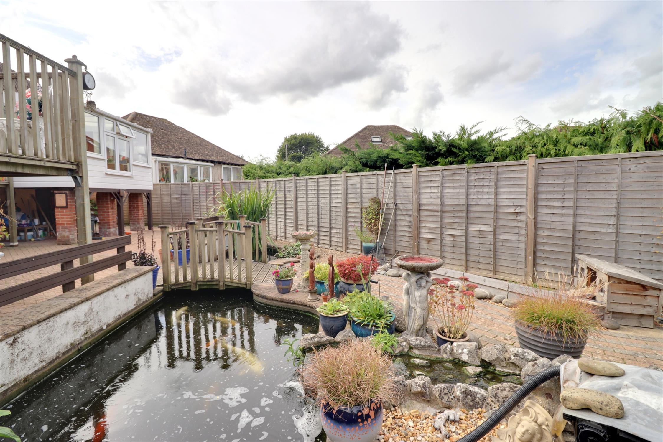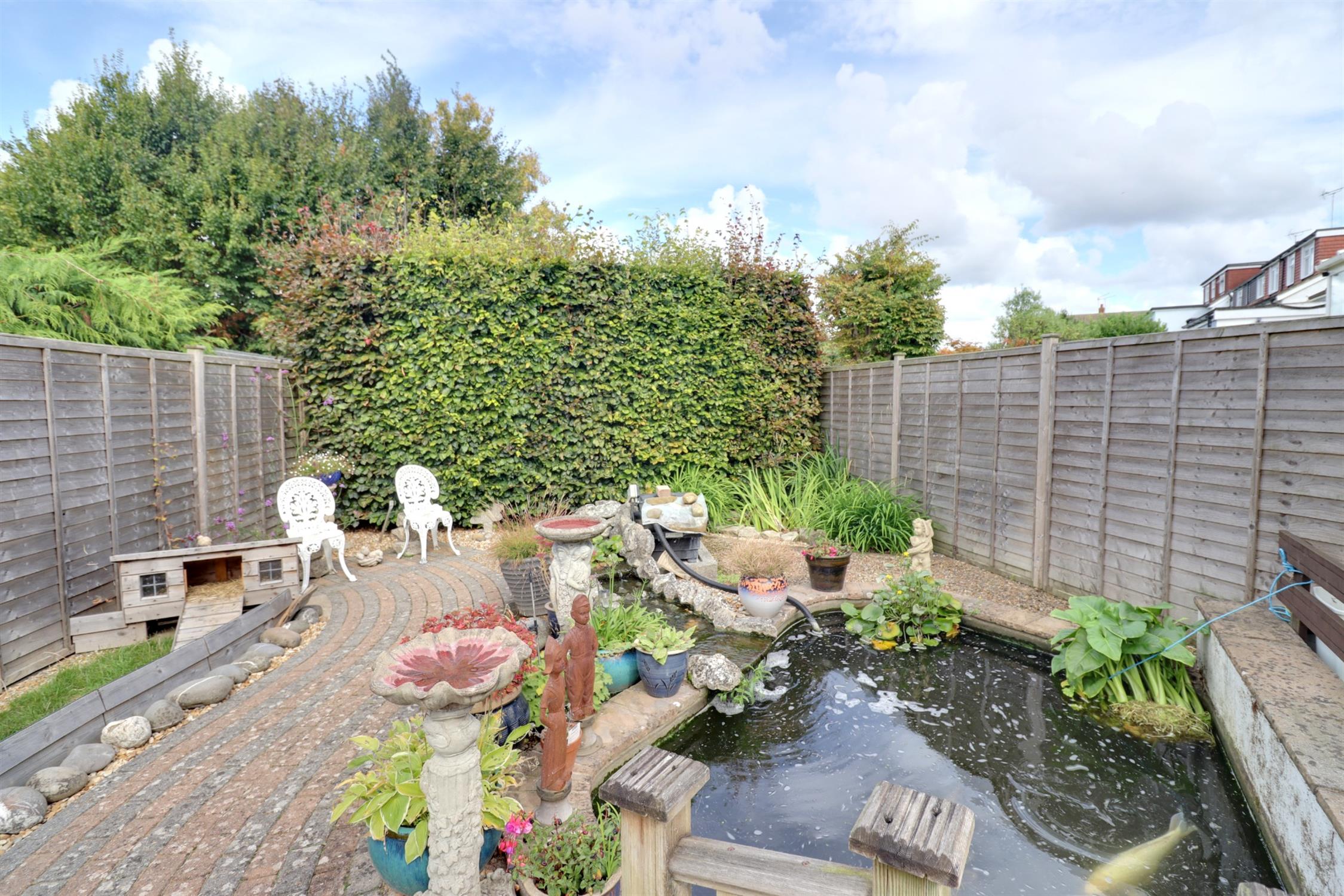 Raised decking and seating area with steps down to the main garden, enclosed by fence, mainly laid to block brick with shingle, pond with water feature and pump, with bridge over, outside tap, borders, access to large cellar/store underneath the property.