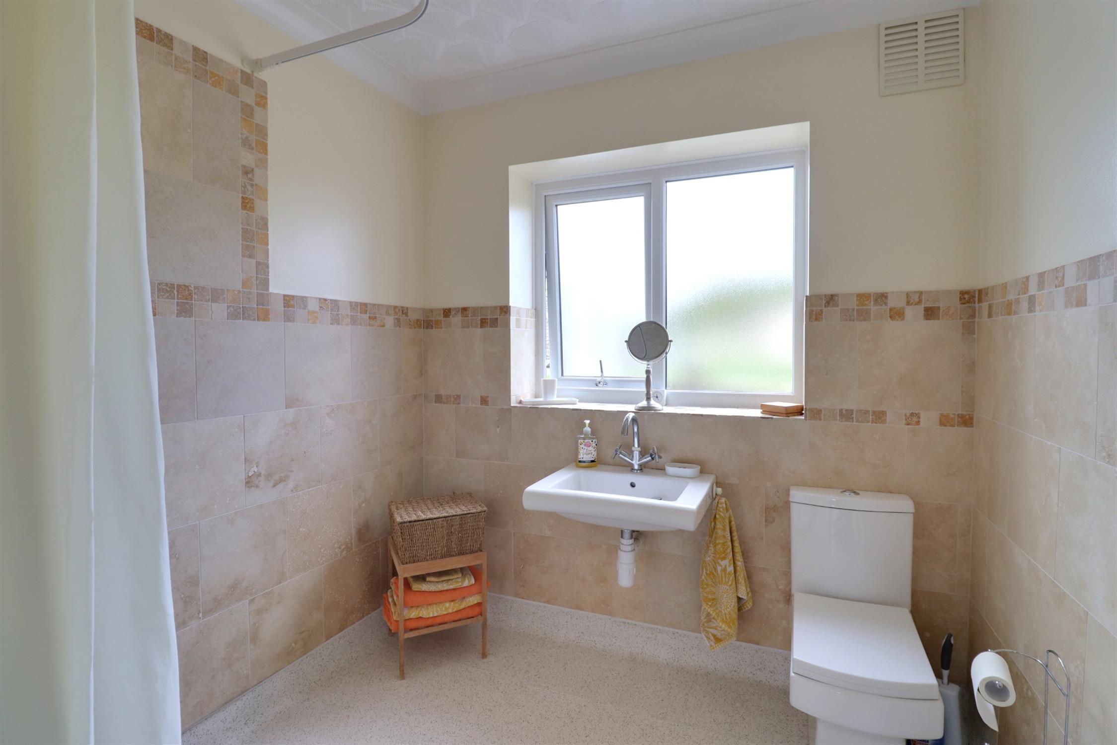 Shower area with electric shower, wall-mounted wash basin, low level WC, tiled walls, radiator, rear aspect double glazed window.
