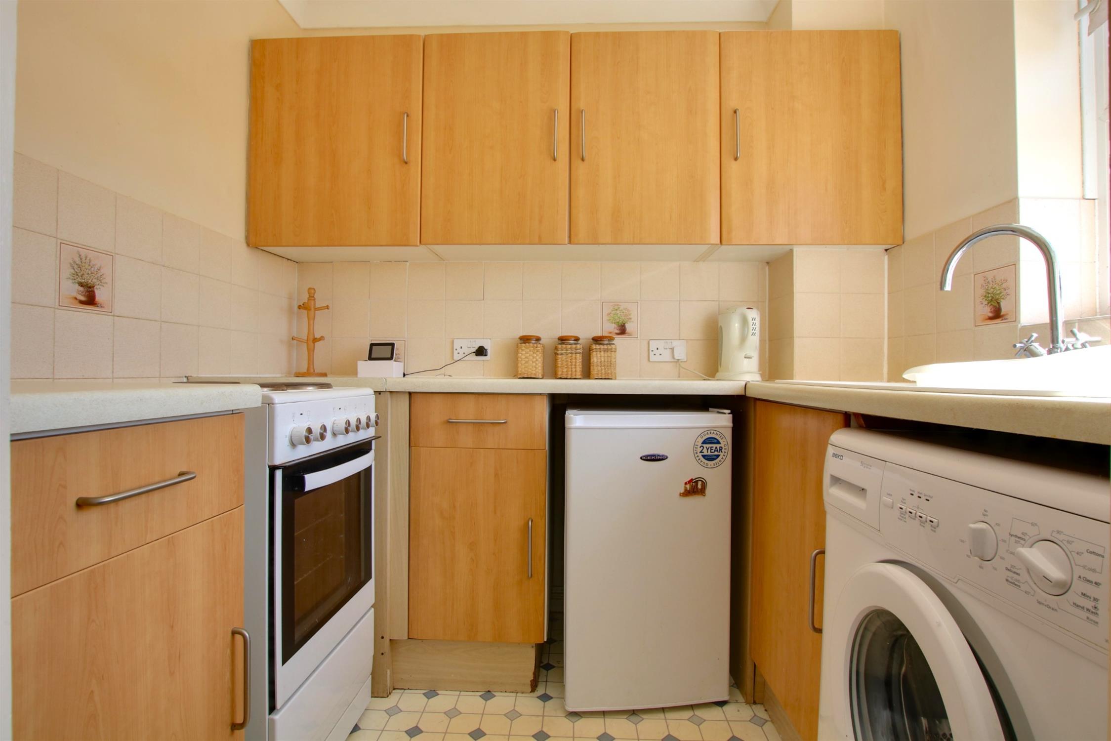 Laminate flooring. Tiled splashback. Wall and base units. Space for washing machine, under counter fridge freezer and cooker. Inset sink. Extractor fan. Double glazed window.
