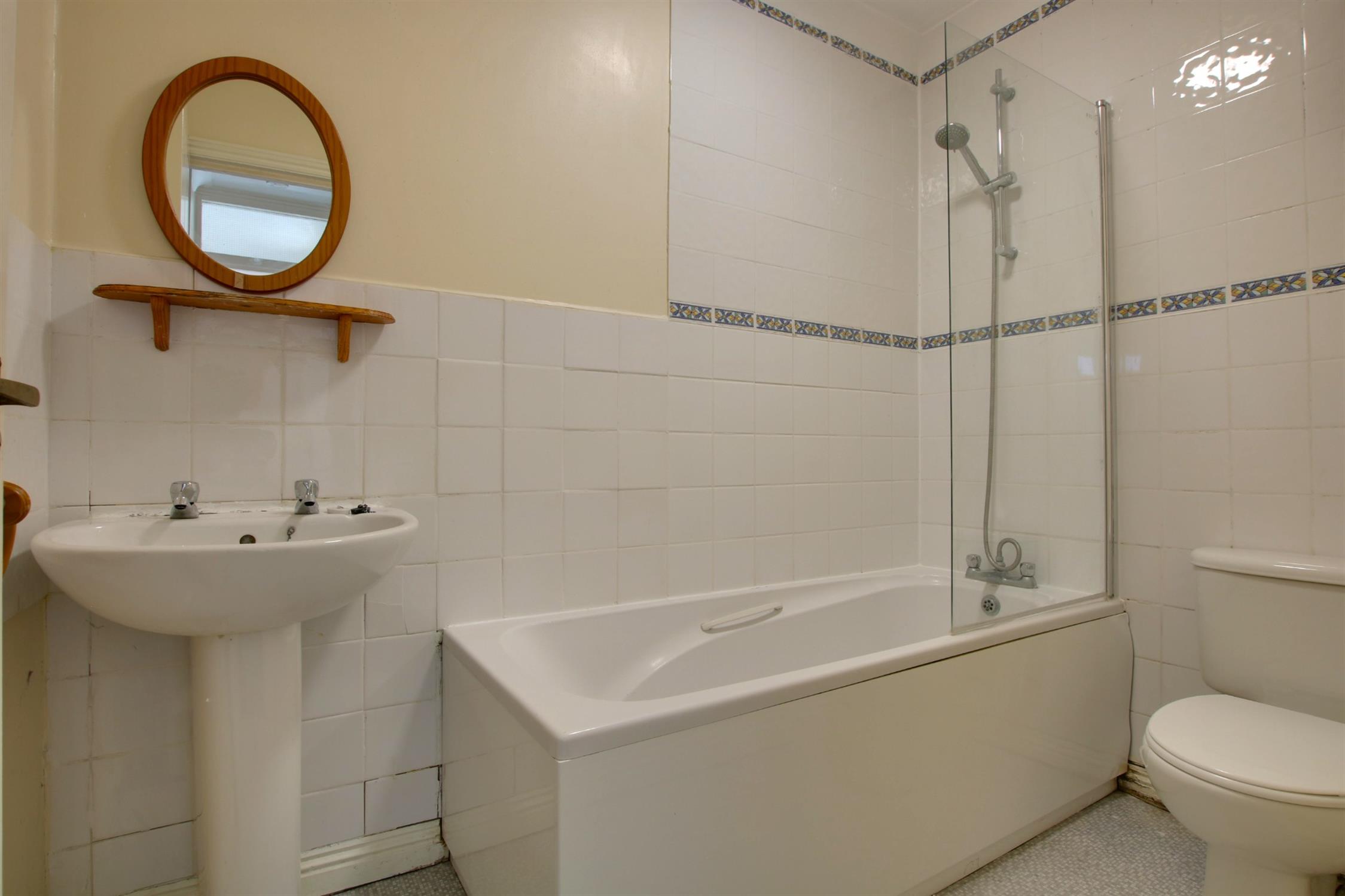 Laminate flooring. Partially tiled walls. Panel enclosed bath with mixer tap and shower attachment. Low level W.C and basin. Extractor fan. Electric heater.
