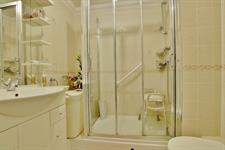 Modern white suite comprising double shower cubicle and shower screen. Vanity unit with inset wash basin. Low Level W.C. Tiled walls. Heated towel rail. Wall-mounted heater. Extractor fan.