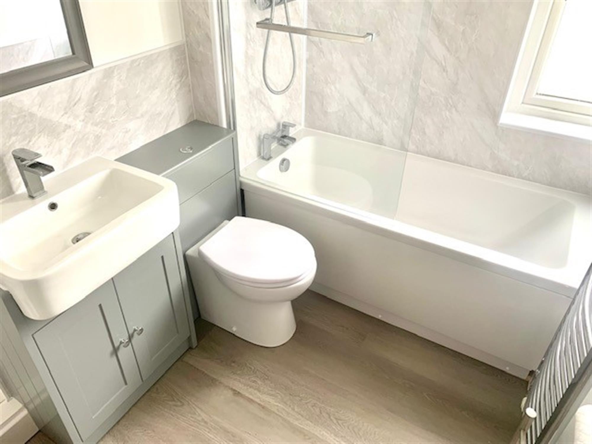 White suite with bath with shower over, toilet and sink in vanity drawer unit. Window to rear.