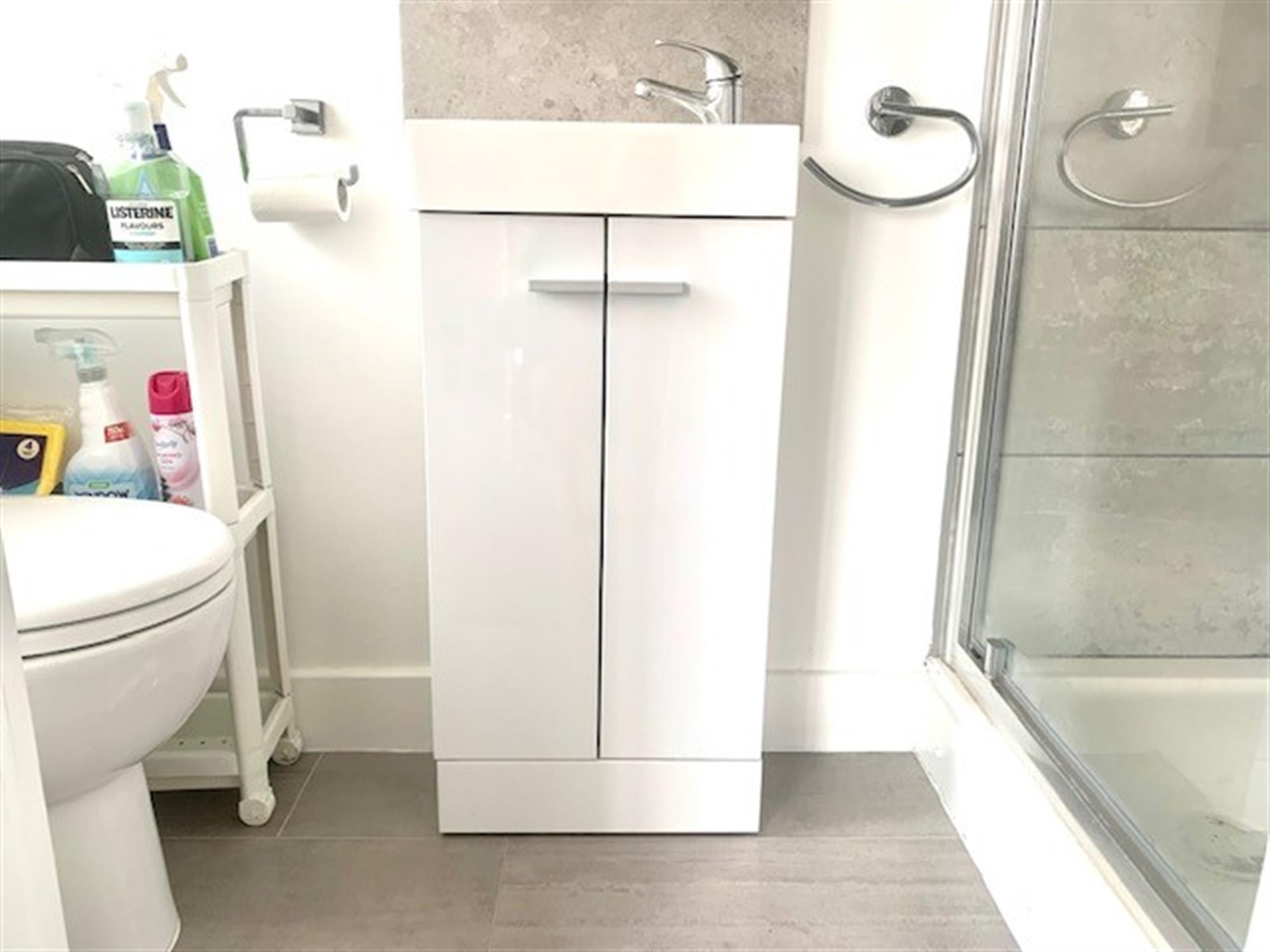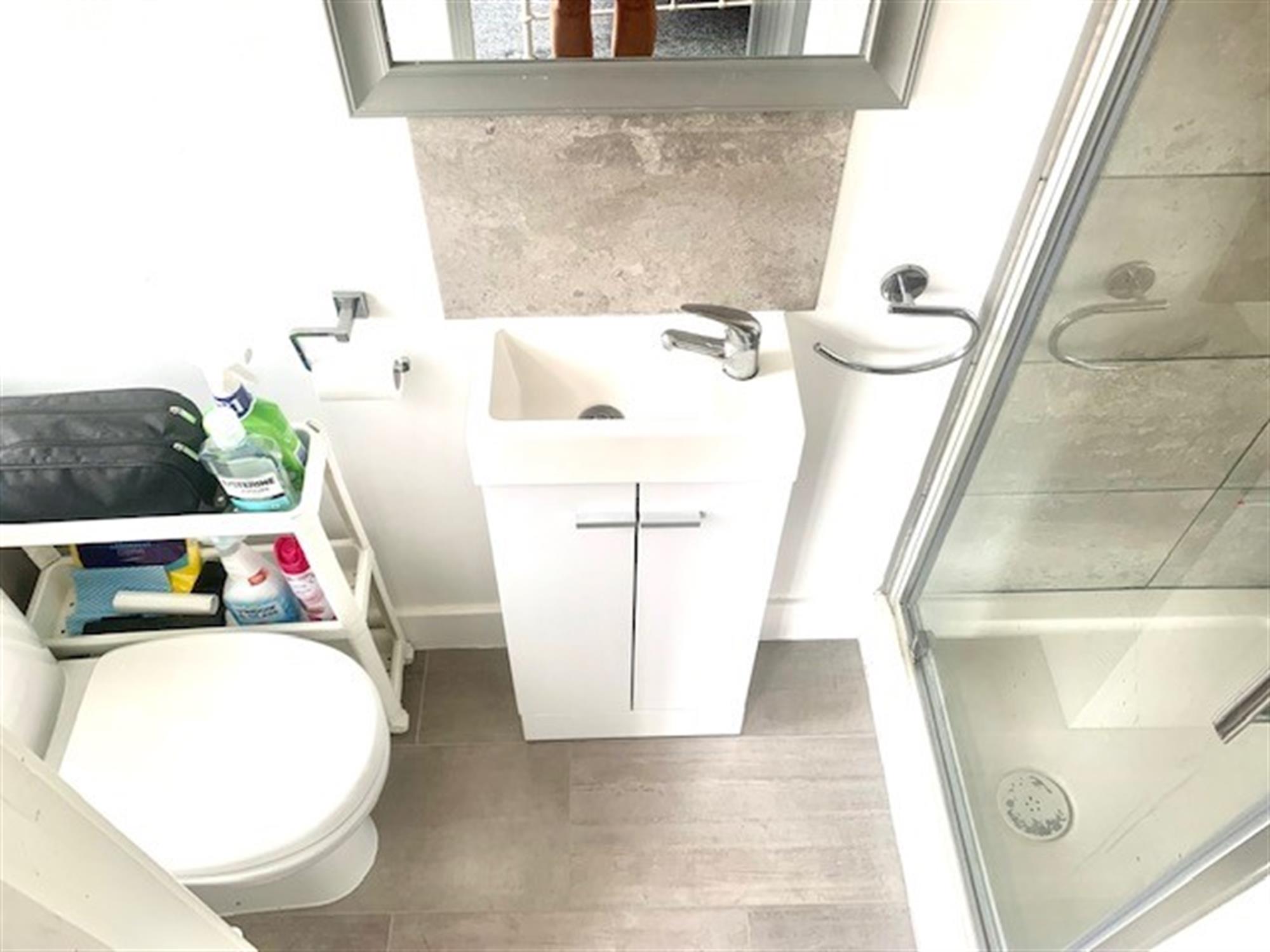 Single shower cubicle, toilet and sink inset in vanity. Window to rear.