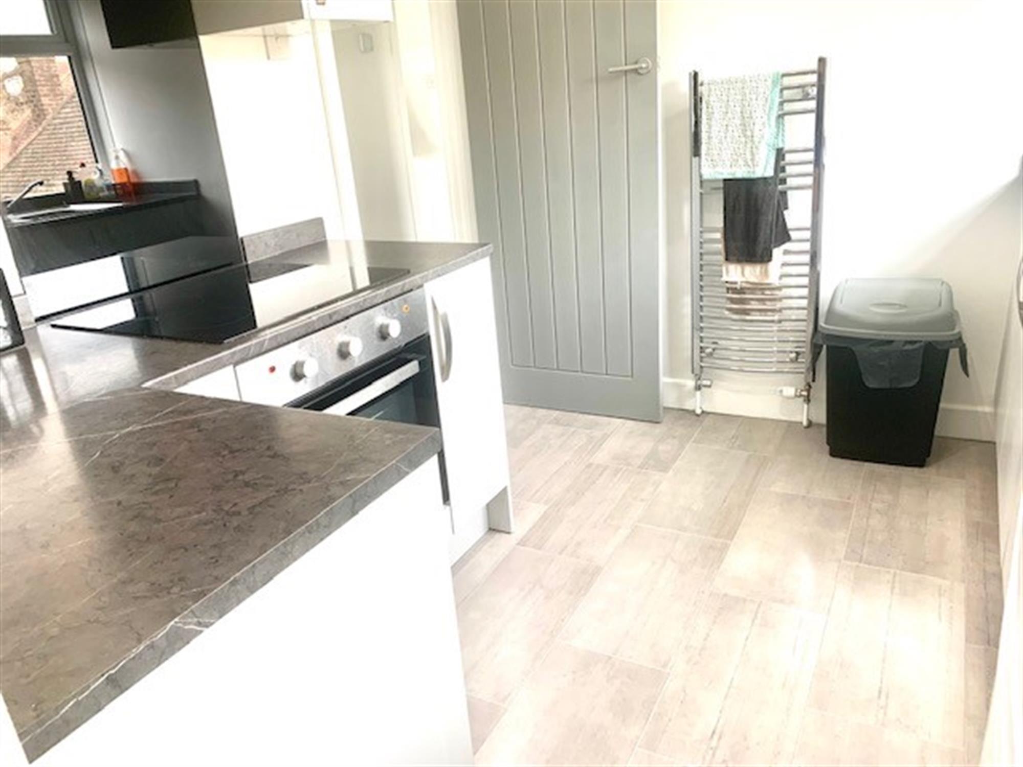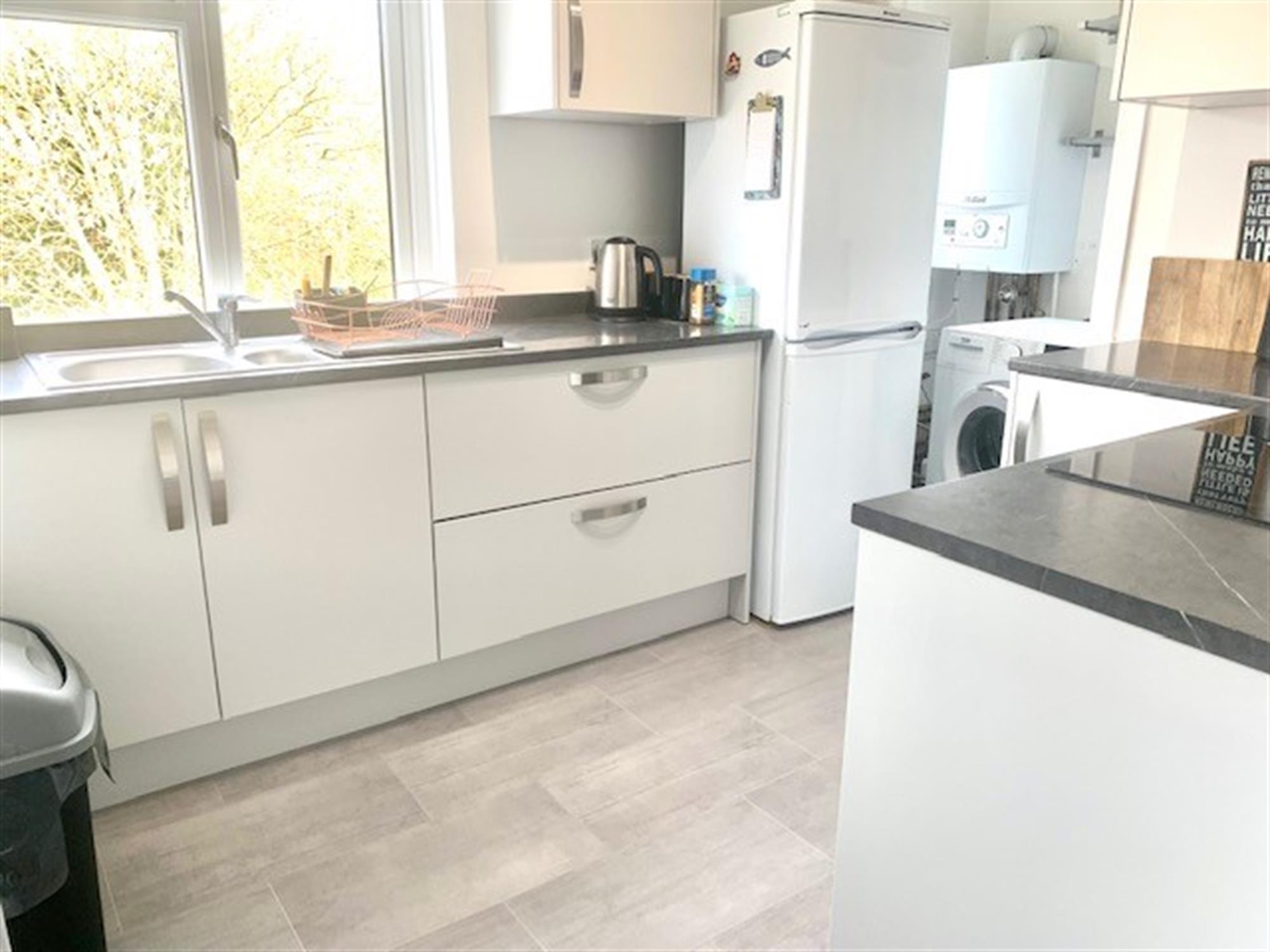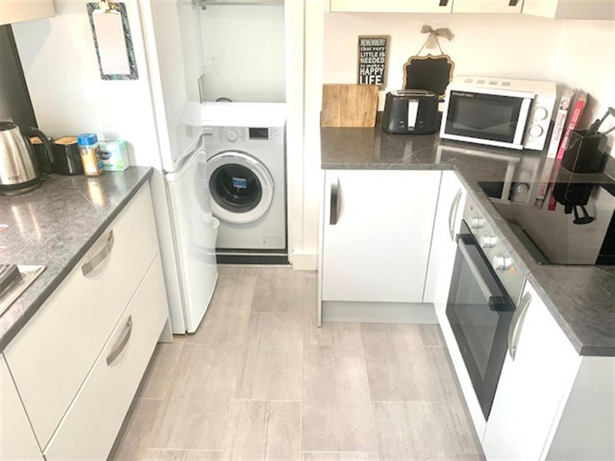 Modern white wall and base units. Window to rear. Appliances to include: Fridge/freezer, electric hob, electric oven and washing machine.