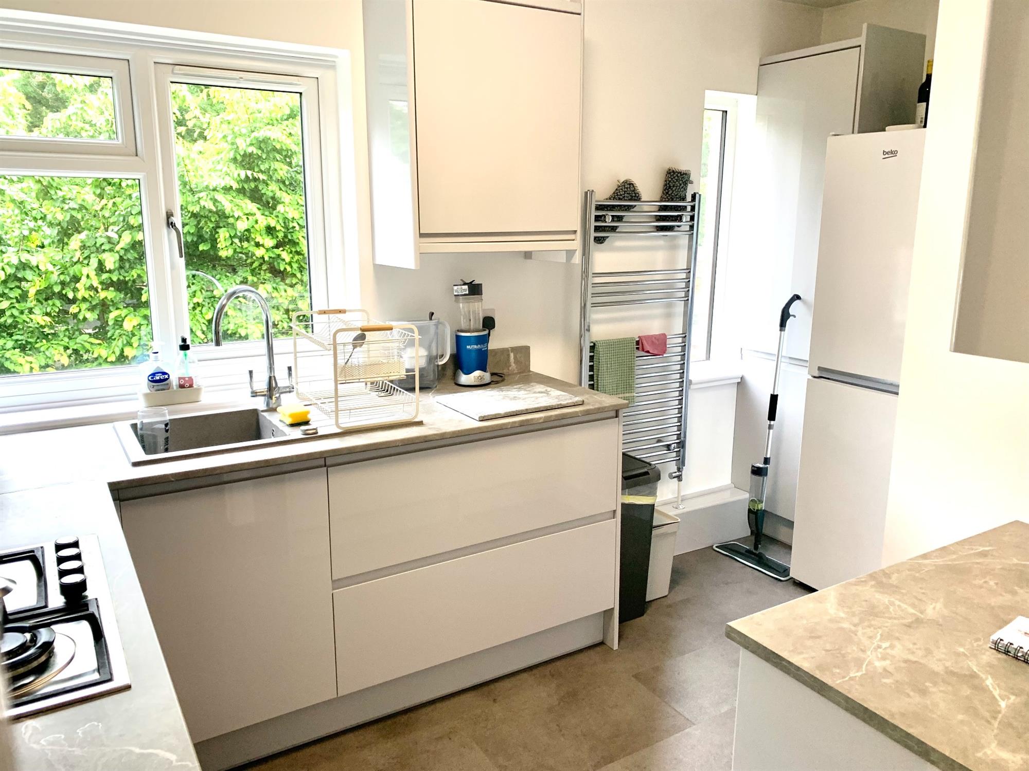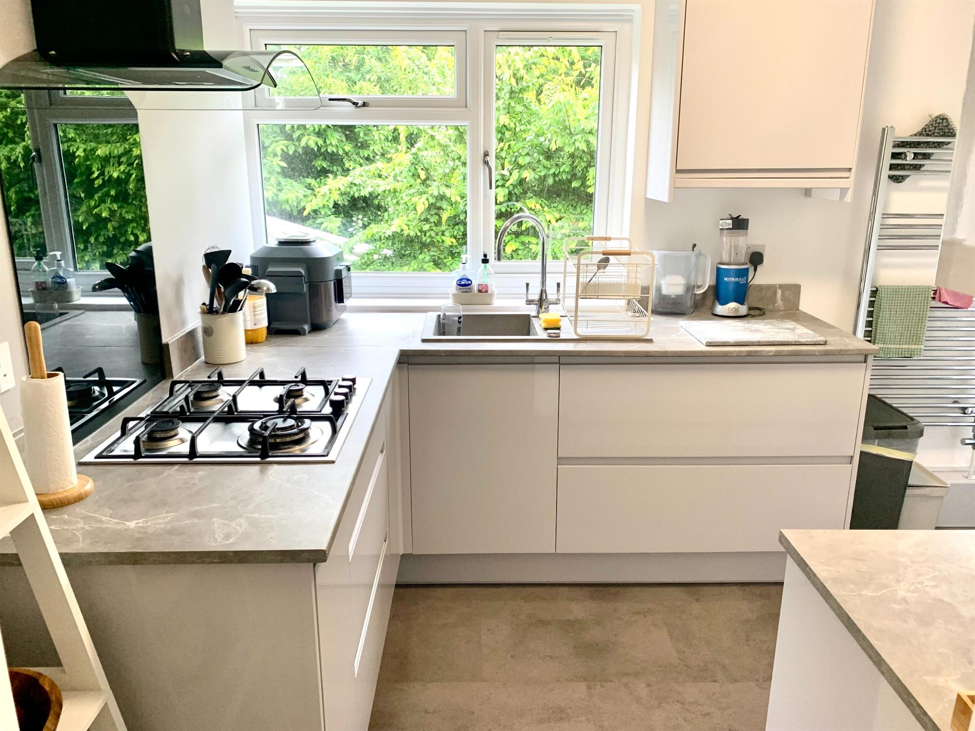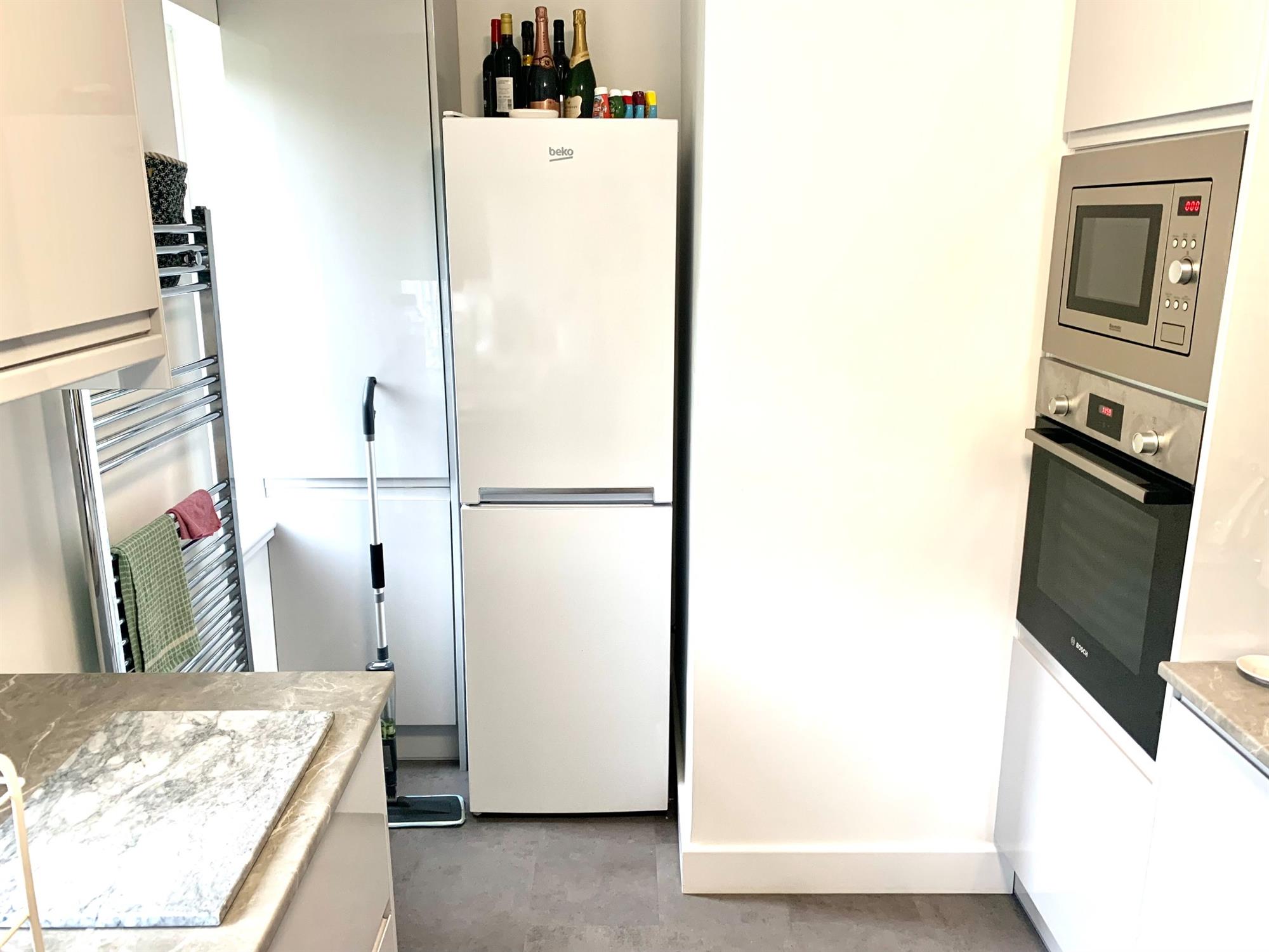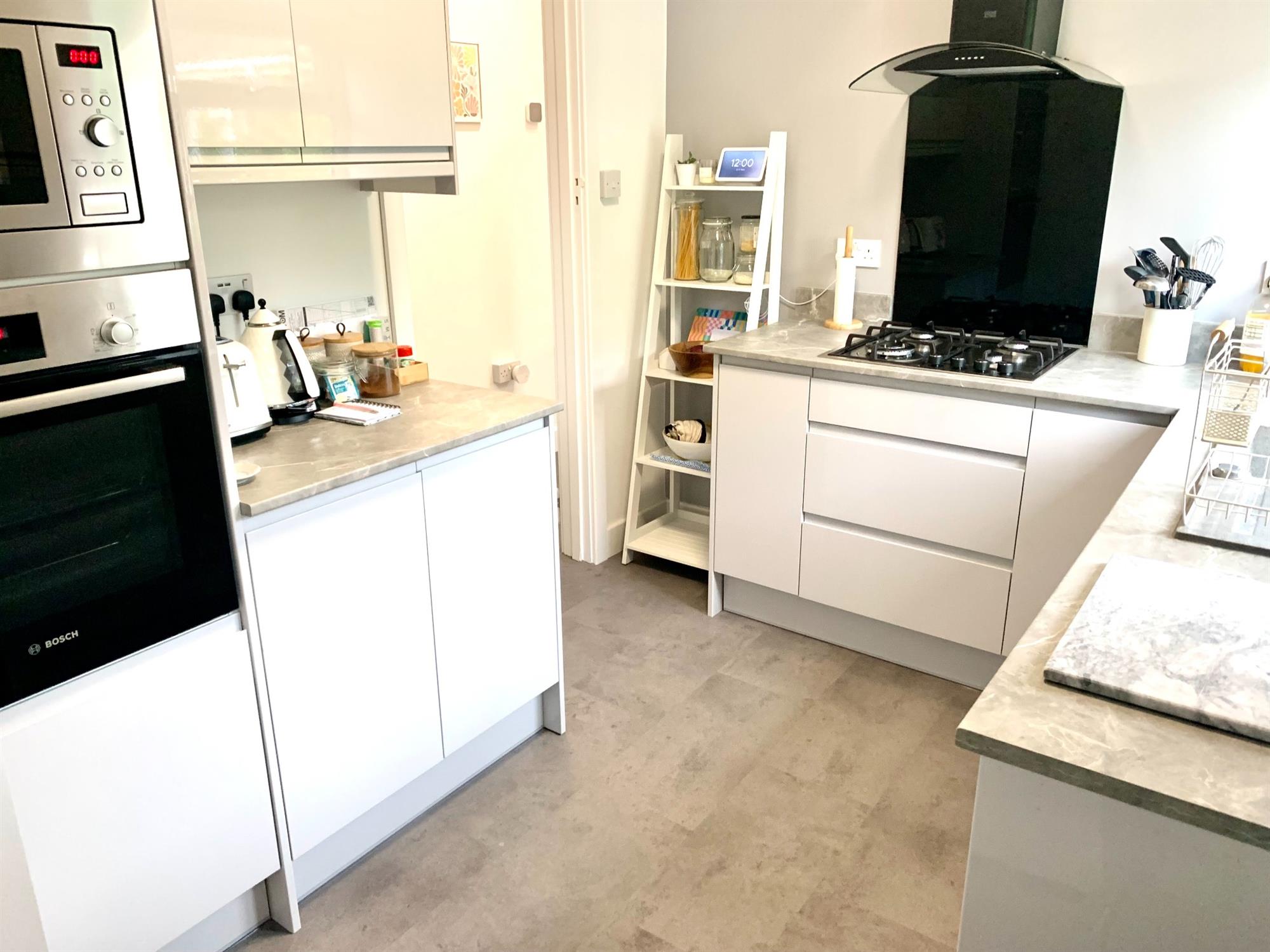 Modern white wall and base units. Window to rear. Appliances to include: Fridge/freezer, gas hob, electric oven and built in microwave.