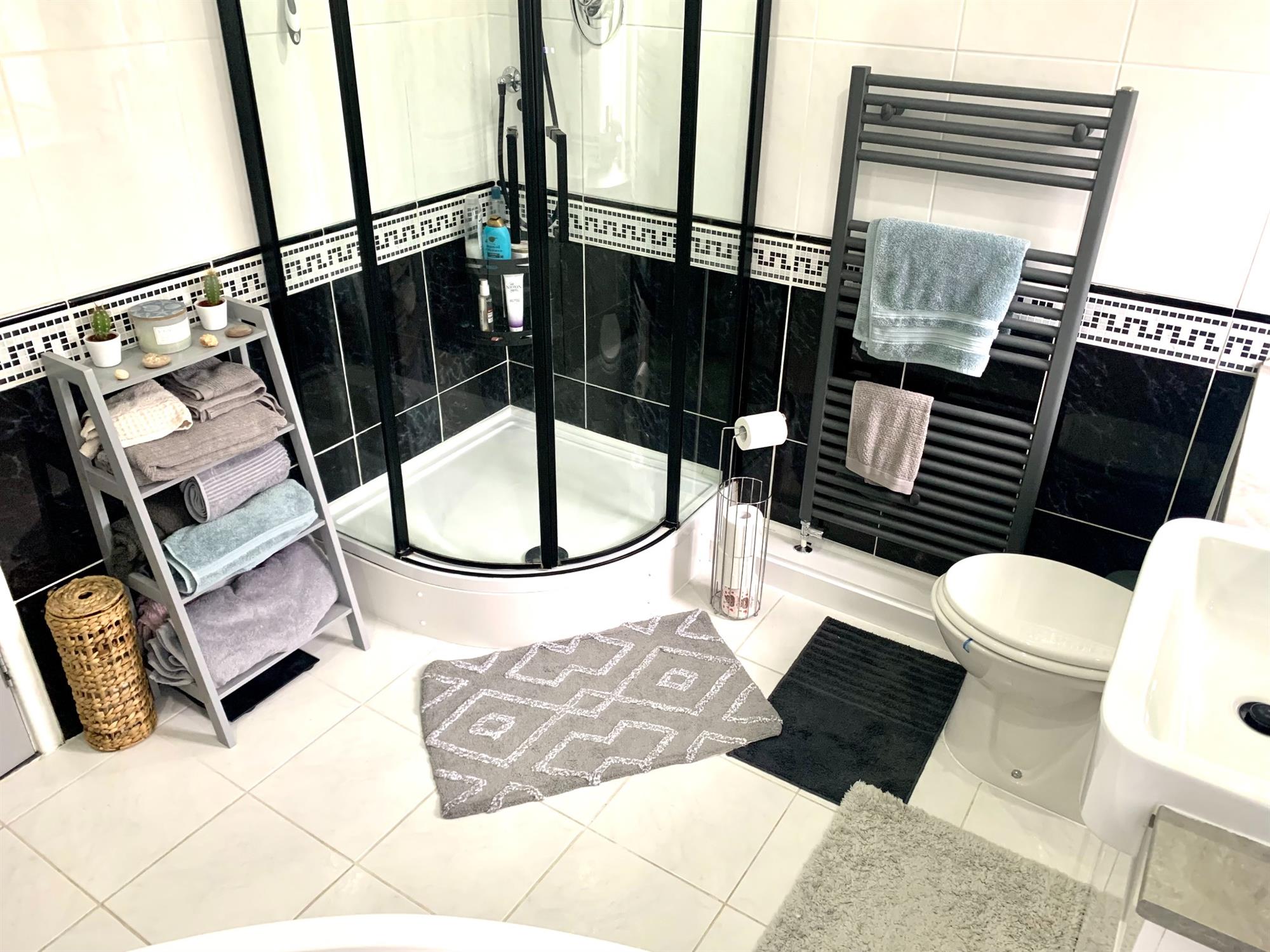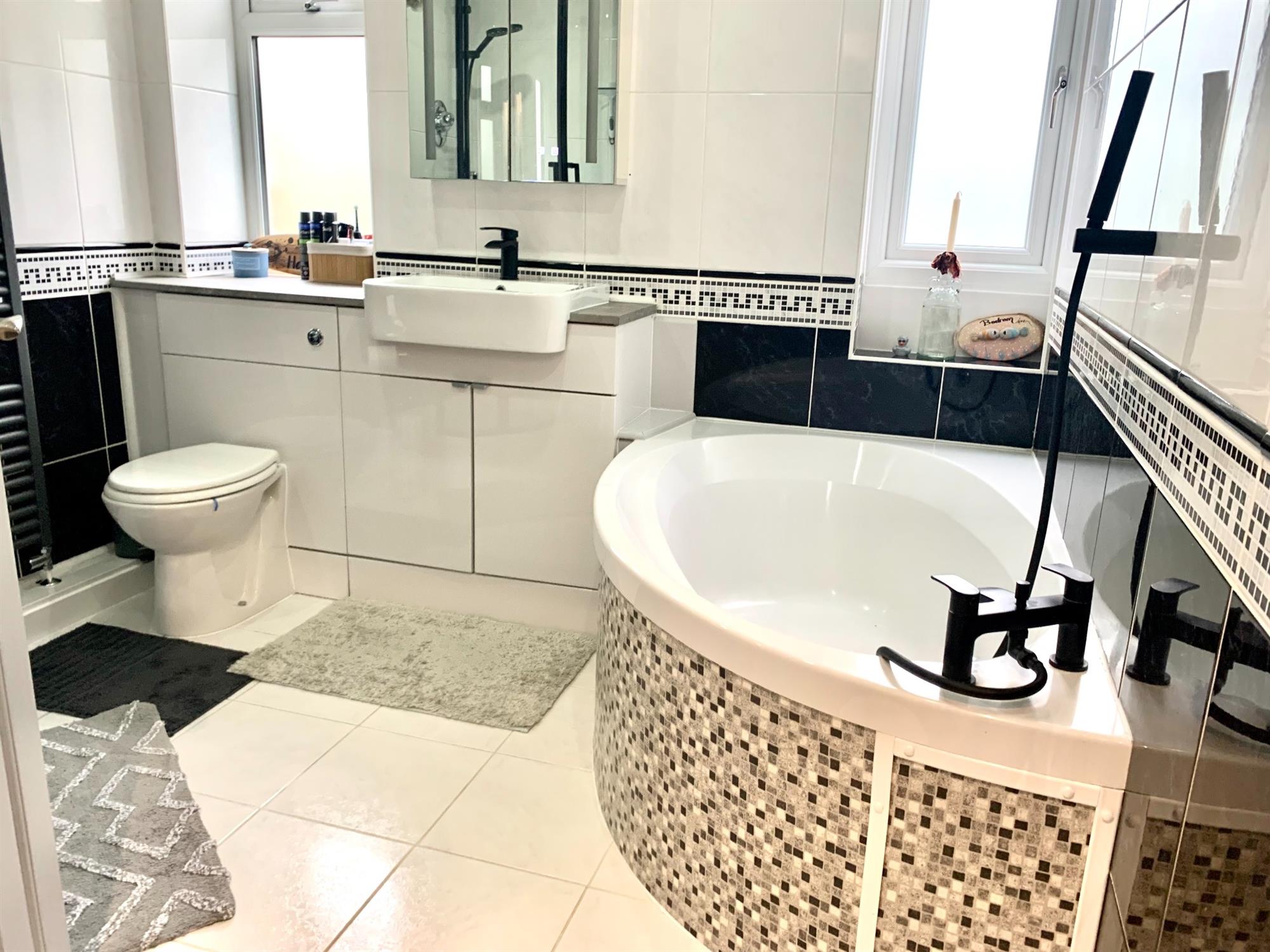White suite 4 piece bathroom with 2 windows to rear and consisting of corner bath with handheld shower attachment, corner shower cubicle and toilet and sink set in vanity units.
