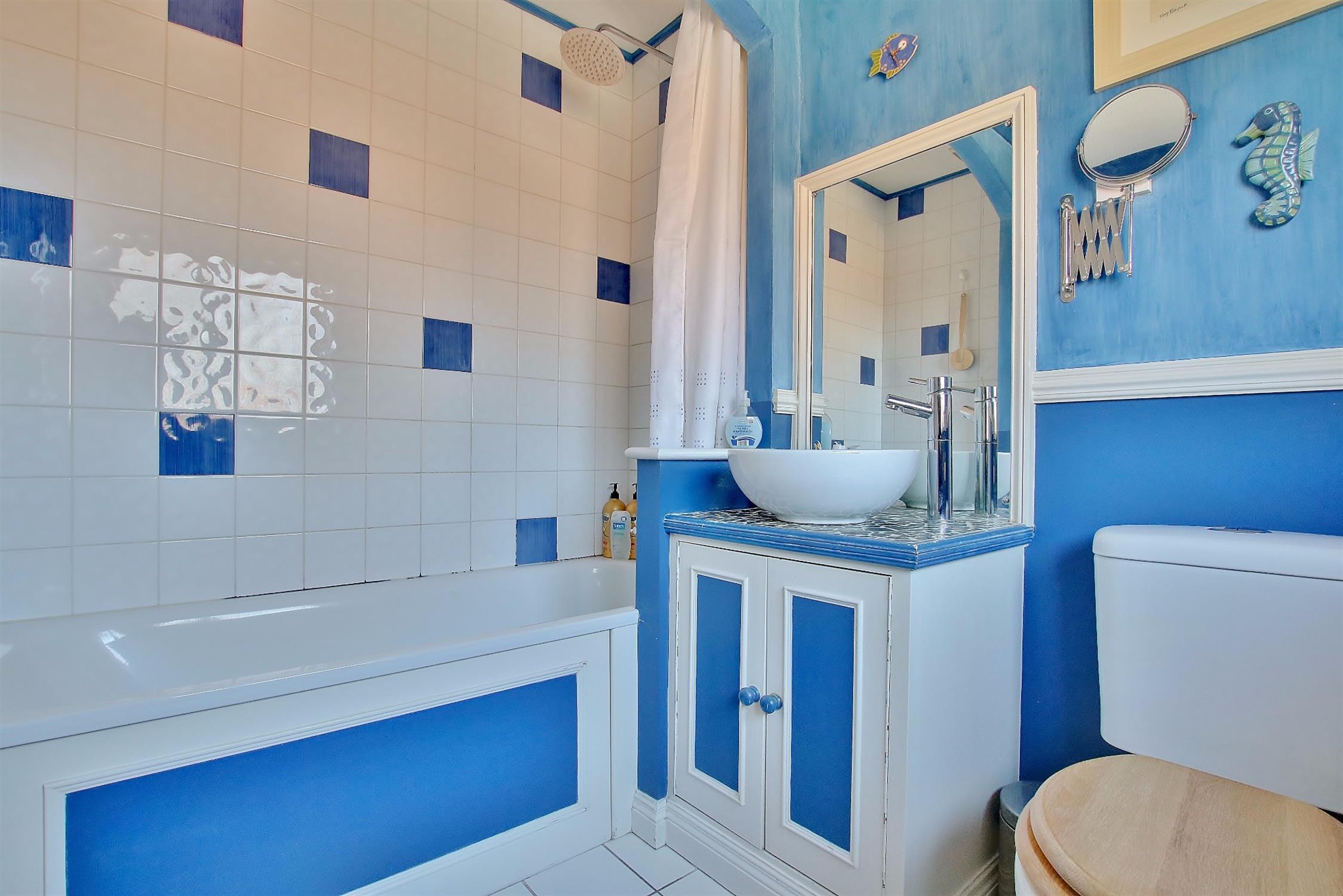 Panelled bath with rainforest shower attachment. WC. Ceramic sink. Tiled floor. Radiator. Frosted window.