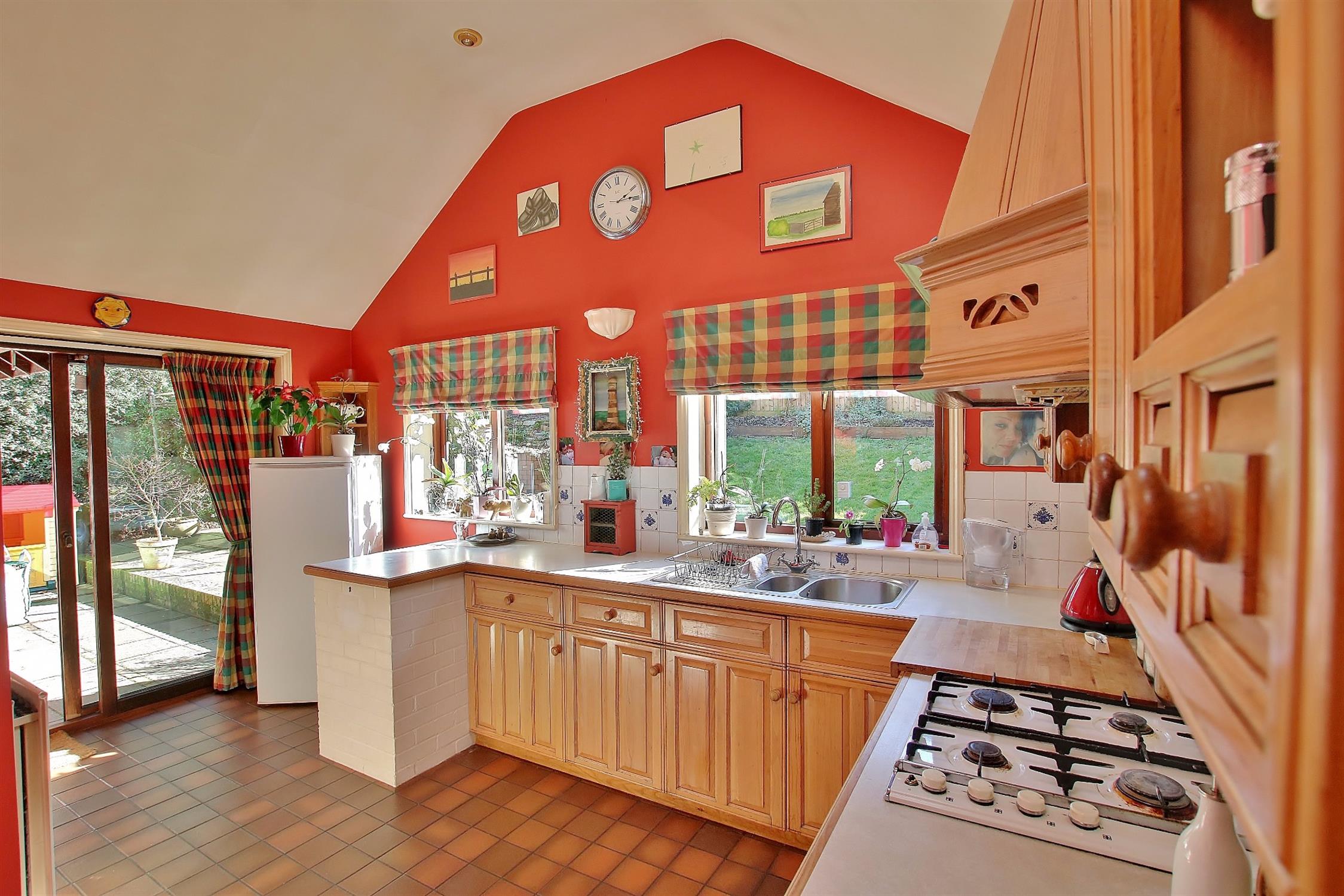 A range of wall and base cupboards with work surfaces over. Breakfast bar. Inset one and a half stainless steel sink unit with drainer. Four ring gas hob with extractor fan. Radiator. Tiled floor. Sliding doors leading into the garden. Two Velux and windows looking into the garden.