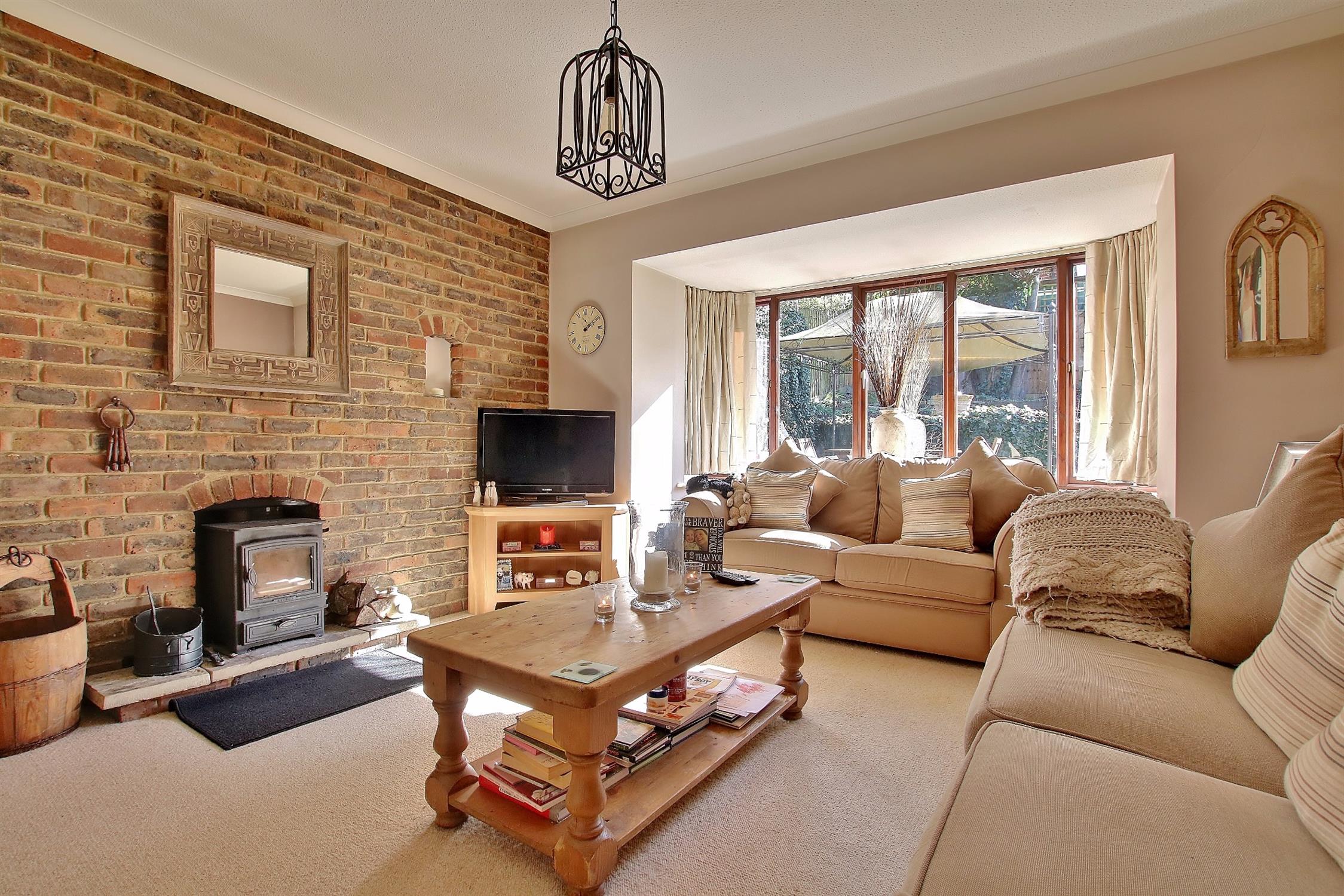 Attractive exposed brick feature wall. Wood burning stove. Fitted carpet. Radiator. Window with views into the garden.