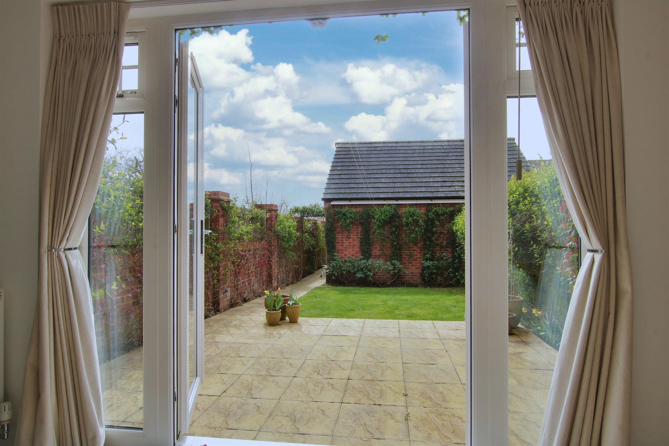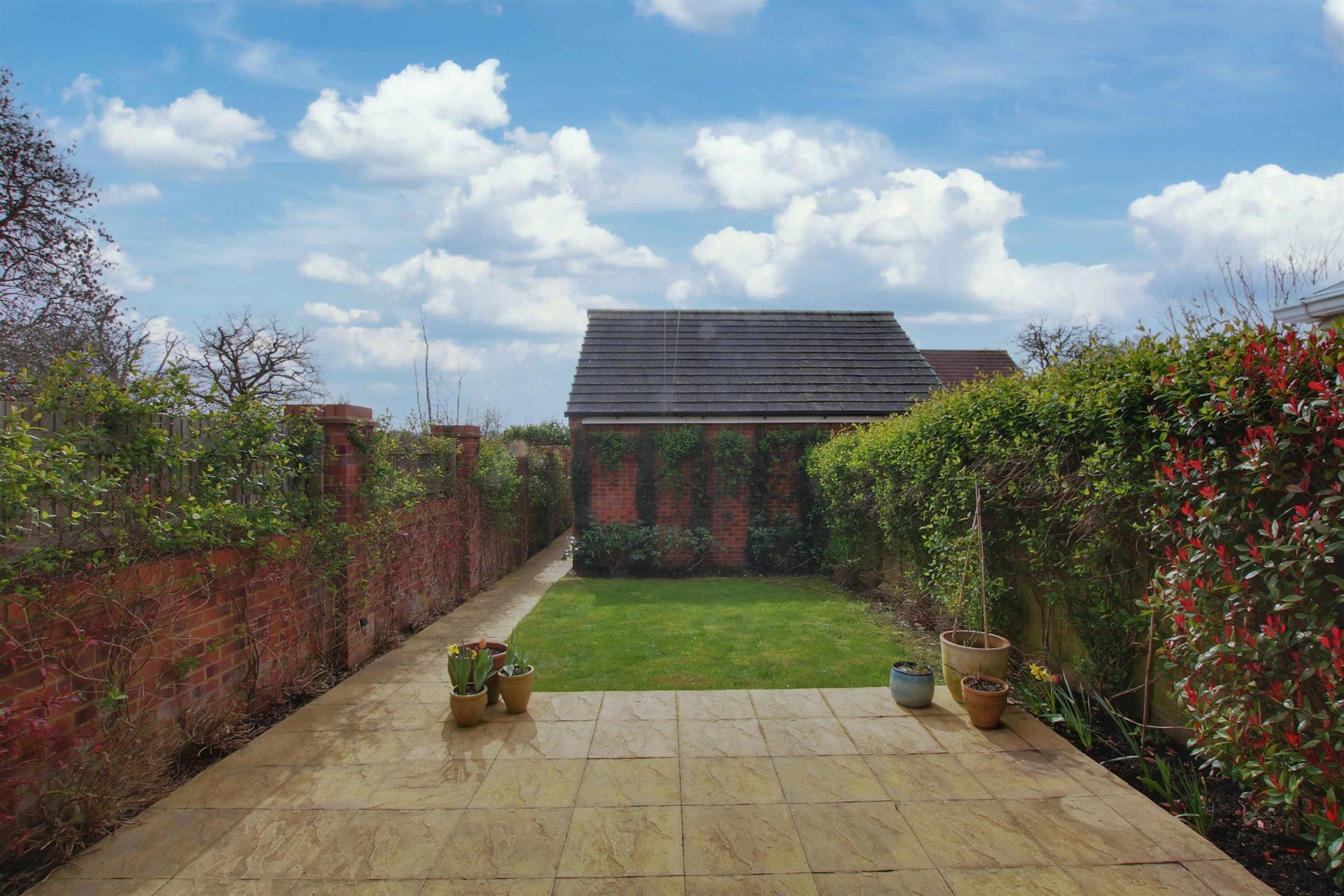 To the rear is a private south-facing garden neatly laid to lawn with some flowers and shrubs, climbing plants, and sun-terrace ideal for barbecues and al-fresco dining. A path provides access to the large garage at the rear which has power and light, loft storage, up-and-over door, and a tandem parking space. The front garden is laid to lawn and enclosed by mature hedging and shrubs.
