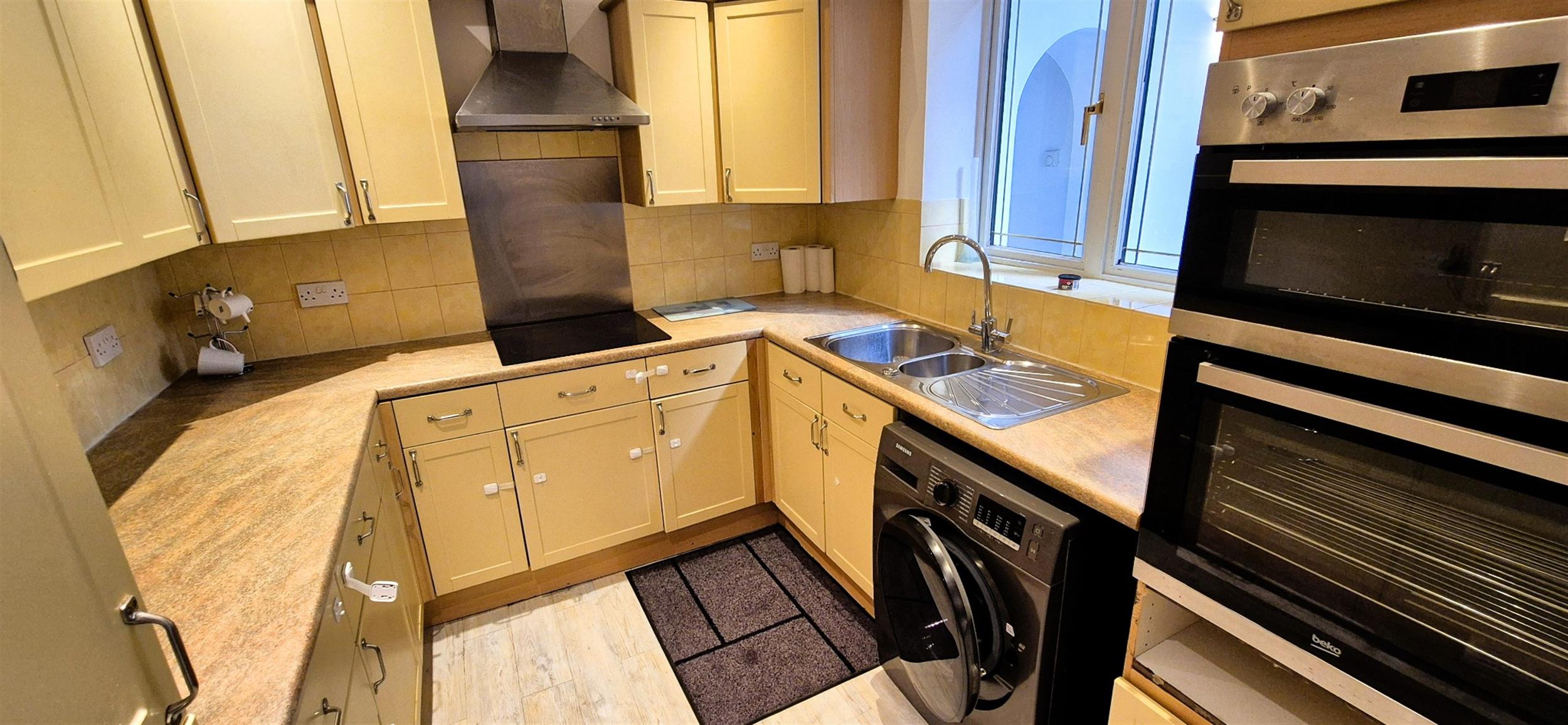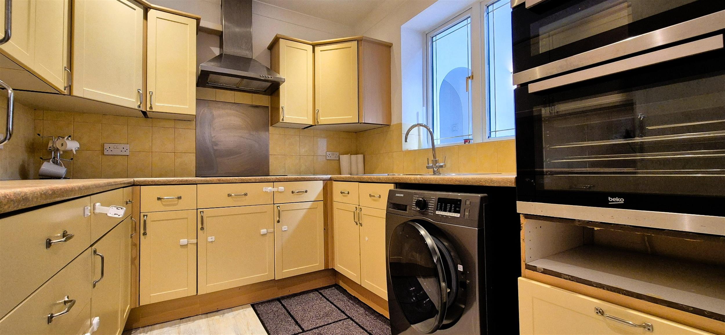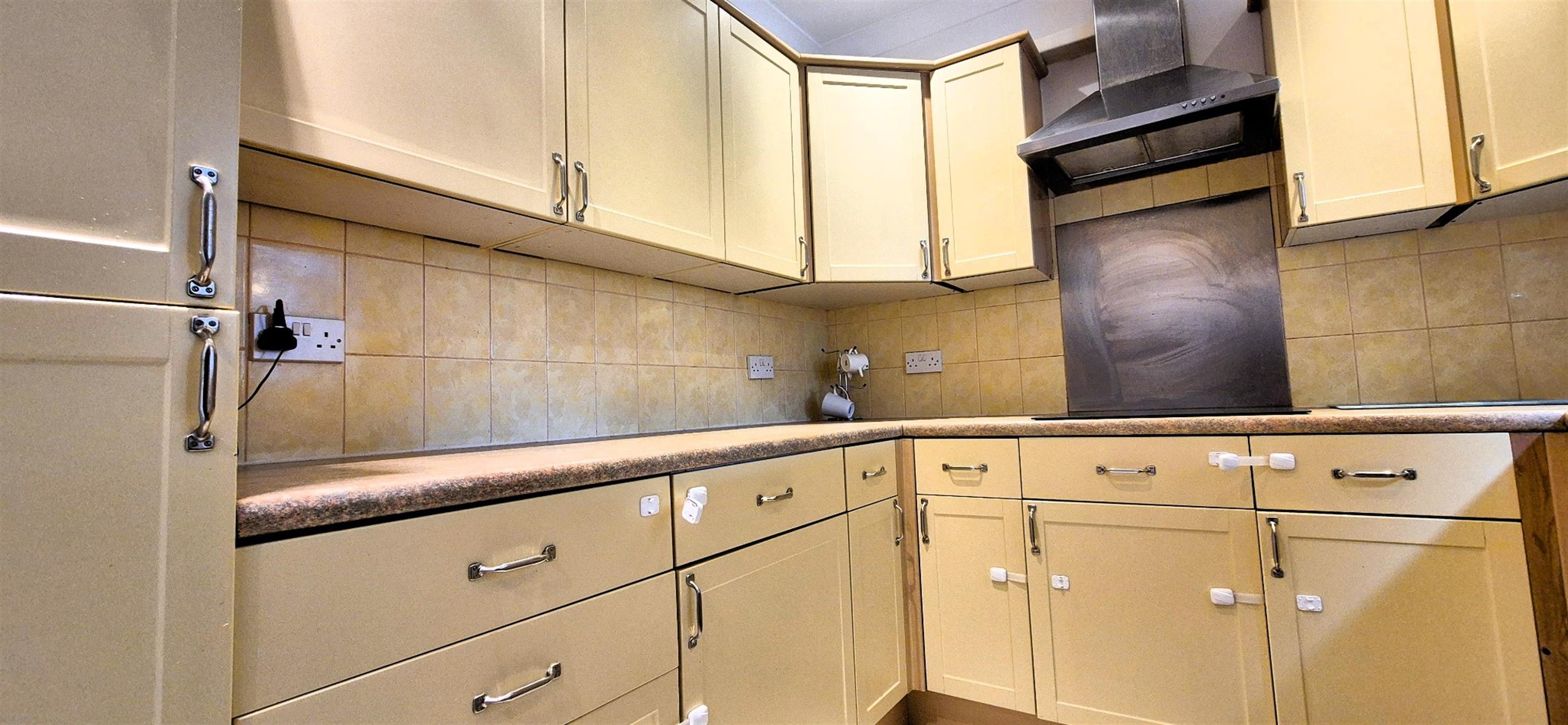 KITCHENRoom with ample base unit space, electric hob, oven, sink and fridge/freezer.
